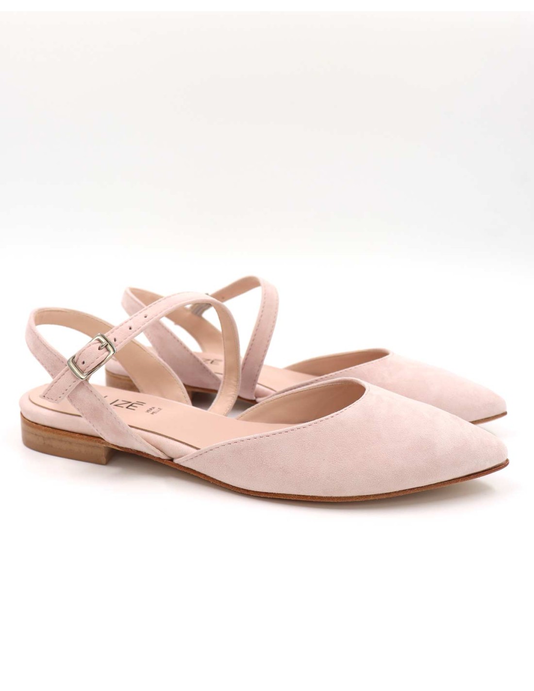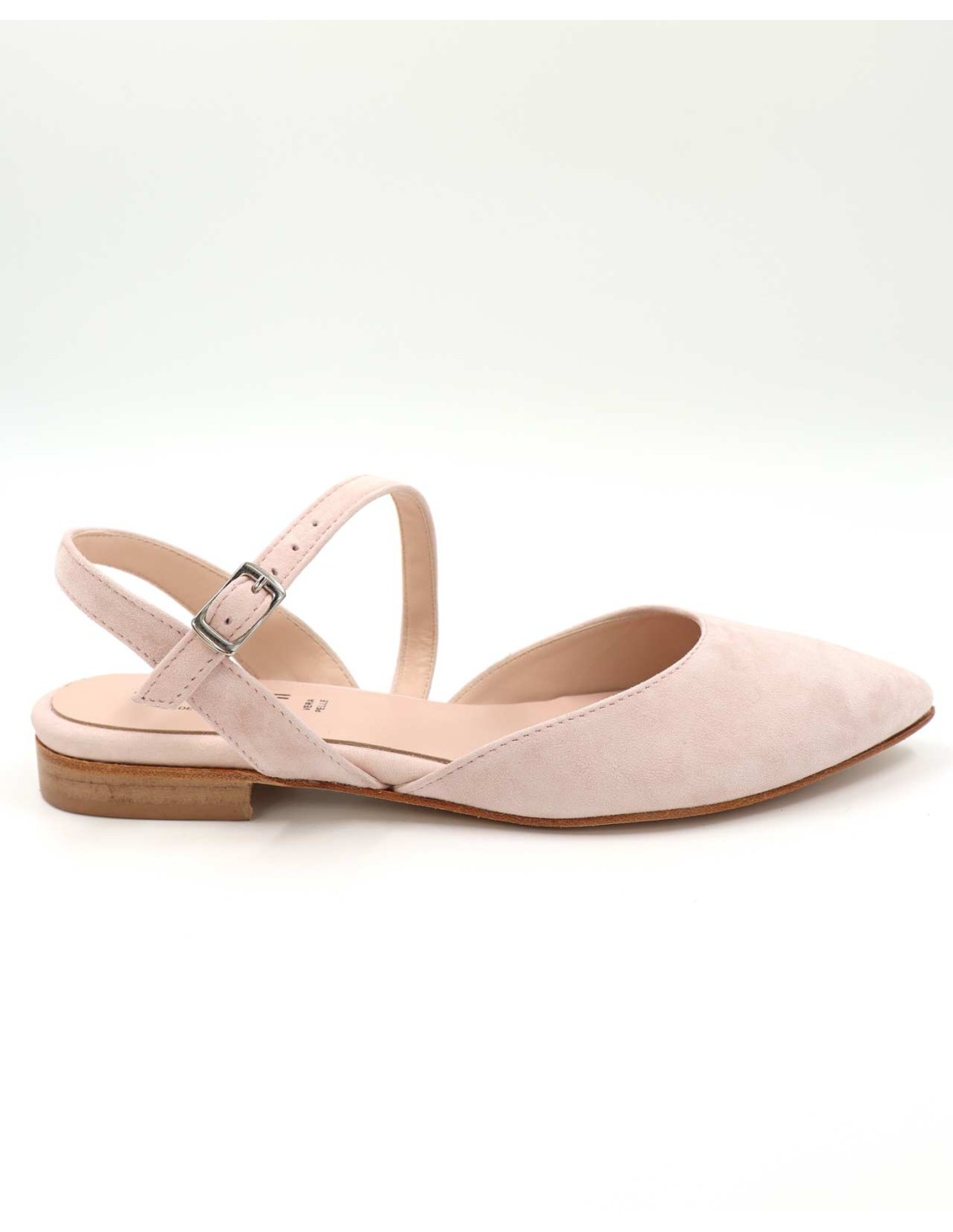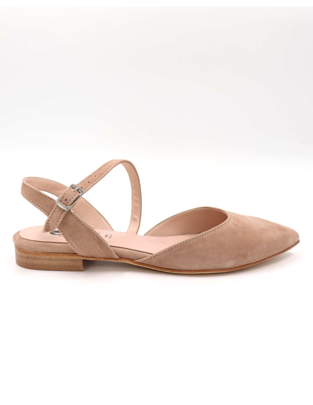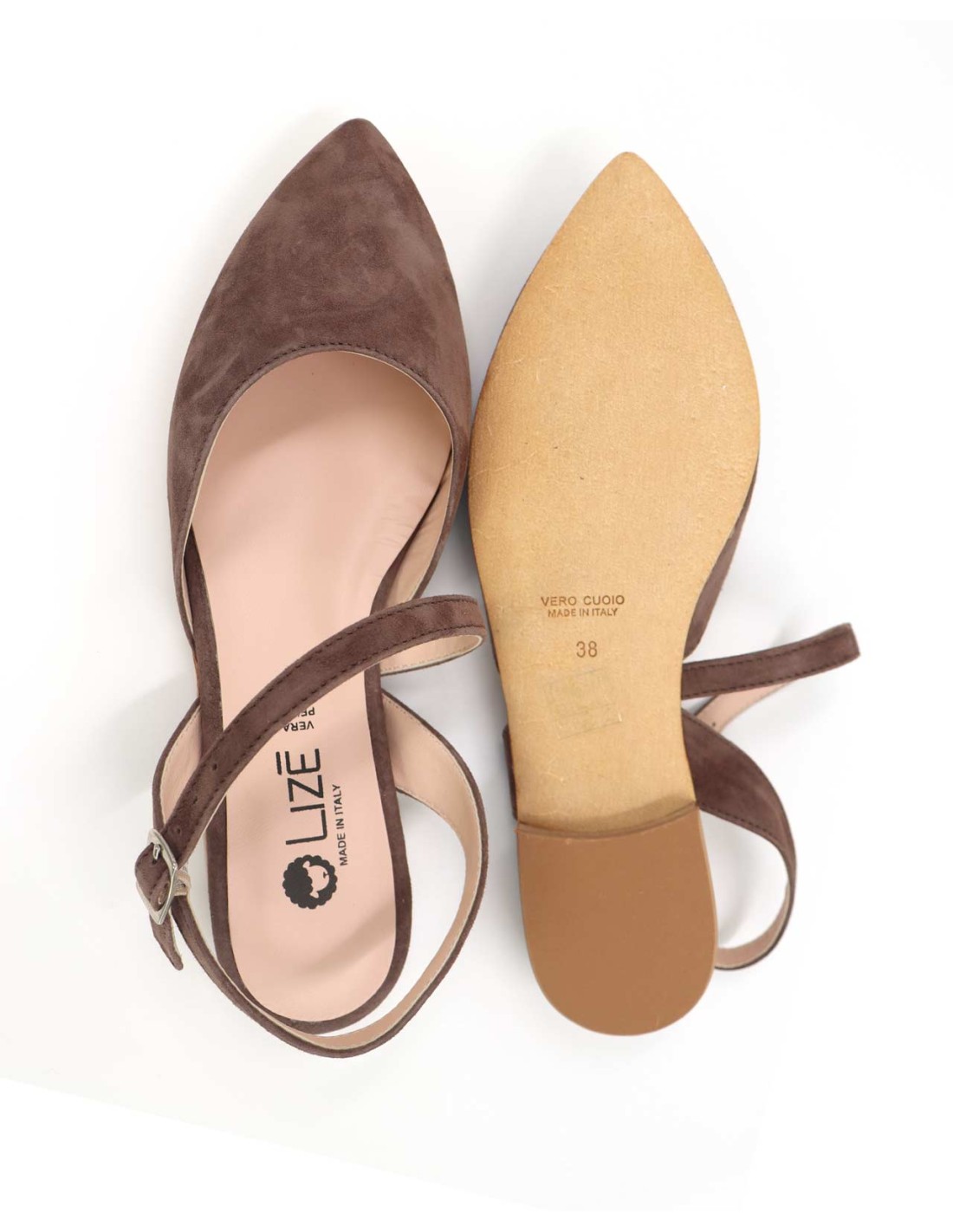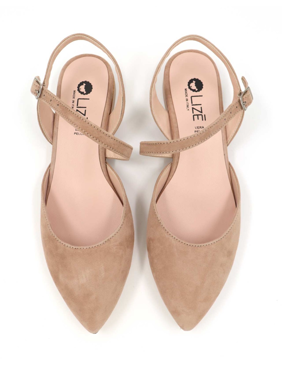 Deliziosa scarpetta Slingback a punta in pelle scamosciata con sottopiede super soft in pelle e suola in cuoio. Una scarpa senza plastica e senza gomma prodotta artigianalmente in Italia.