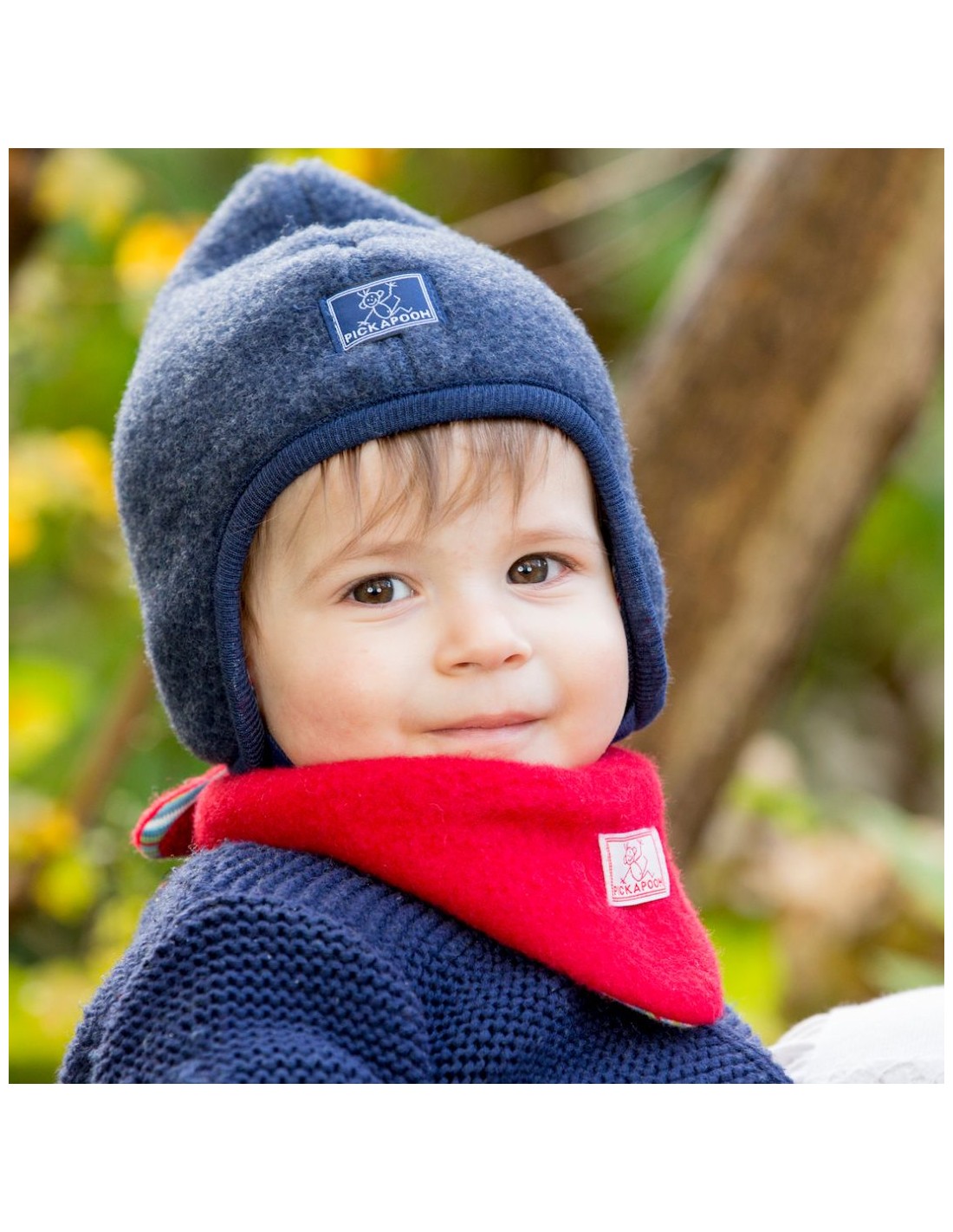Morbido, caldo e anallergico berretto bimbi reversibile dalla forma a punta realizzato in Pile di Lana Merino con interno in Cotone Biologico.