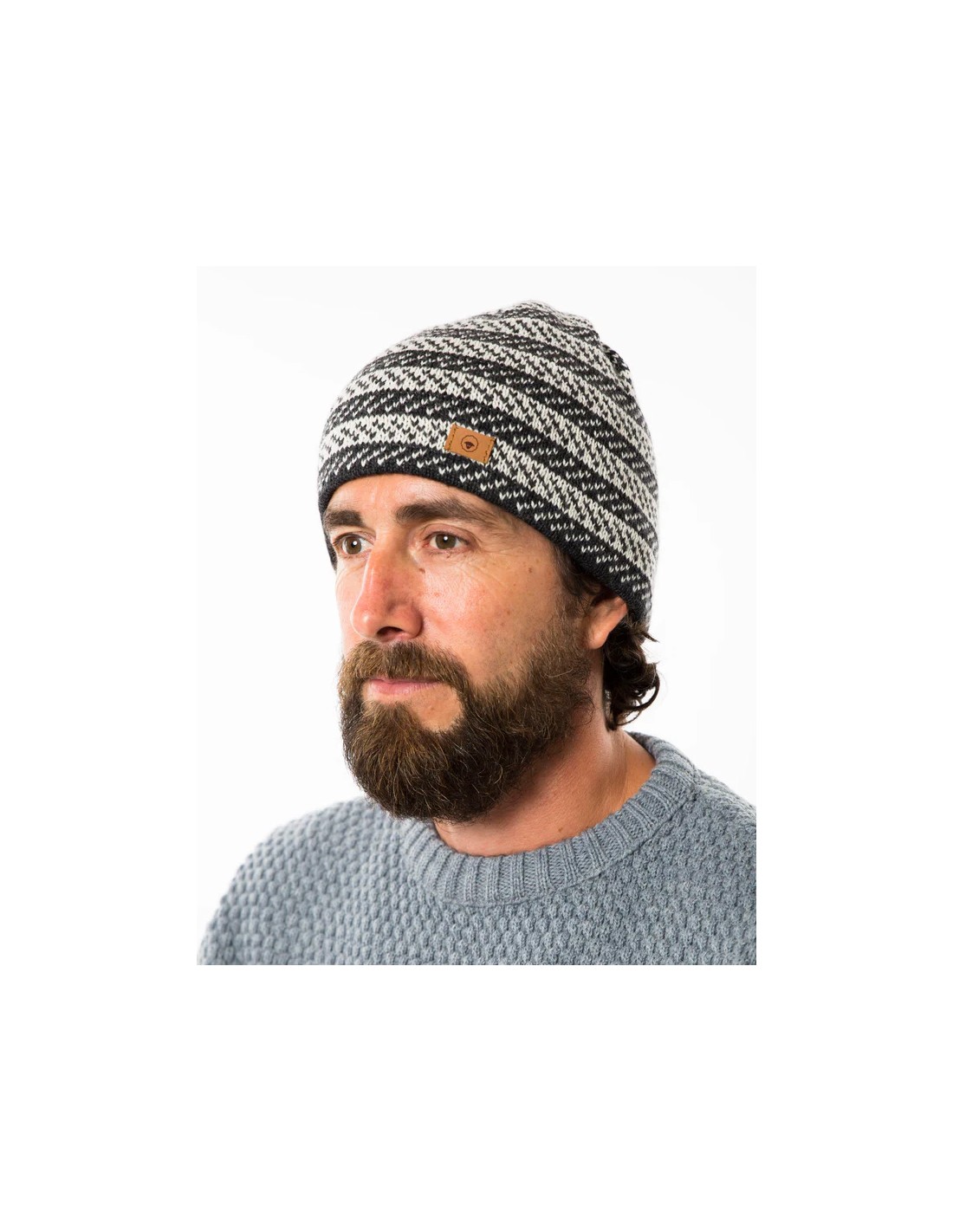 Berretto Unisex lavorato a maglia jacquard a doppio strato realizzato in morbidissima lana merino mulesing free certificata Oeko-Tex da 23 micron. Berretto lavorato a maglia su telaio manuale a mano ed è reversibile in modo da poter utilizzare entrambi i lati, un lato con disegno nordico e l'altro in tinta unita antracite.