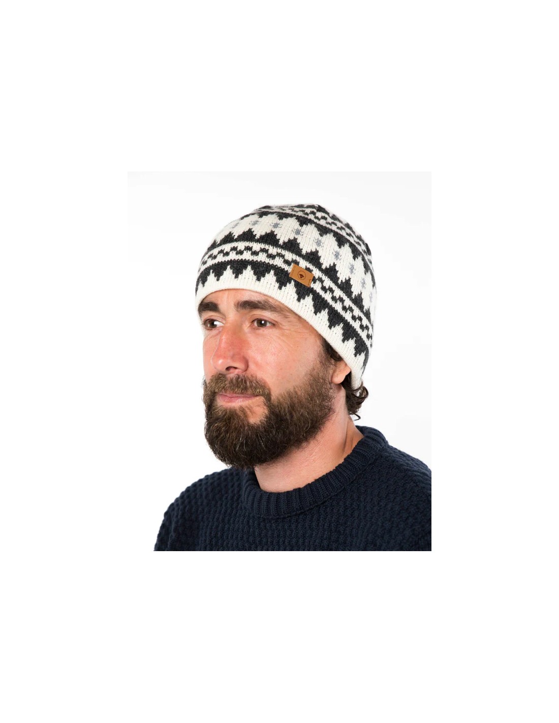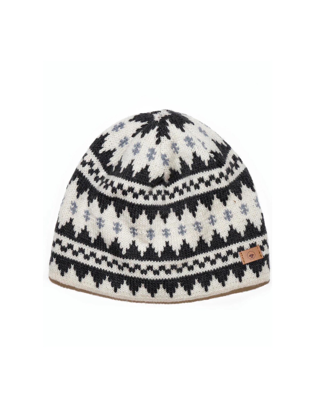 Berretto Unisex lavorato a maglia jacquard a doppio strato realizzato in morbidissima lana merino mulesing free certificata Oeko-Tex da 23 micron. Berretto lavorato a maglia su telaio manuale a mano ed è reversibile in modo da poter utilizzare entrambi i lati, un lato con disegno nordico e l'altro in tinta unita bianco.