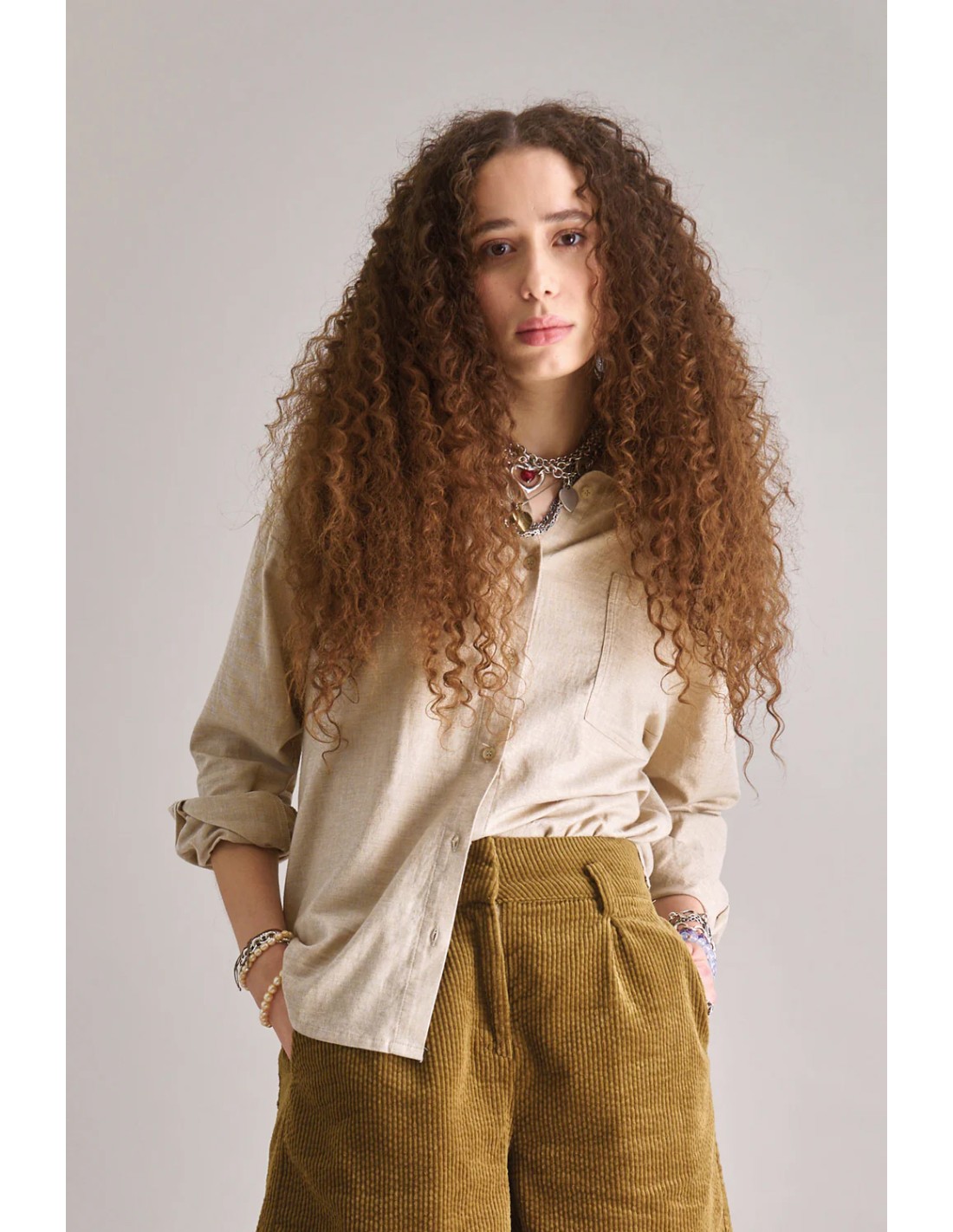 Camicia in 100% cotone biologico, morbida, naturale e molto piacevole sulla pelle. Colore sabbia versatile e finitura soffice. Perfetta da sola o come strato leggero sotto a pull o cardigan.