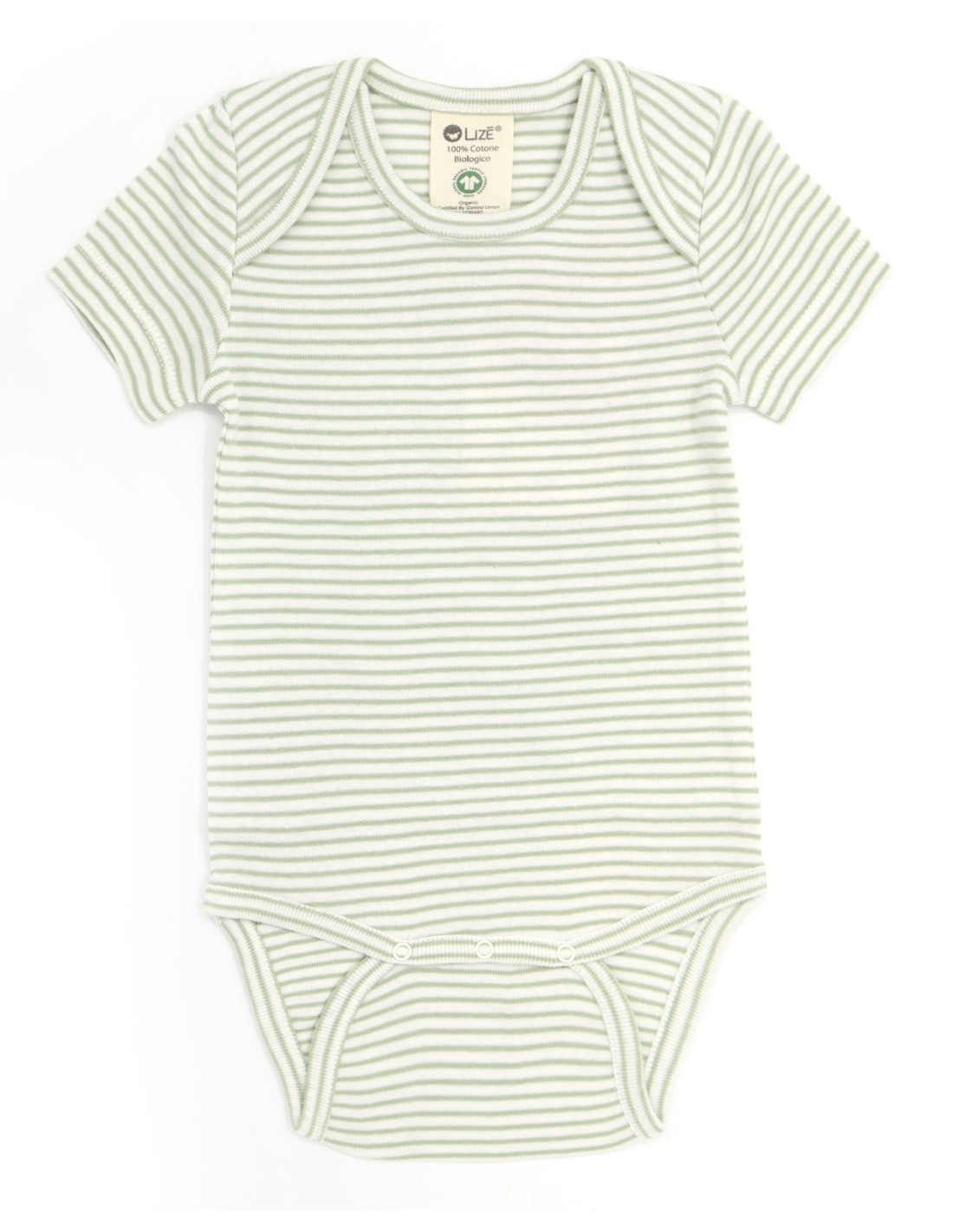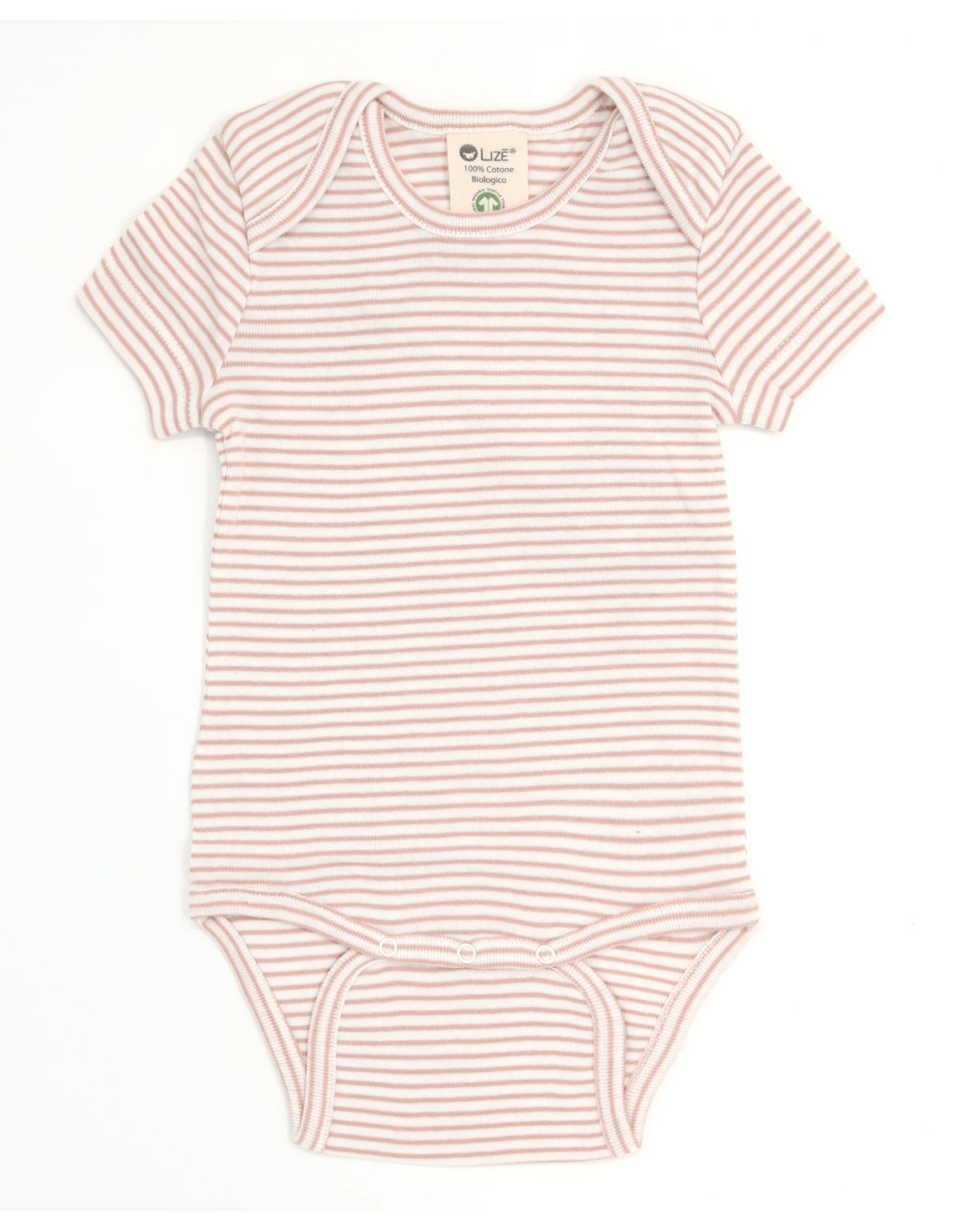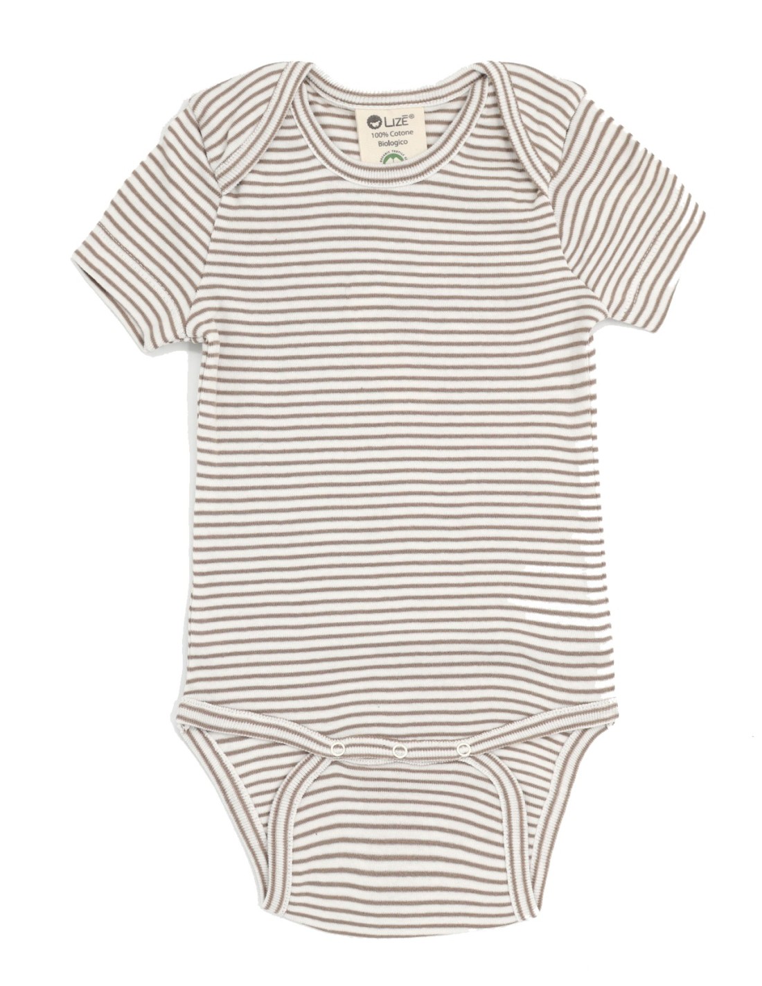 Morbidissimo Body baby a maniche corte realizzato in 100% Cotone Biologico Gots e Fairtrade con fantasia a righe.