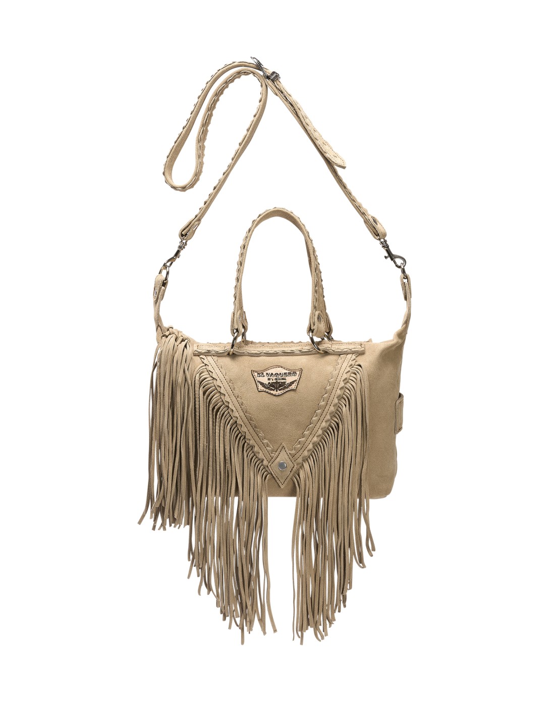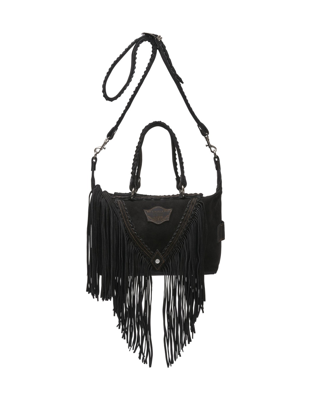 Il design compatto ma sorprendentemente capiente la rende perfetta per l’uso quotidiano, mentre le lunghe frange laterali, i dettagli in pelle lavorata e gli inserti metallici aggiungono un tocco di carattere e autenticità.