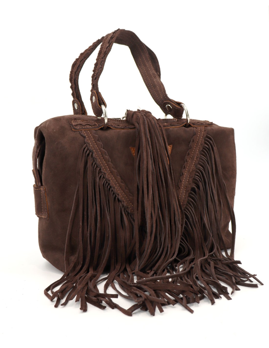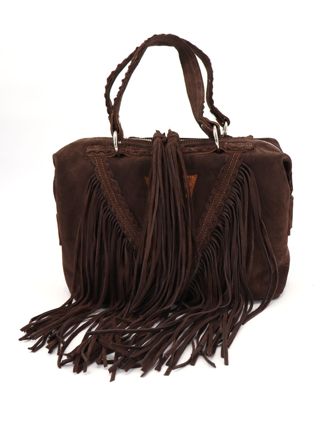 Borsa artigianale in pelle scamosciata con frange, realizzata interamente a mano in Italia da maestri artigiani.