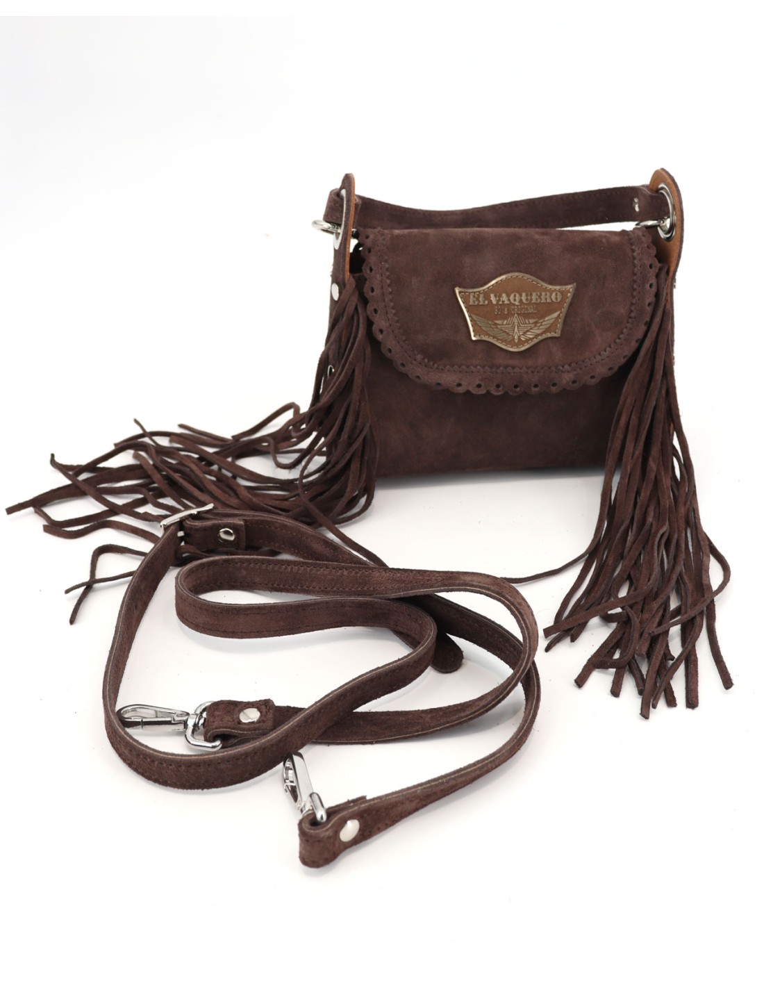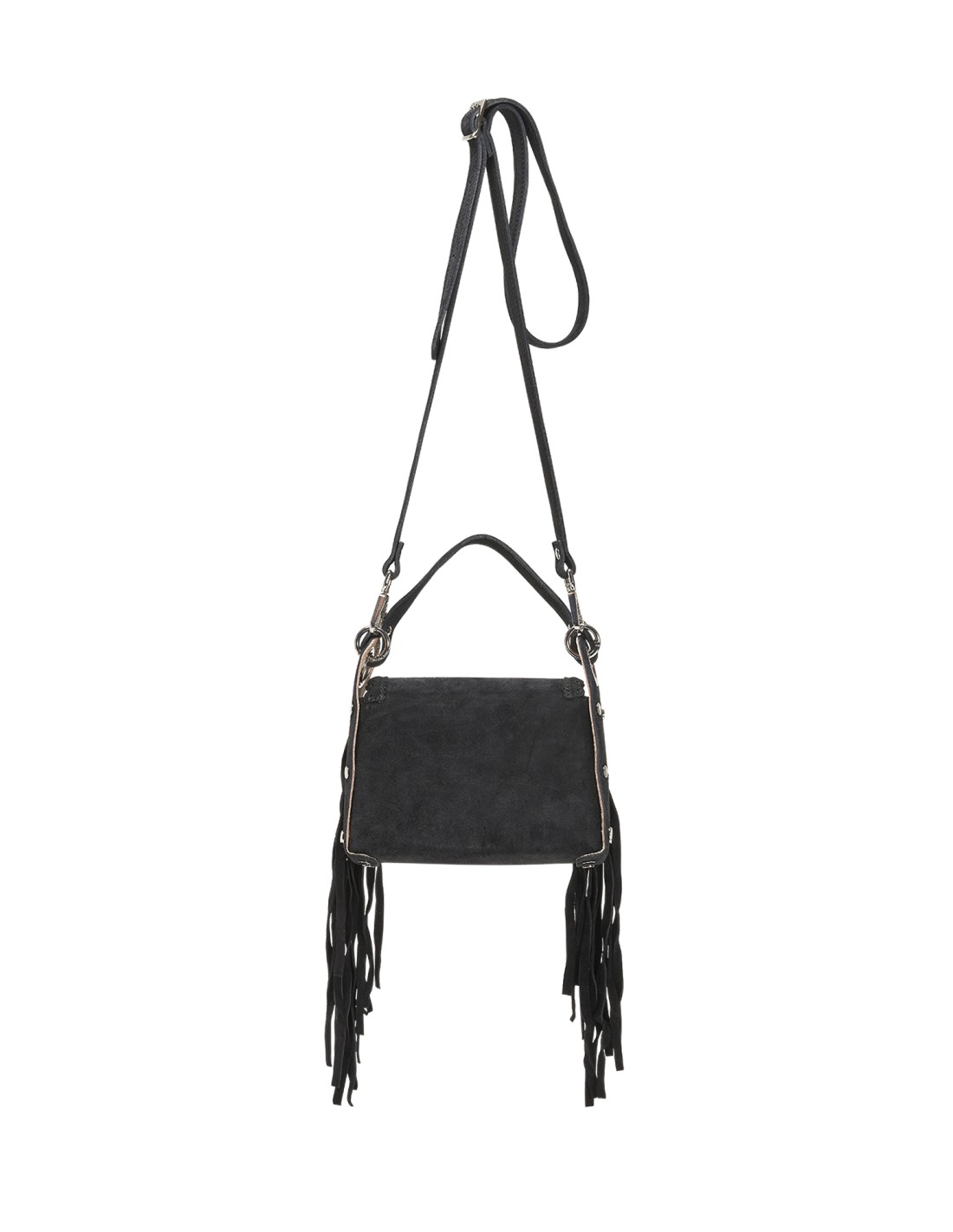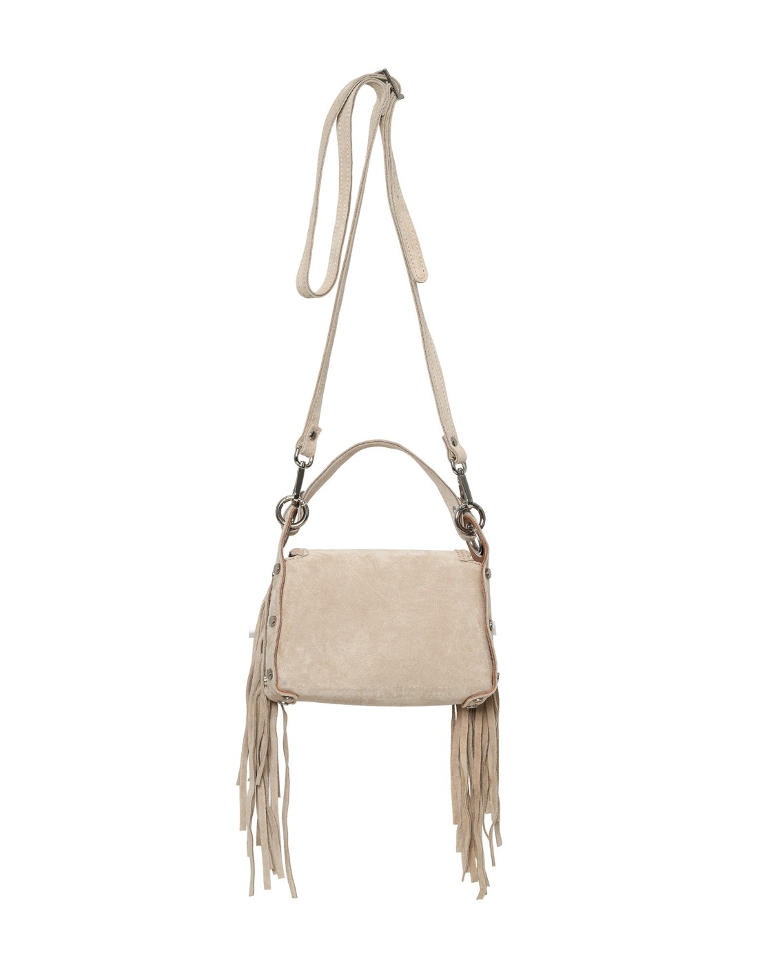 Realizzata a mano in Italia con pellami naturali di altissima qualità, unisce la morbidezza della pelle scamosciata alla leggerezza delle frange e alla luminosità dei dettagli metallici, creando un accessorio dal fascino boho e contemporaneo.