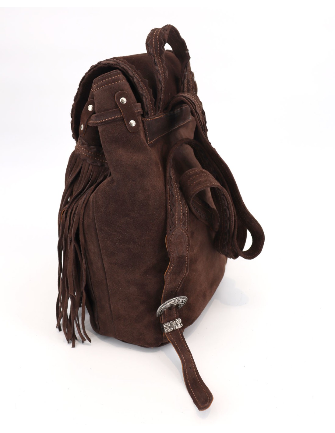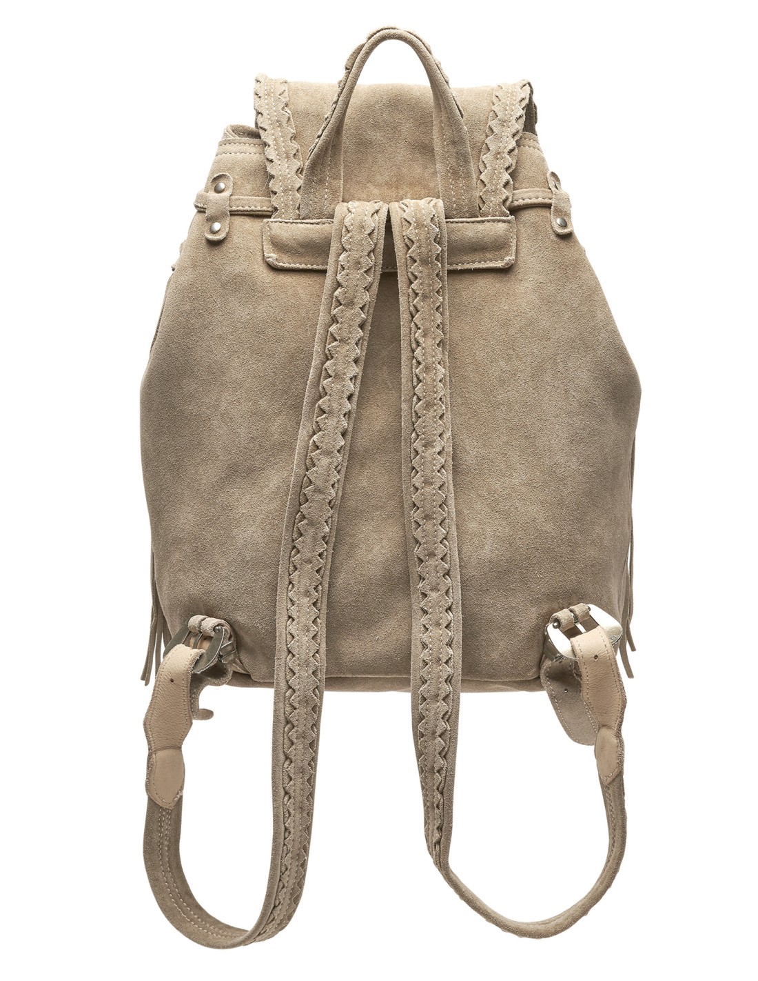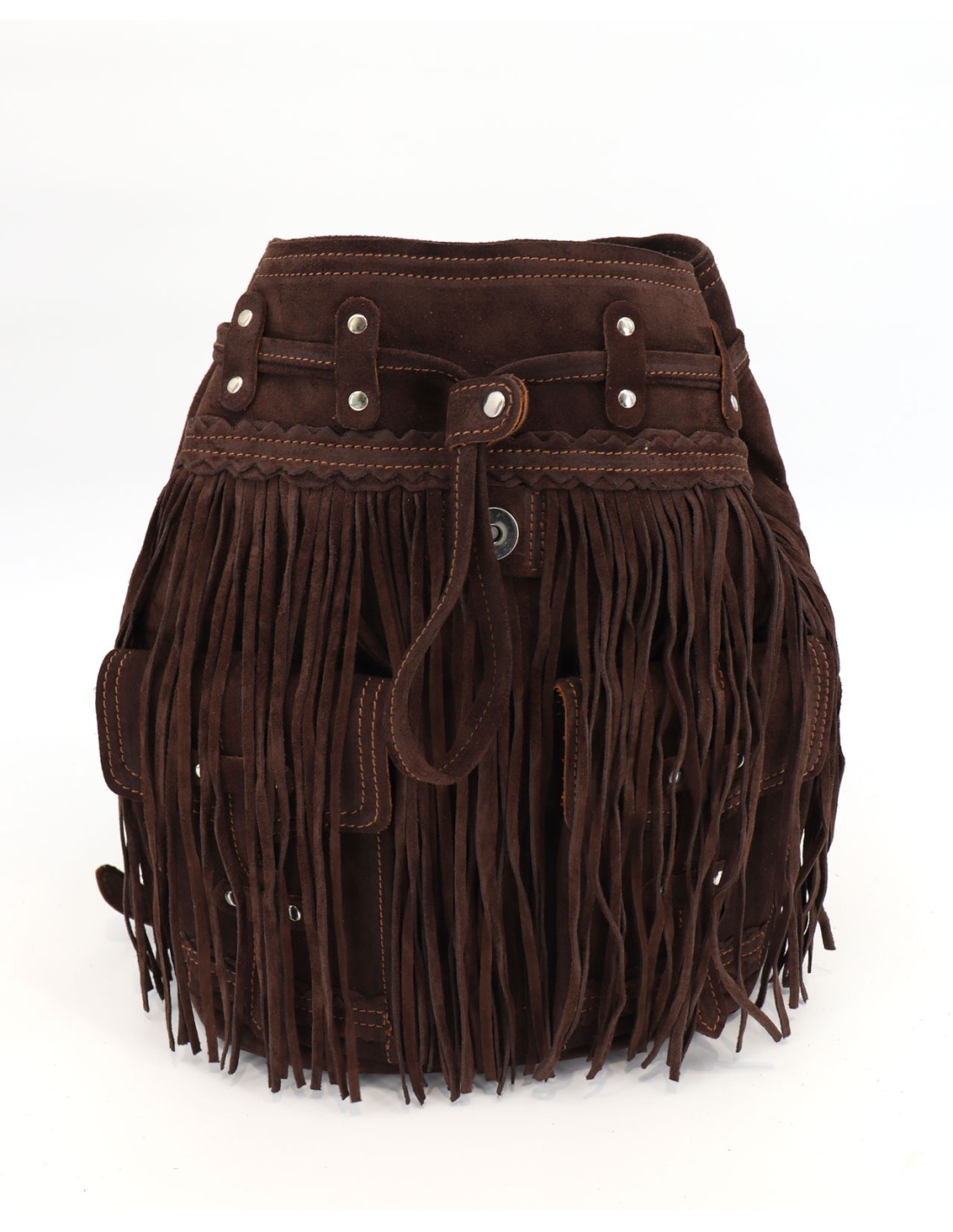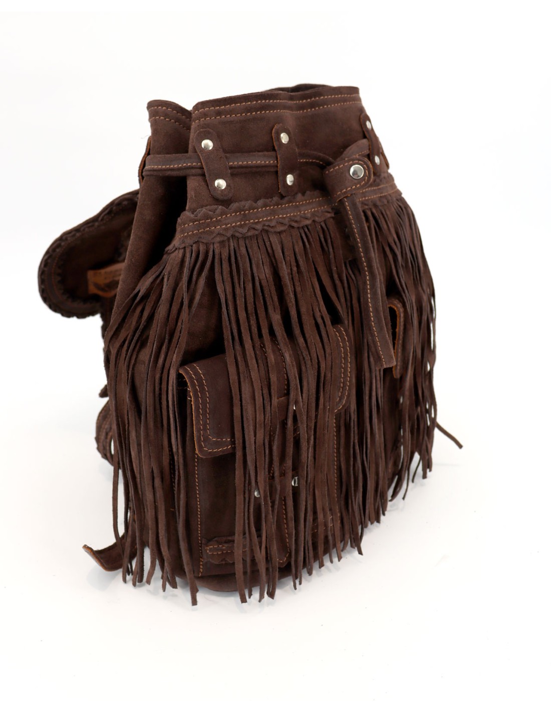 Zaino artigianale in morbida pelle scamosciata di vitello, arricchito da lunghe frange, tasche frontali e dettagli metallici. Dimensioni 33x24x13. Rifinito con l’esclusivo trattamento d’invecchiamento Silverstone, che dona alla pelle scamosciata affascinanti sfumature e variazioni cromatiche, rendendo ogni pezzo unico nel suo genere. Realizzato a mano in Italia.