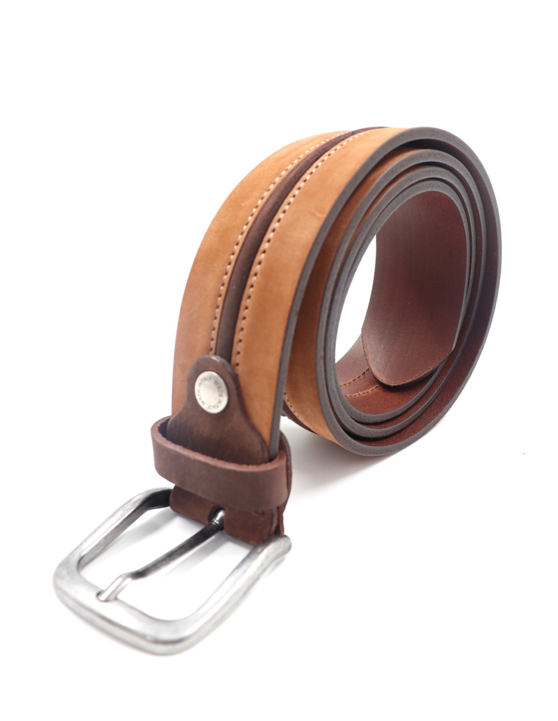Cintura uomo bicolor in pelle suede a concia vegetale con profilo e cuciture in contrasto. La pelle è vera, naturale, conciata al vegetale senza nichel né cromo: viva, morbida al tatto e destinata a diventare sempre più bella con l’uso.