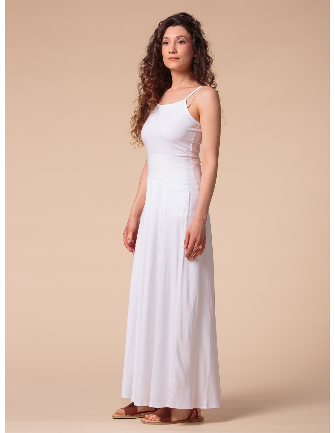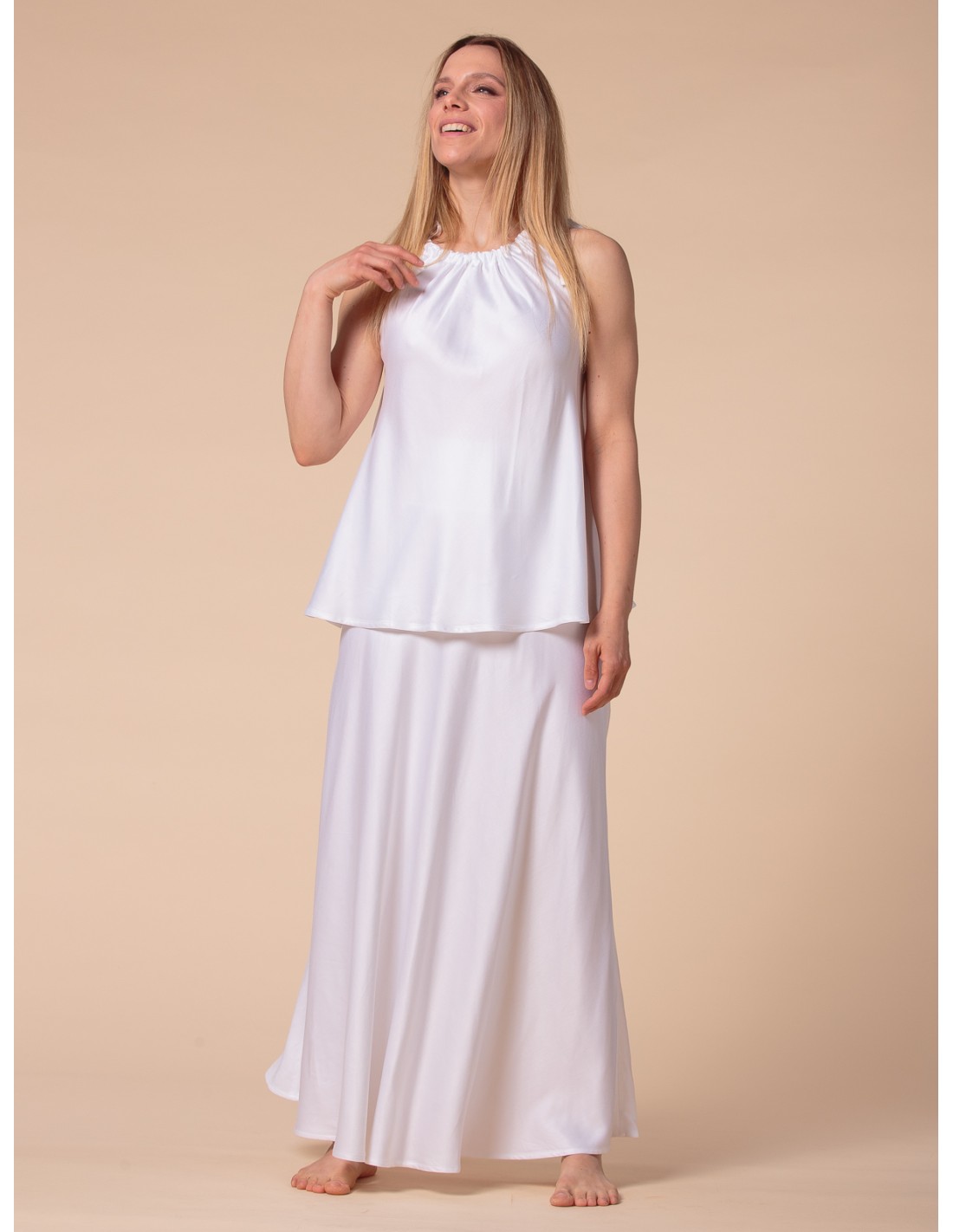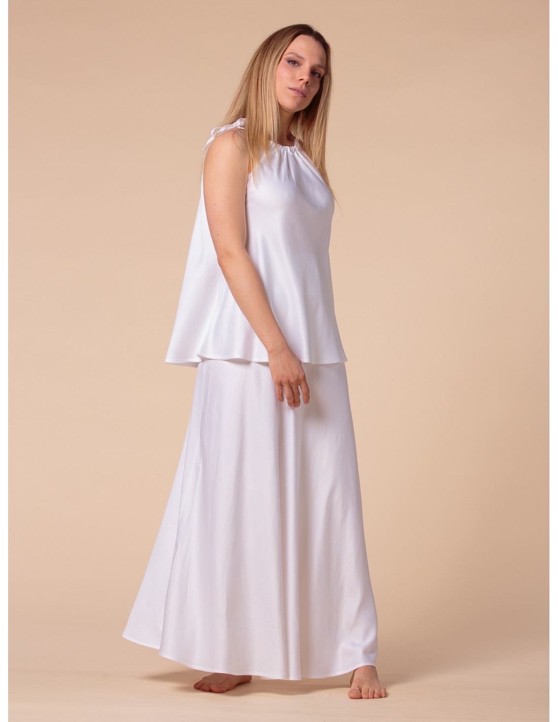 Il tessuto è Satin di 100% bambù, sottile, coprente e incredibilmente liscio, non elasticizzato. Nonostante l'ata coprenza, per evitare ogni minima trasparenza nel bianco, consigliamo di indossare intimo color nude.