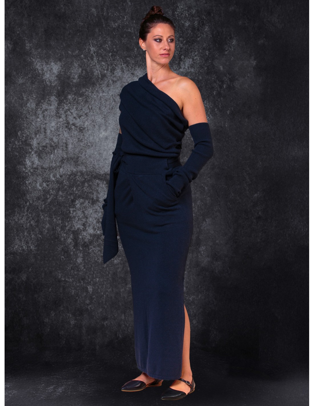 Gonna lunga in lana merino e cashmere con chiusura wrap e due spacchi laterali. Linea dritta e vita alta, elegante e fluida. Si chiude ad incrocio con due lunghe cinture che creano un fiocco asimmetrico sul fronte. Perfetta con la maglia Astral e Luna della collezione Eclypse.