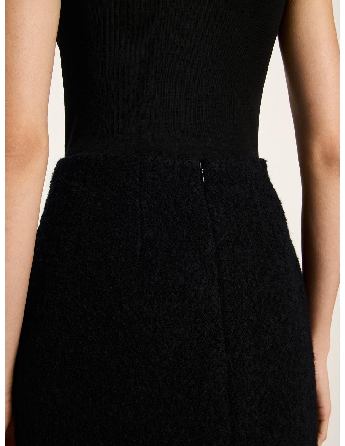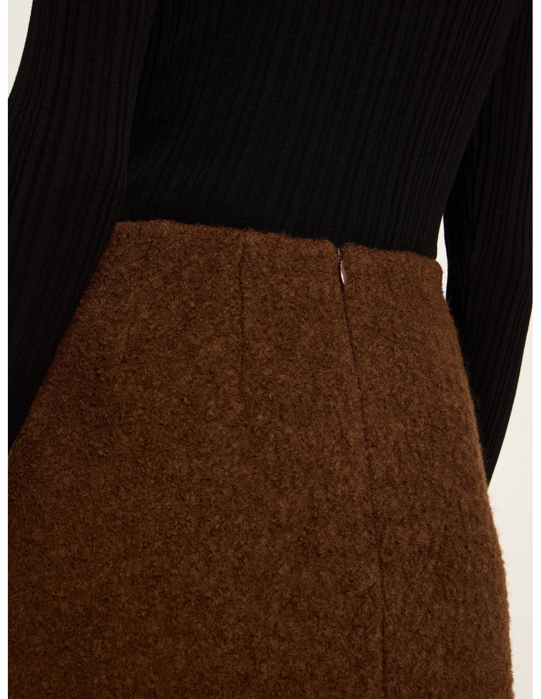 Il tessuto in lana biologica è caldo, naturale e resistente, con una qualità che rimane bellissima nel tempo. La struttura bouclé dà profondità al capo senza appesantirlo, mantenendo una mano piacevole e un aspetto ricercato. La gonna è foderata, per garantire comfort e una vestibilità stabile, e presenta una zip invisibile sul retro che mantiene l’estetica pulita.