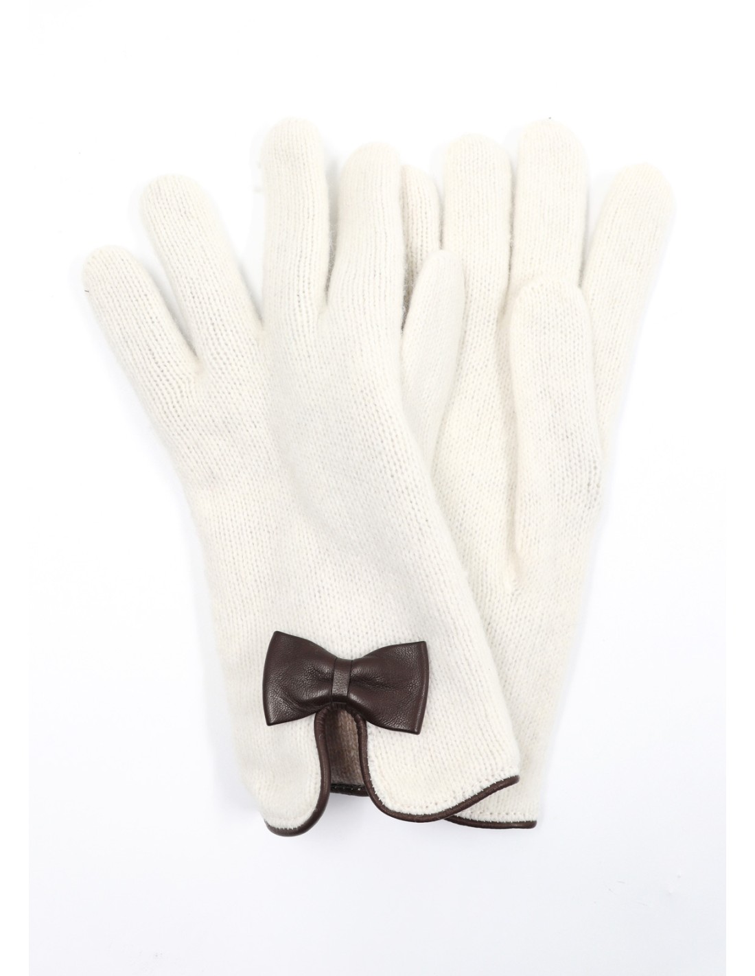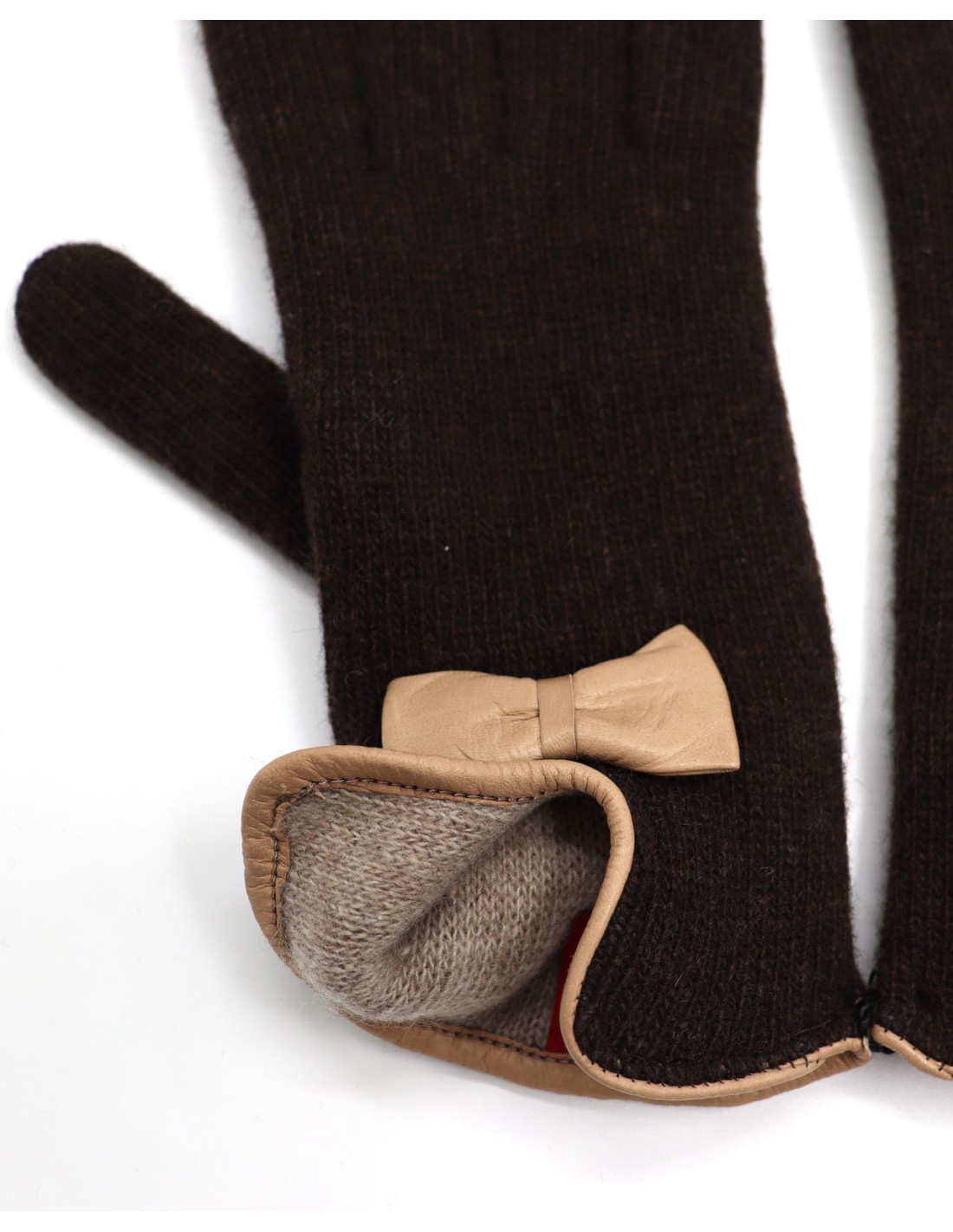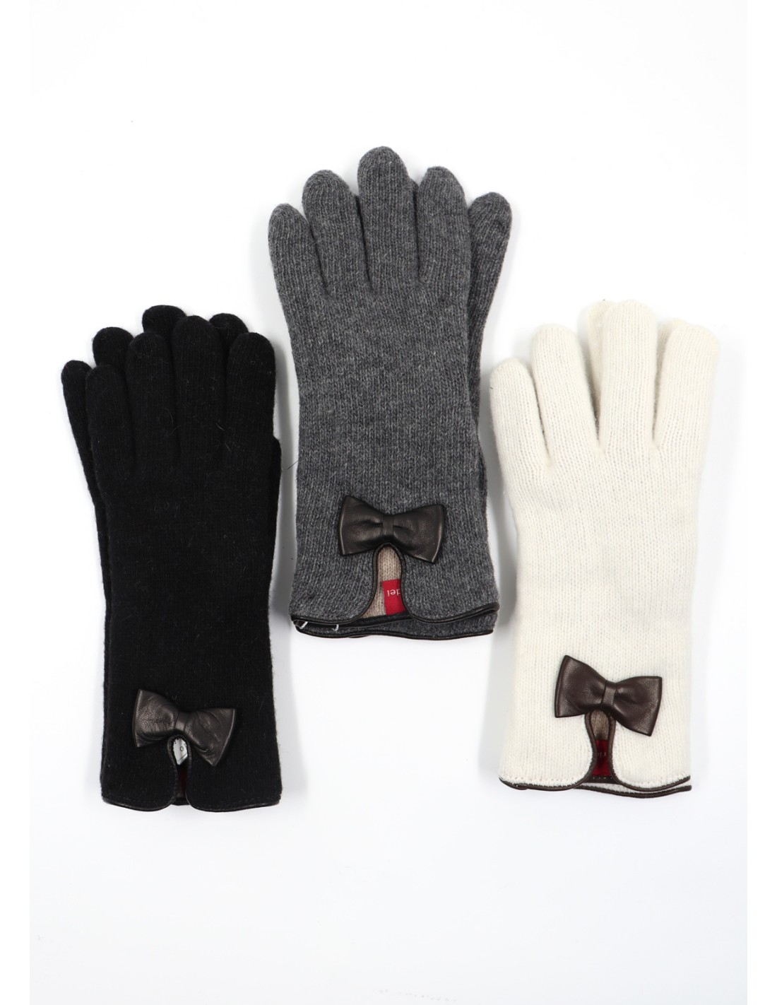 Un guanto caldissimo e protettivo grazie ai due strati di lana e molto femminile con fiocchetto in vera pelle.