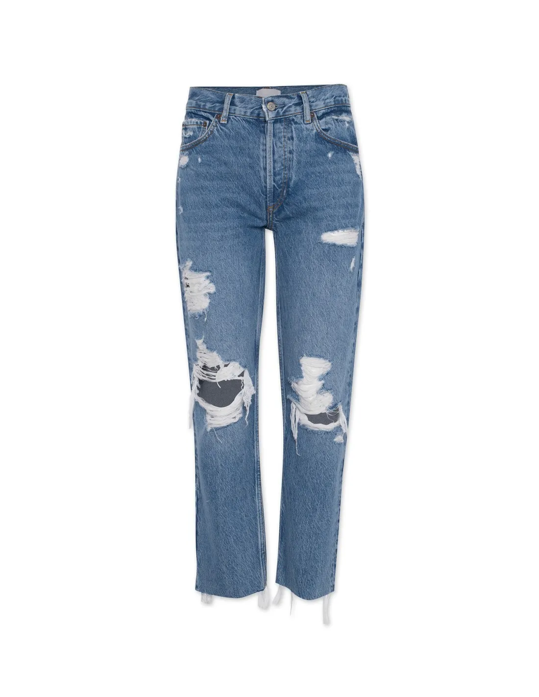Jeans strappato realizzato in Denim sostenibile di cotone biologico e Lyocell. Materiali riciclati, riciclabile, produzione responsabile e sostenibile, lavaggi eco-compatibili a bassissimo dispendio idrico ed energetico e finiture laser non manuali.