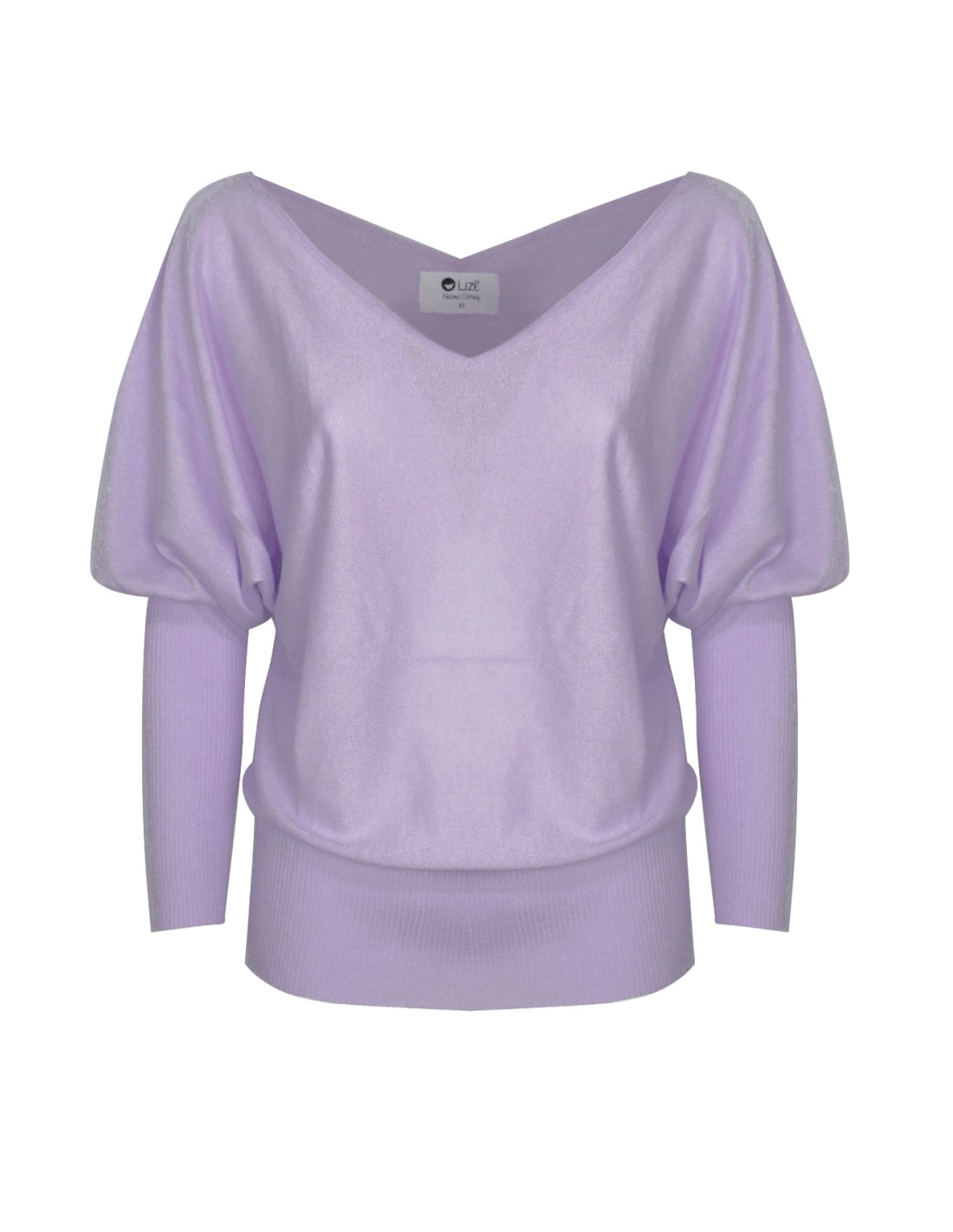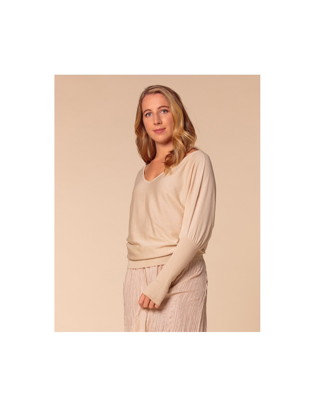 Modello con ampio scollo a V che cade morbido sulle spalle e ampie maniche a palloncino che si fermano al gomito per poi scendere extralunghe con motivo a costina.