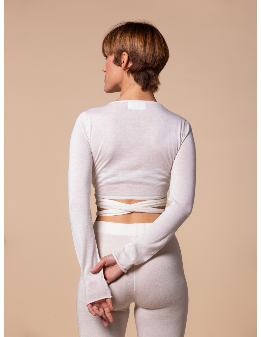 Modello con scollo a incrocio a V e due lunghissime punte da avvolgere attorno al corpo. Maniche extralunghe con fondo roll.