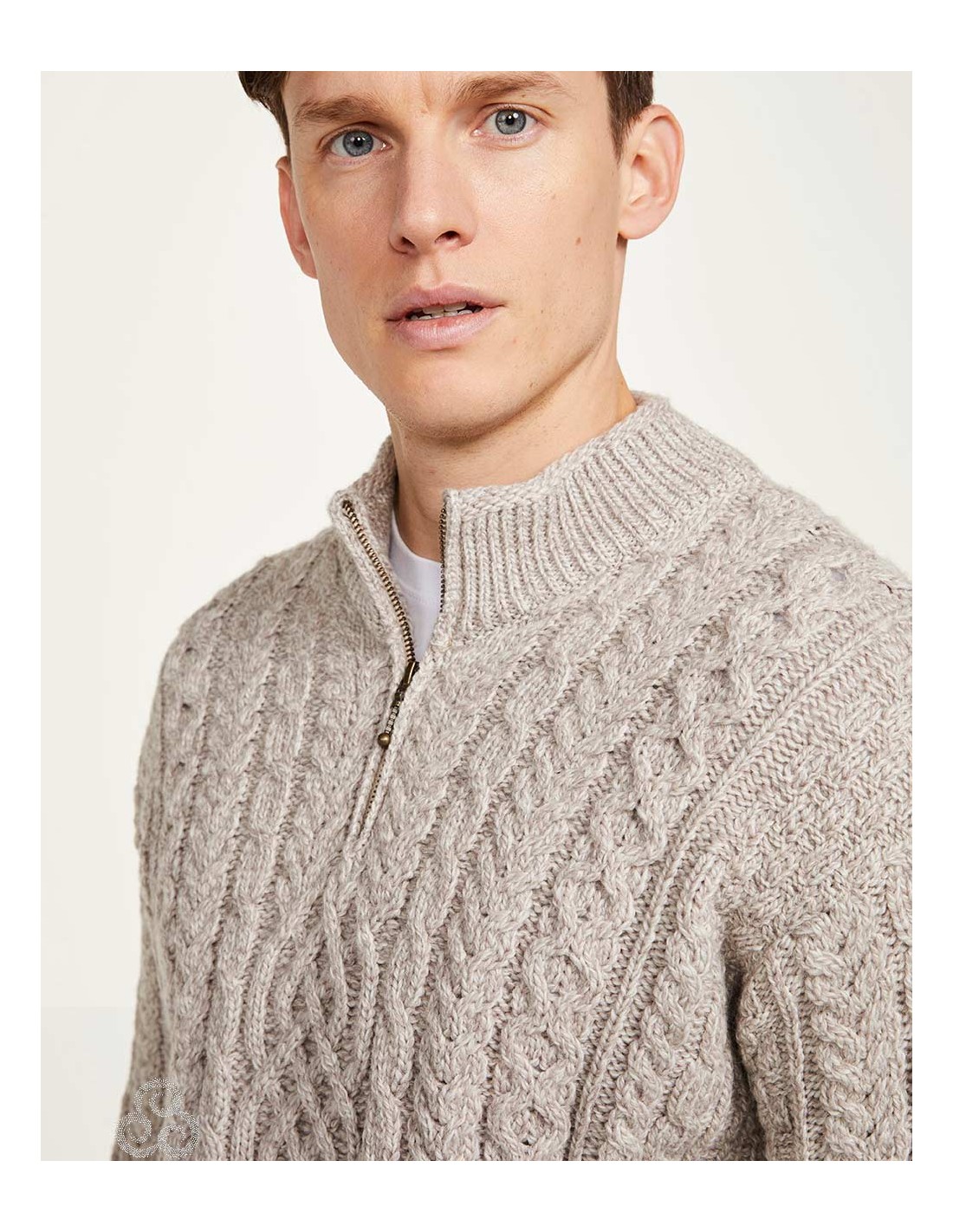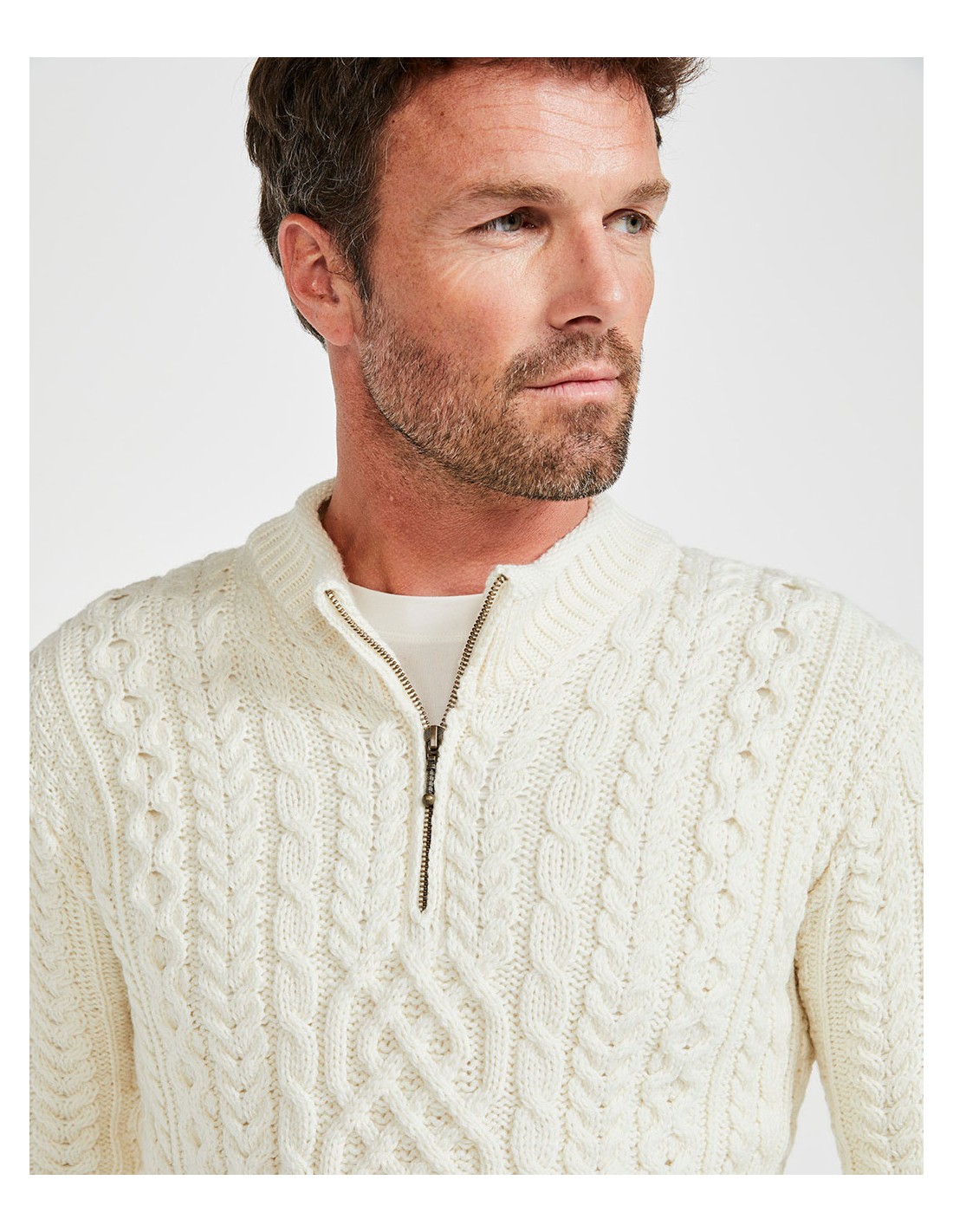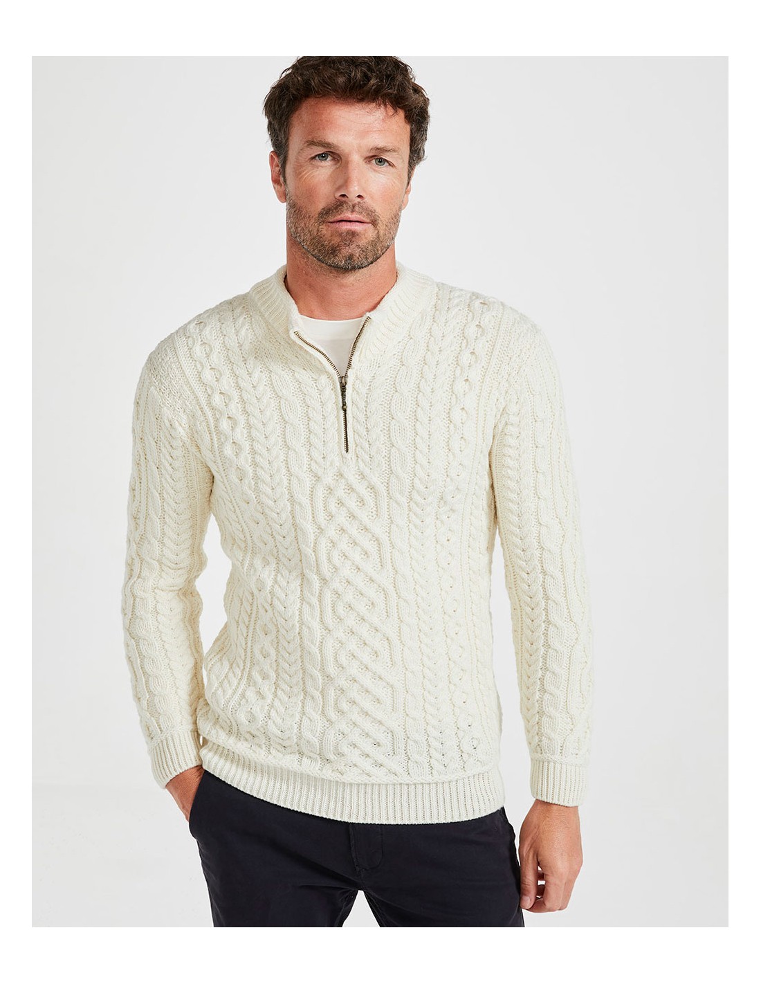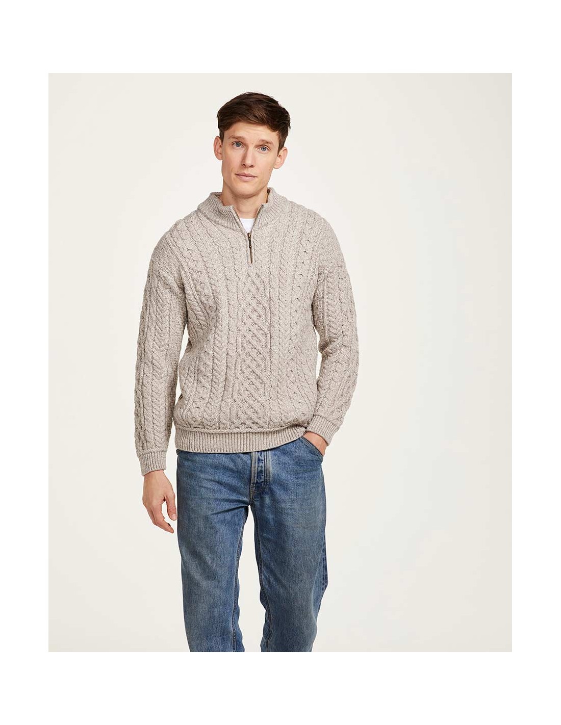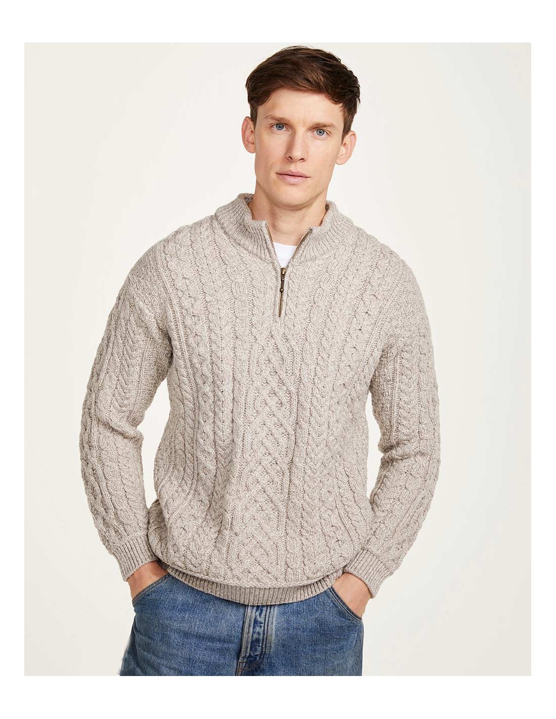 Caldissimo e morbidissimo maglione Aran con scollo a mezza zip realizzato in 100% Supersoft Merino che non pizzica. Perfetto per l'inverno, scalda e termoregola. Autentico e artigianale fatto in Irlanda.