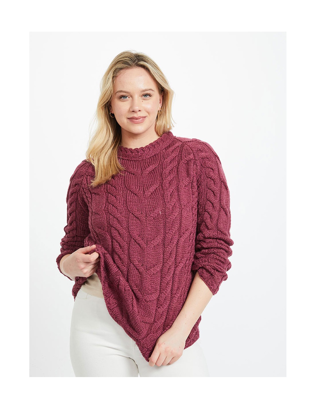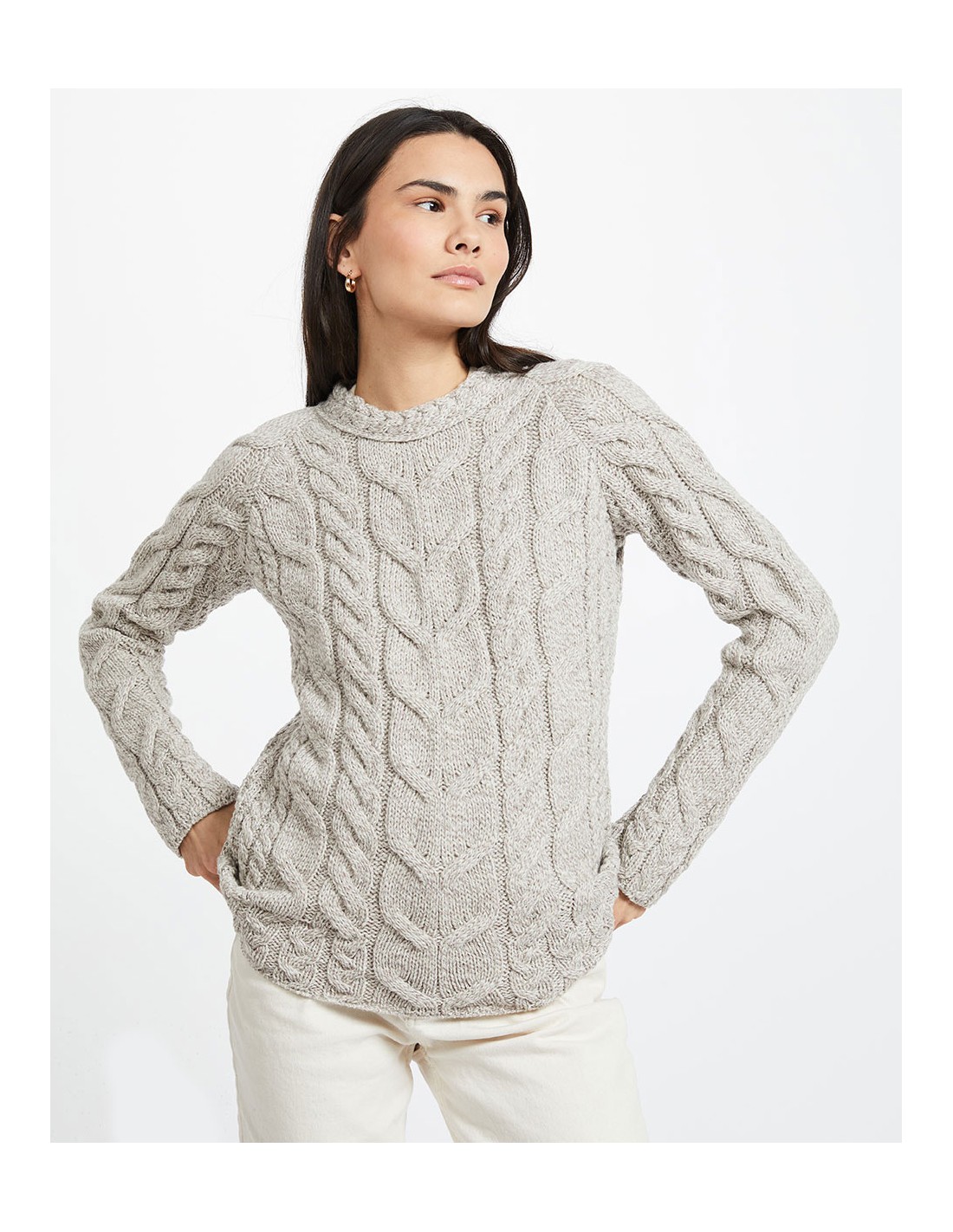 Femminile e caldo maglione Aran con maniche raglan realizzato in 100% Supersoft Merino che non pizzica. Perfetto per l'inverno, scalda e termoregola. Autentico e artigianale fatto in Irlanda.