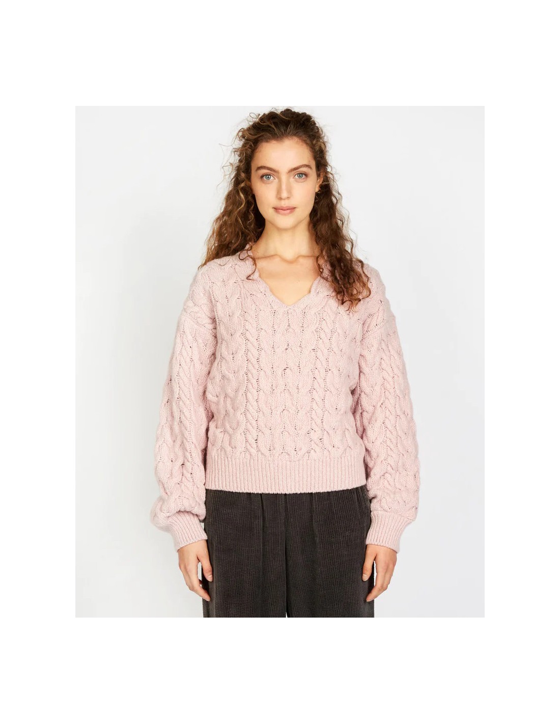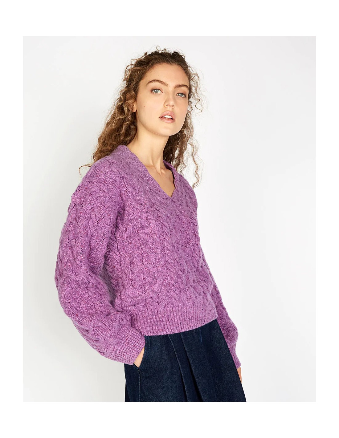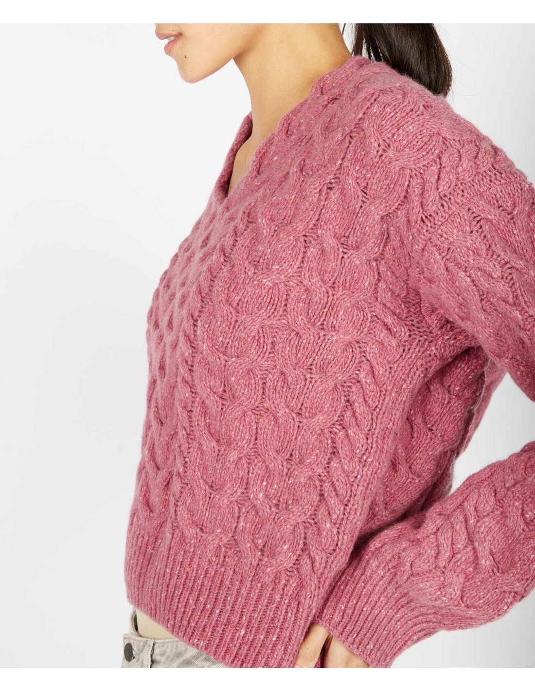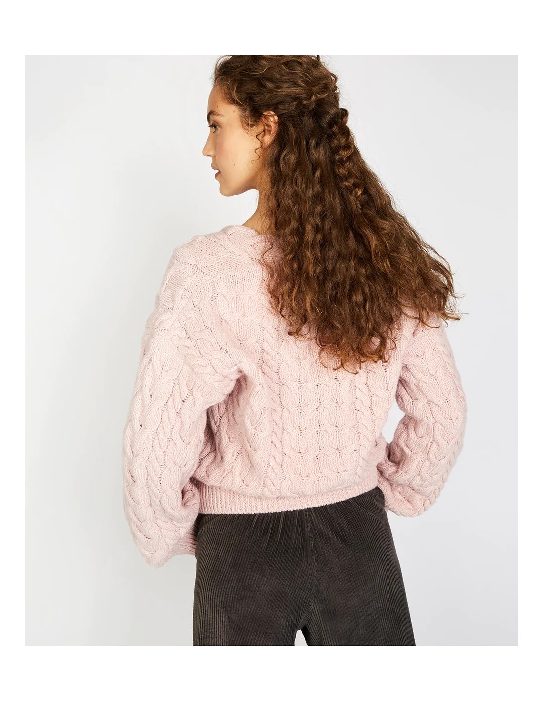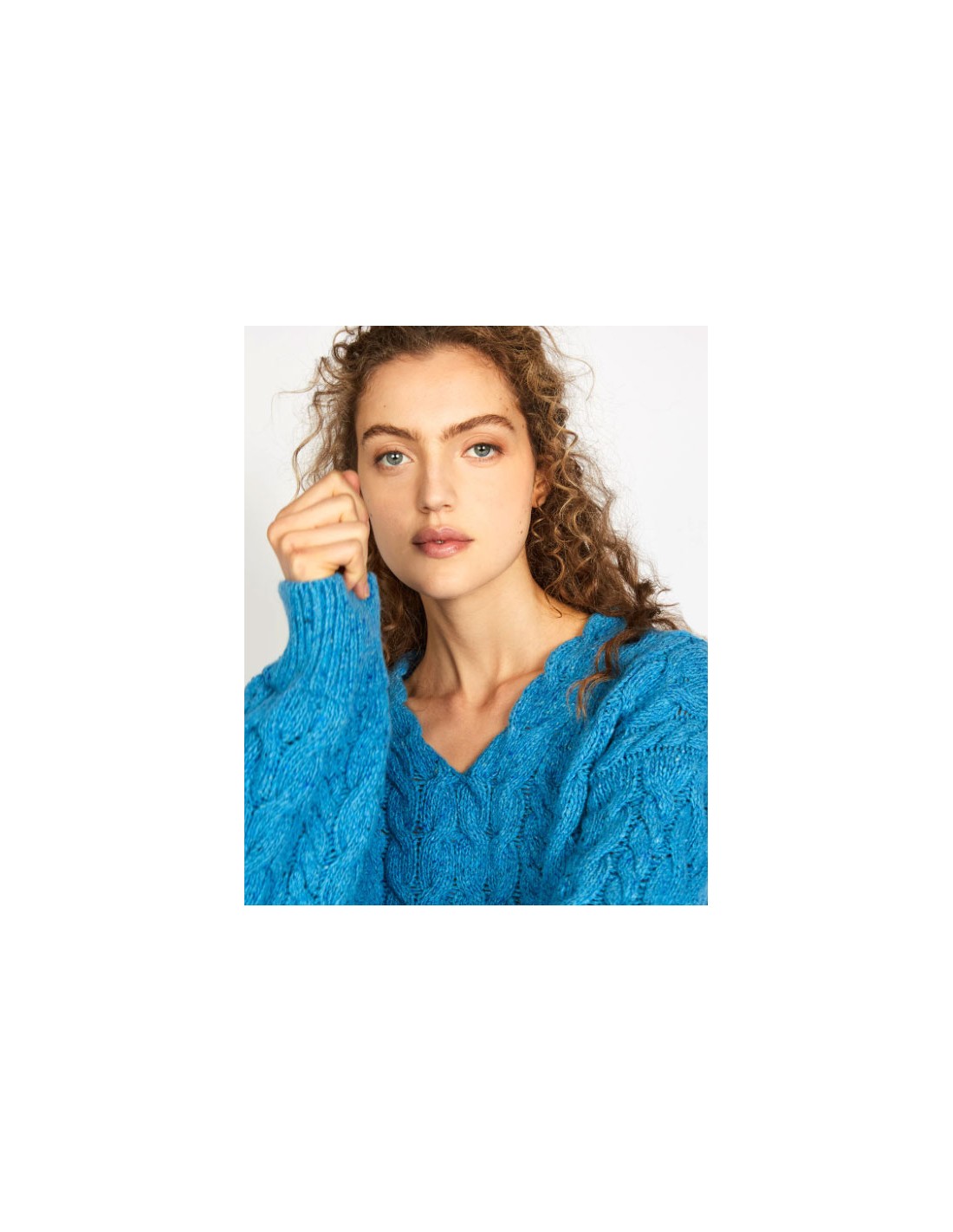 Modello con collo a V, e ampie maniche a palloncino. Ricchissima lavorazione a maglia su tutto il capo.