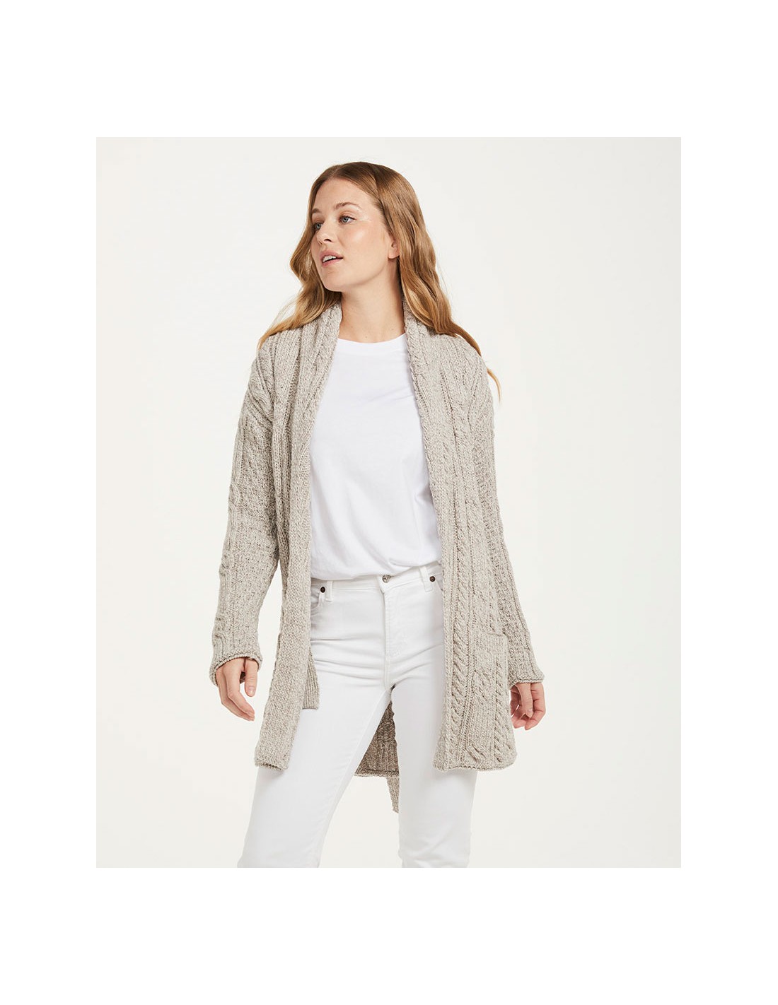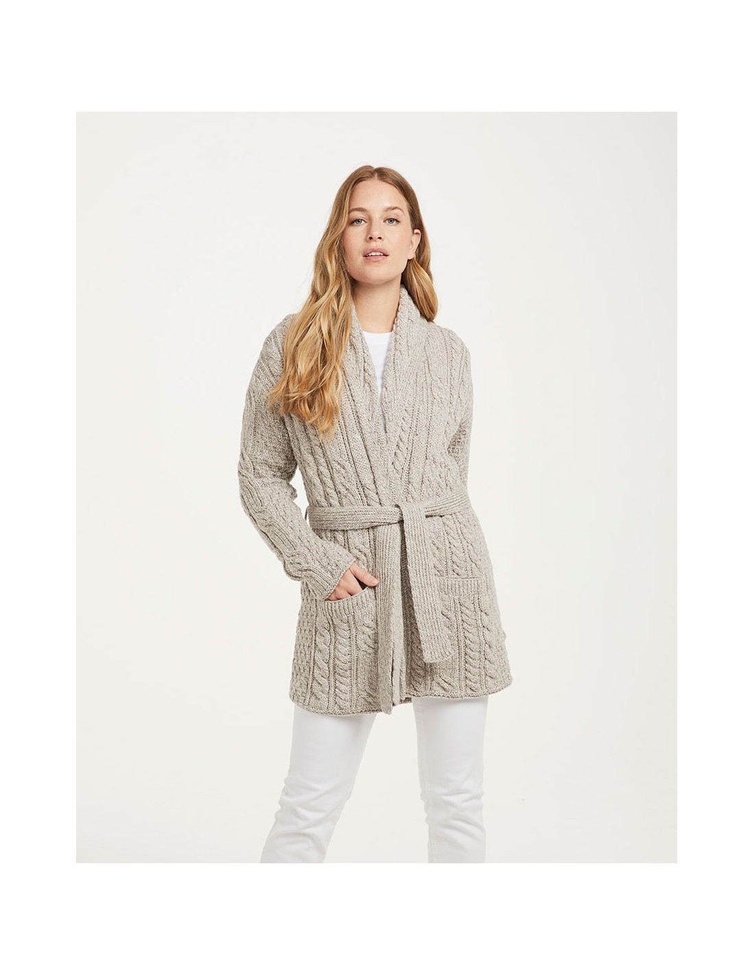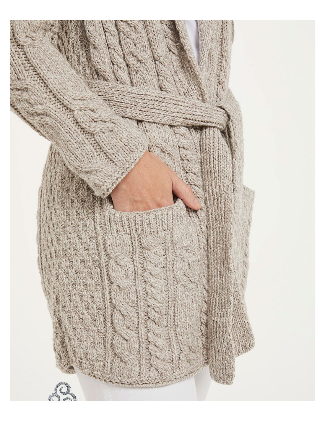 Cardigan Aran in 100% Lana Irlandese SuperSoft con cintura. Un capo autentico e artigianale fatto in Irlanda.