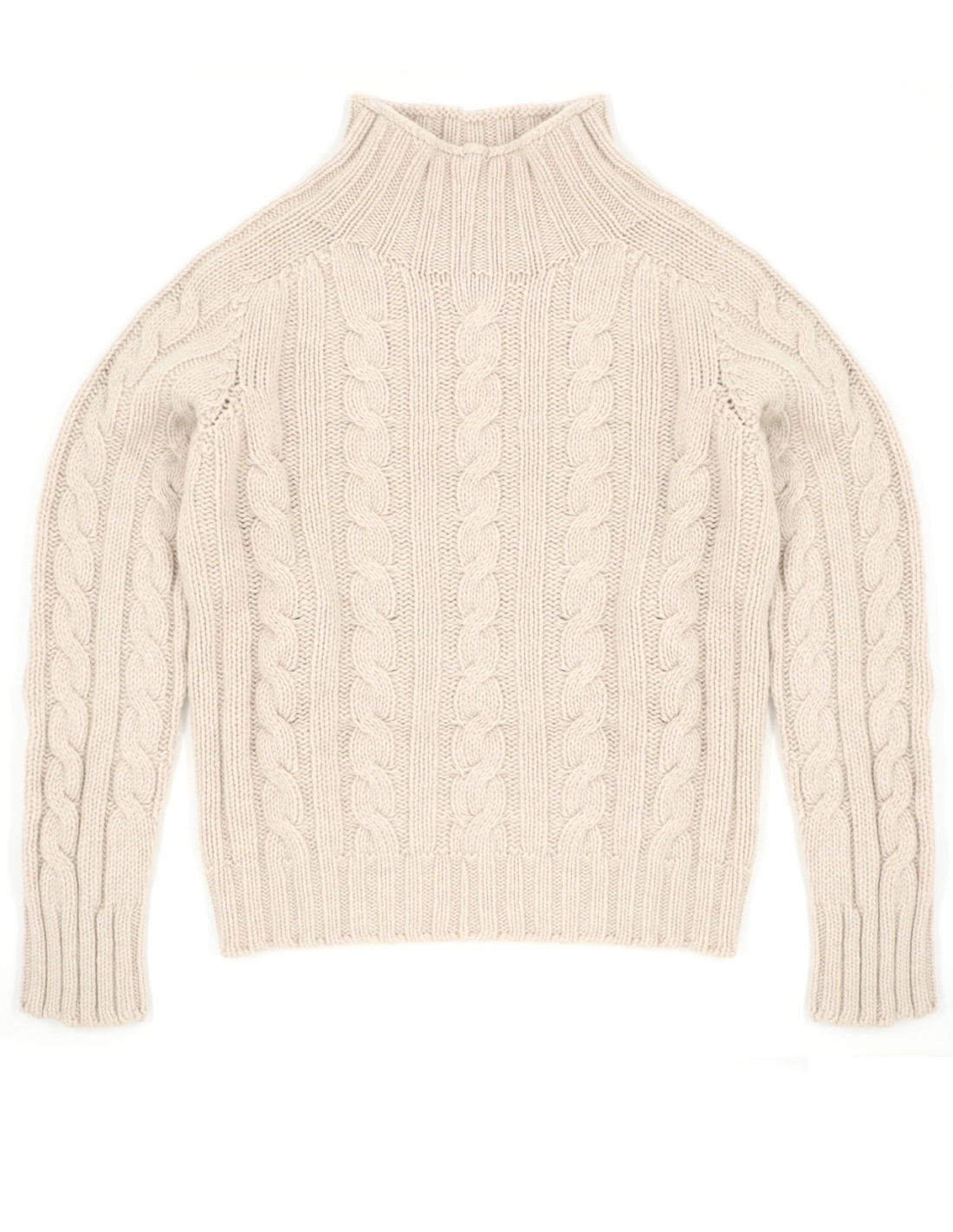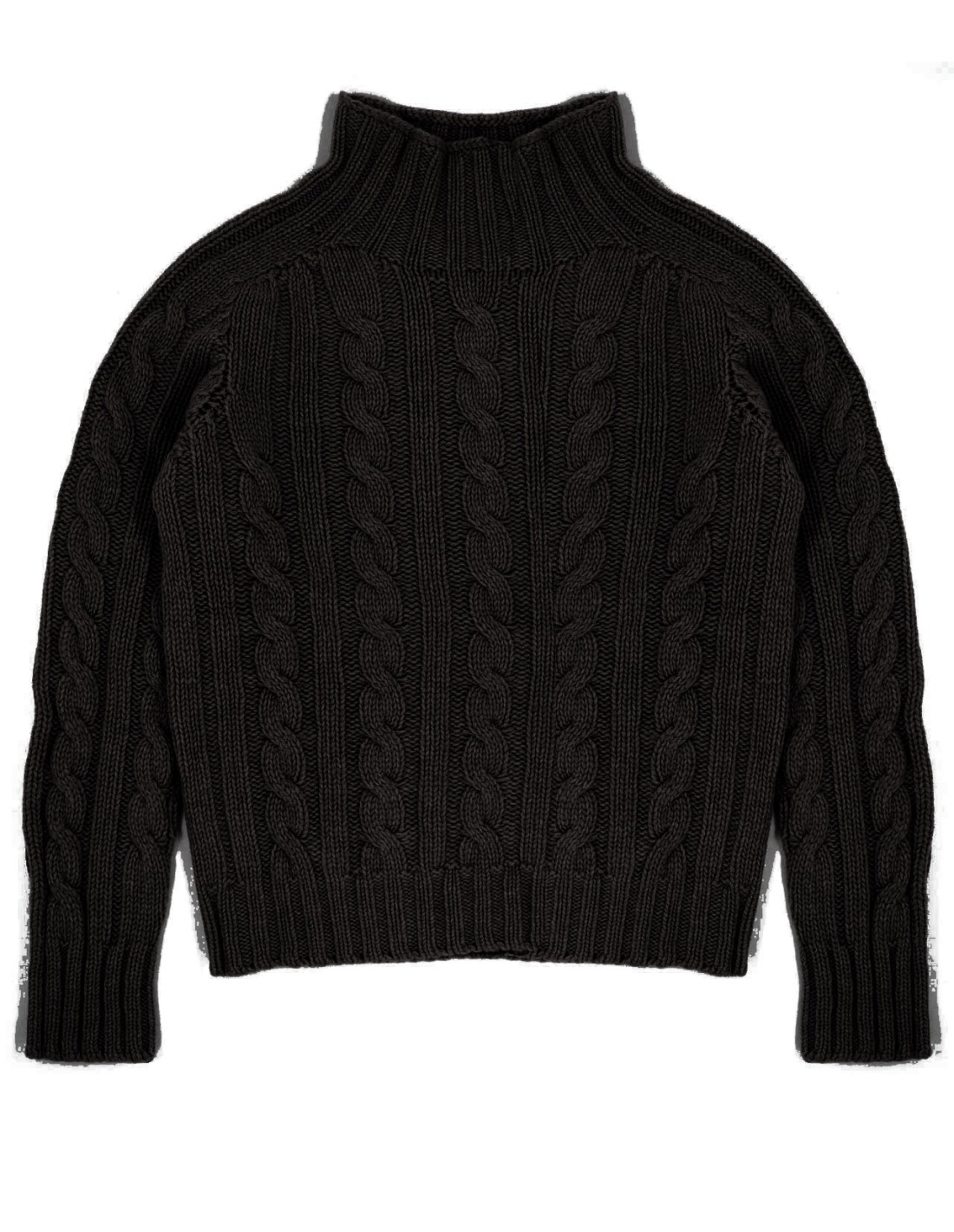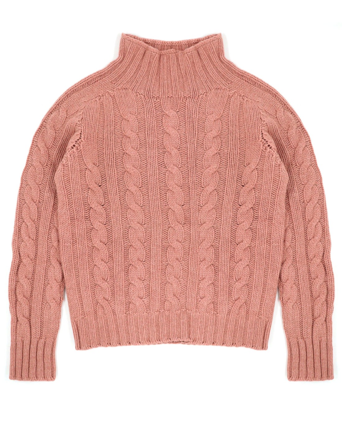 Modello con ricca lavorazione di trecce su tutto il capo e collo alto a dolcevita.