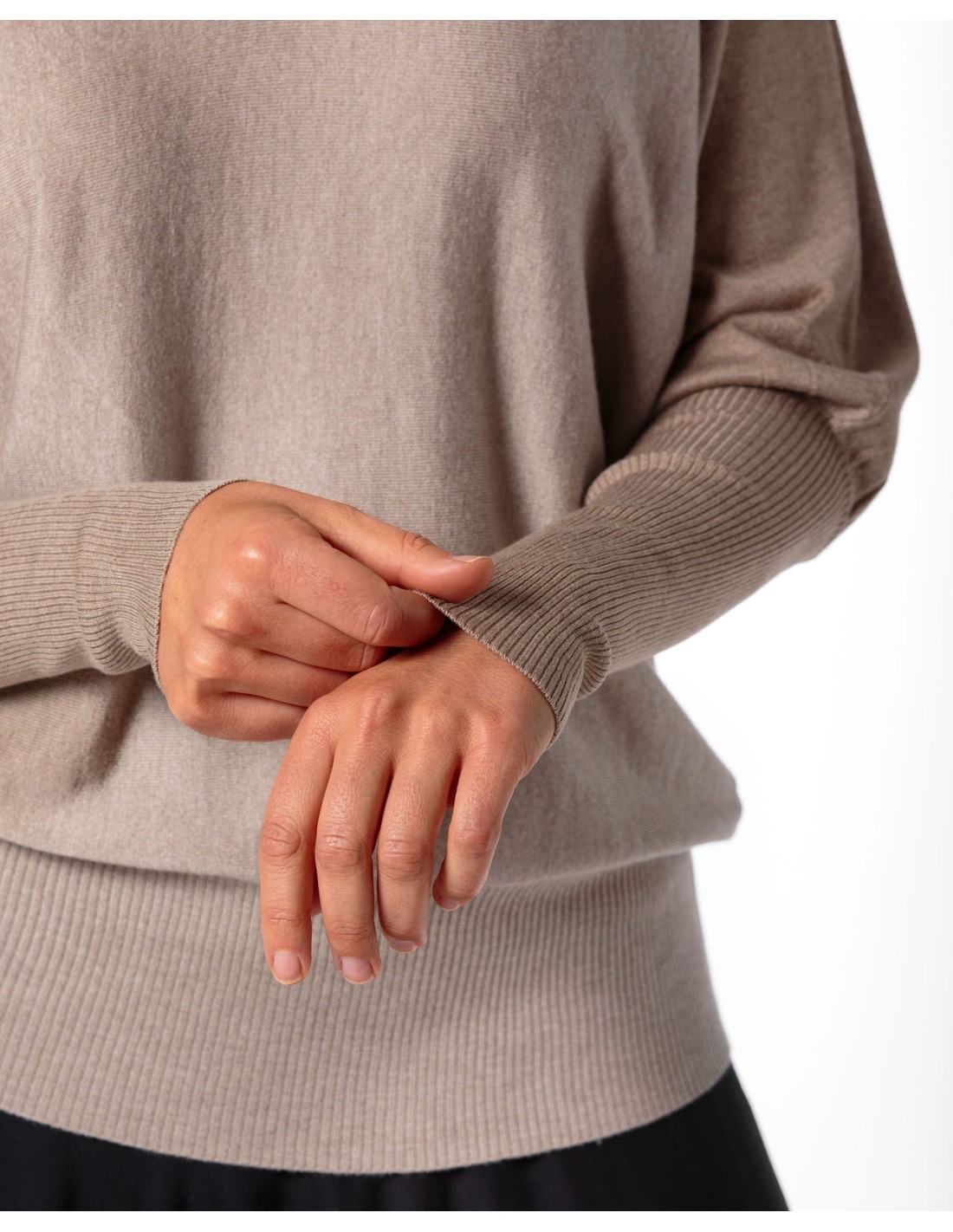 Modello con ampio scollo a V che cade morbido sulle spalle e ampie maniche a palloncino che si fermano al gomito per poi scendere extralunghe con motivo a costina.