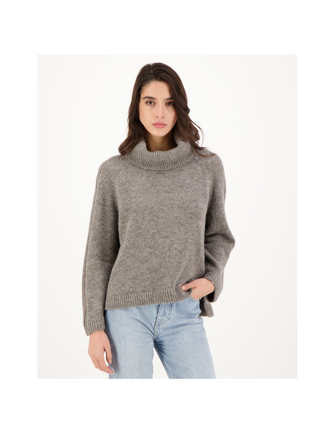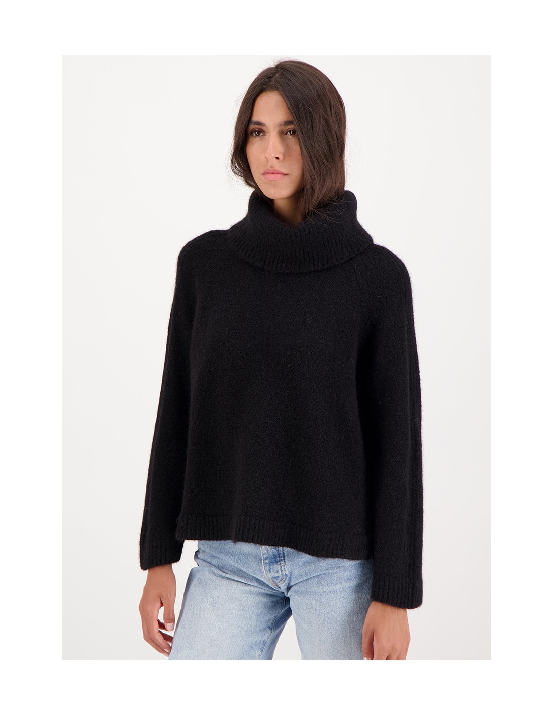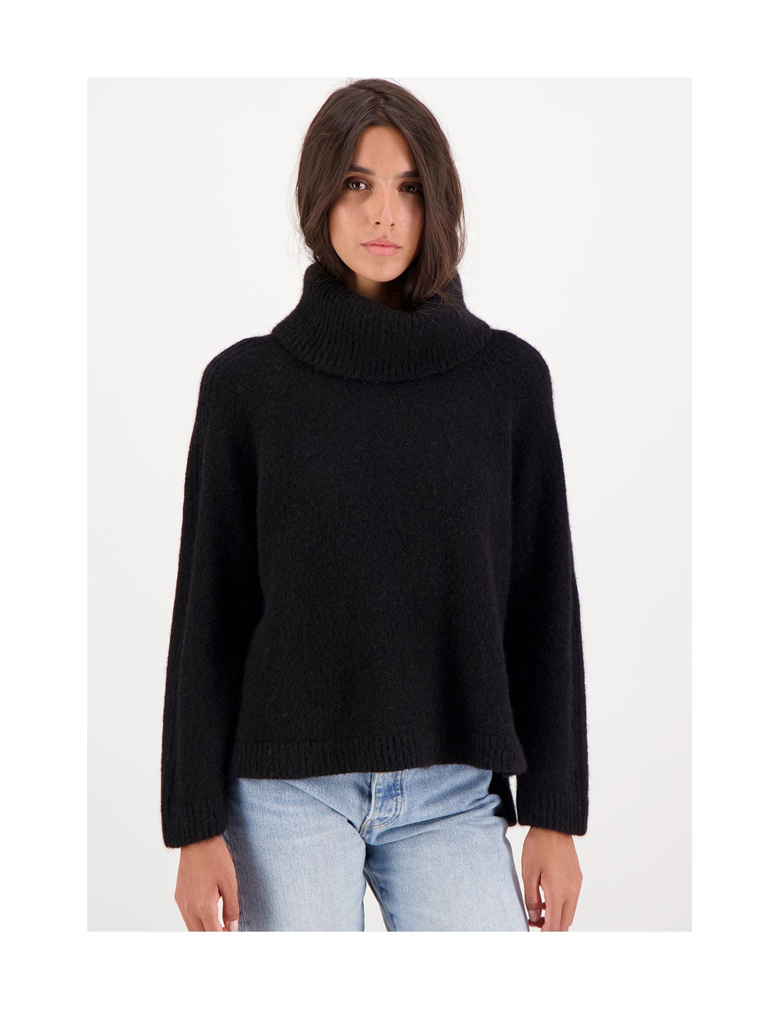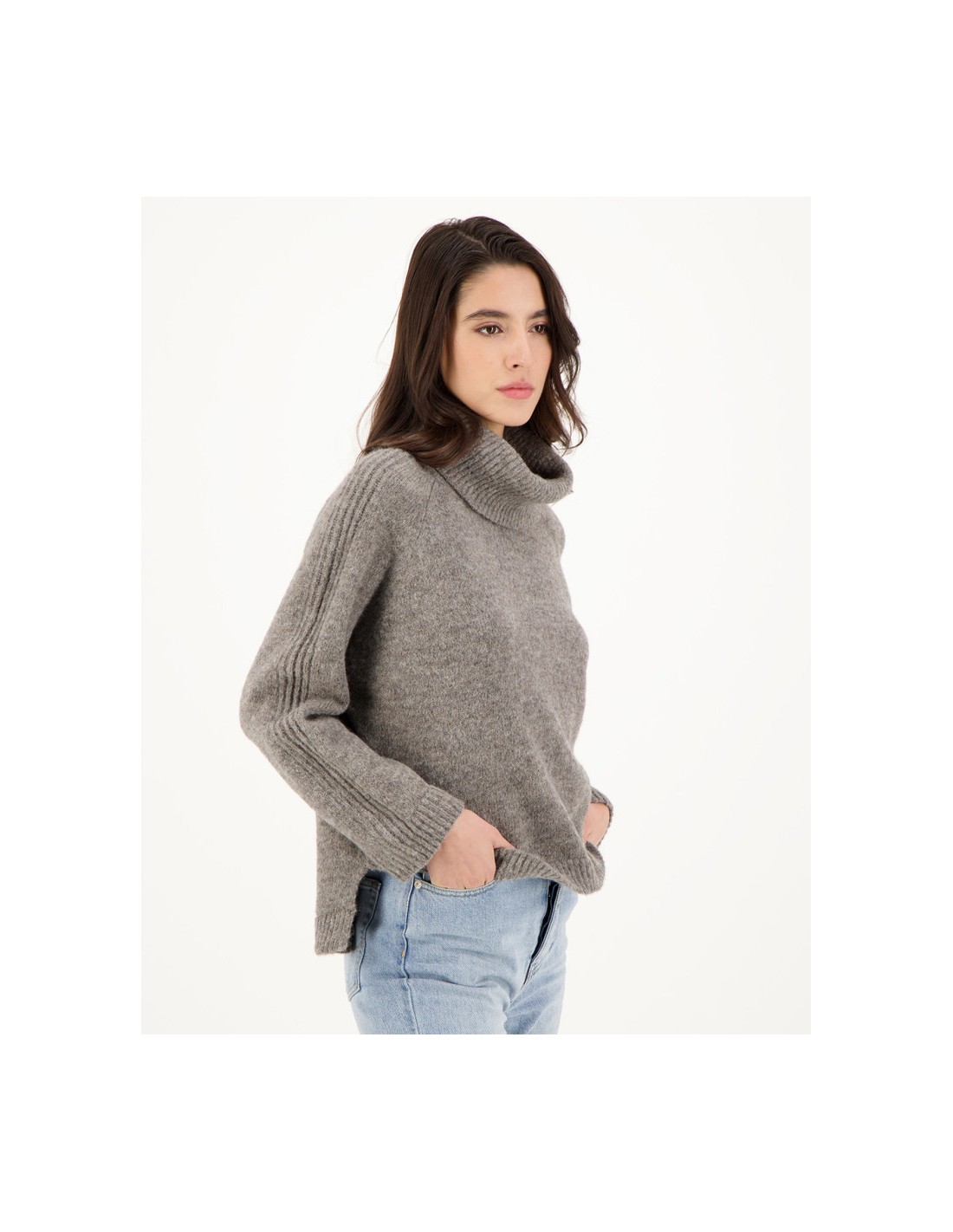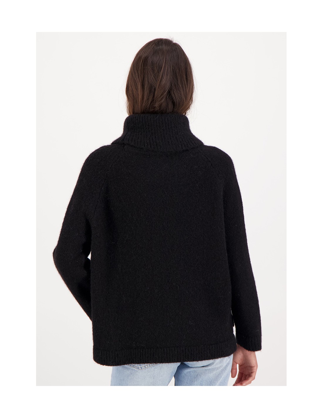 Modello dal taglio leggermente oversize con ampio collo alto risvoltato. Un maglione caldissimo.