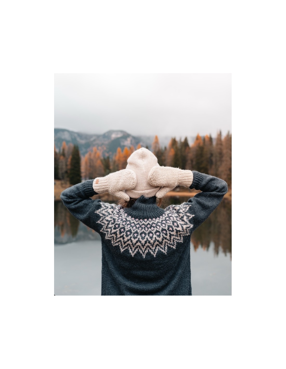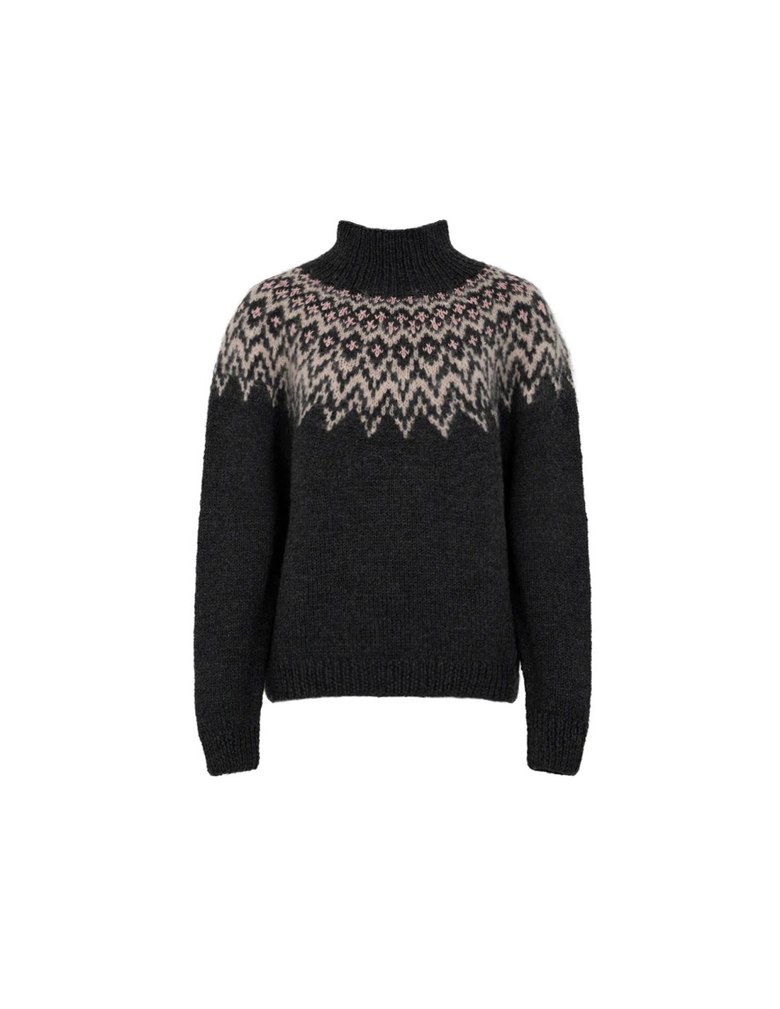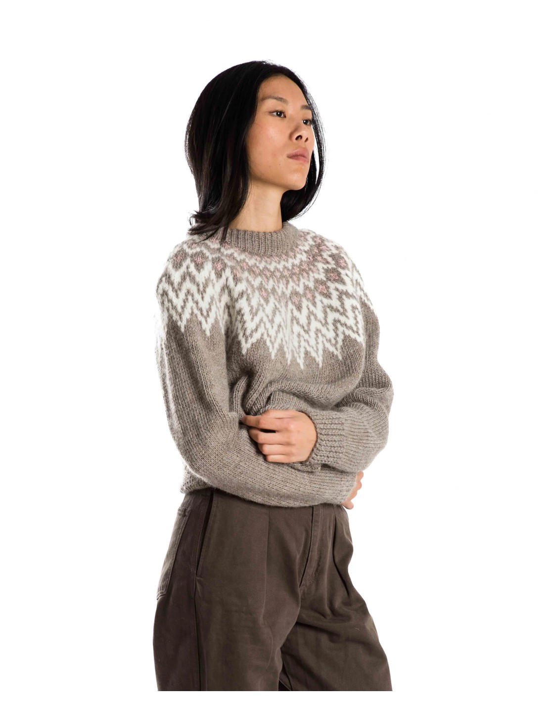 Maglione donna dallo stile Norvegese lavorato a mano in pura lana Merino mulesing free certificata Oeko-Tex da 23 micron con inserti in Mohair nel disegno. Filato grosso, molto caldo. Modello dal taglio casual largo e leggermente oversize con maniche raglan.