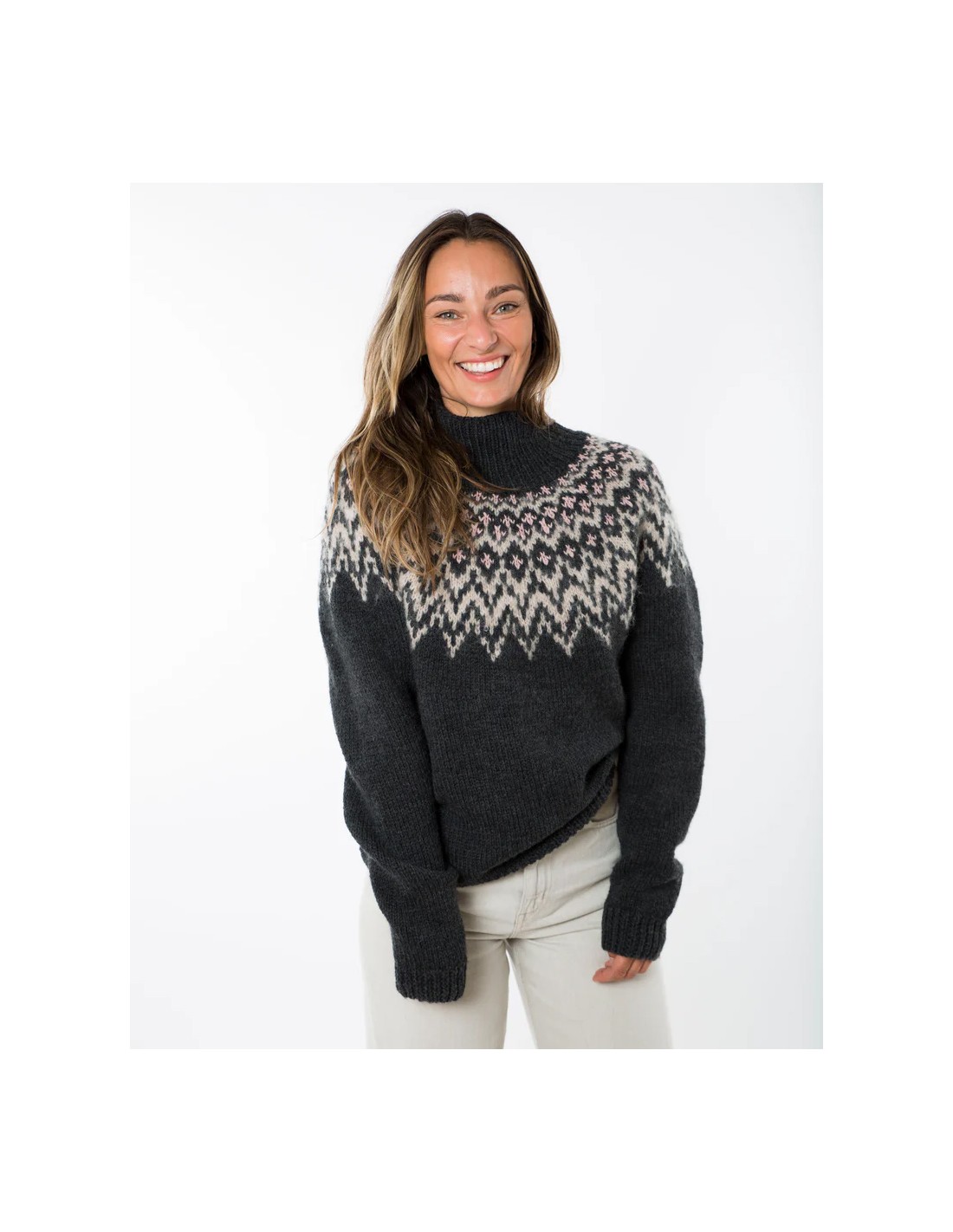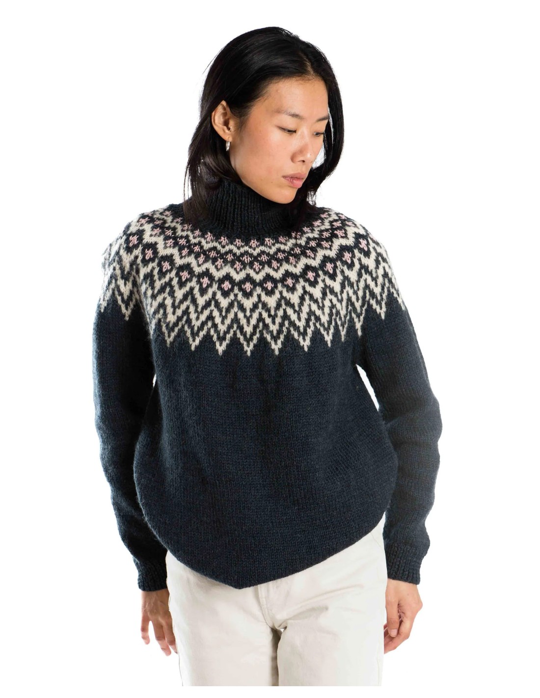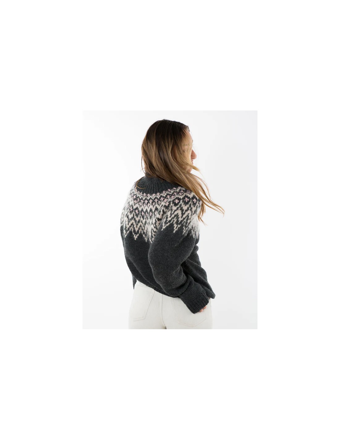 Maglione donna dallo stile Norvegese lavorato a mano in pura lana Merino mulesing free certificata Oeko-Tex da 23 micron con inserti in Mohair nel disegno. Filato grosso, molto caldo. Modello dal taglio casual largo e leggermente oversize con maniche raglan.