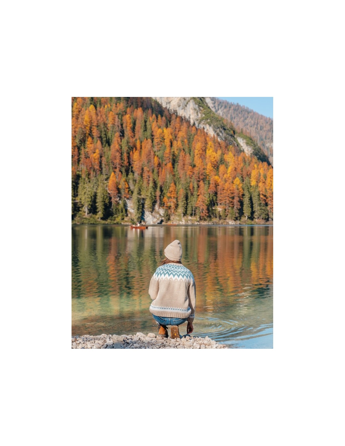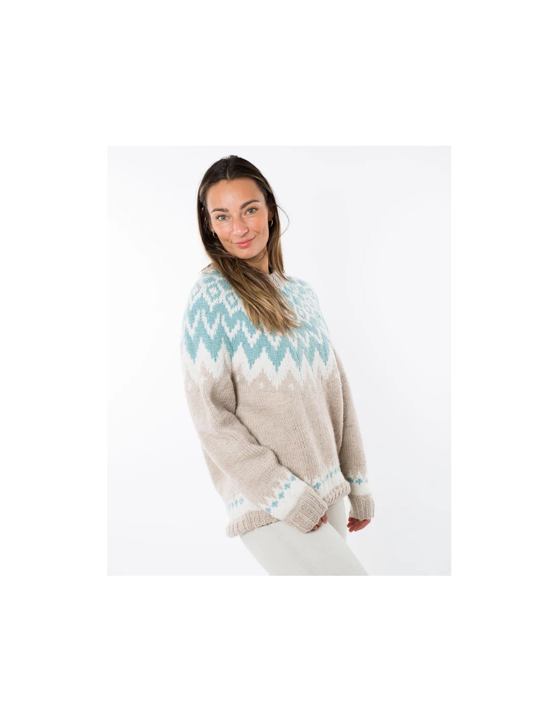 Maglione donna dallo stile Norvegese lavorato a mano in pura lana Merino mulesing free certificata Oeko-Tex da 23 micron con grande disegno sulla parte superiore. Filato grosso, molto caldo. Modello dal taglio casual largo e leggermente oversize con maniche raglan.