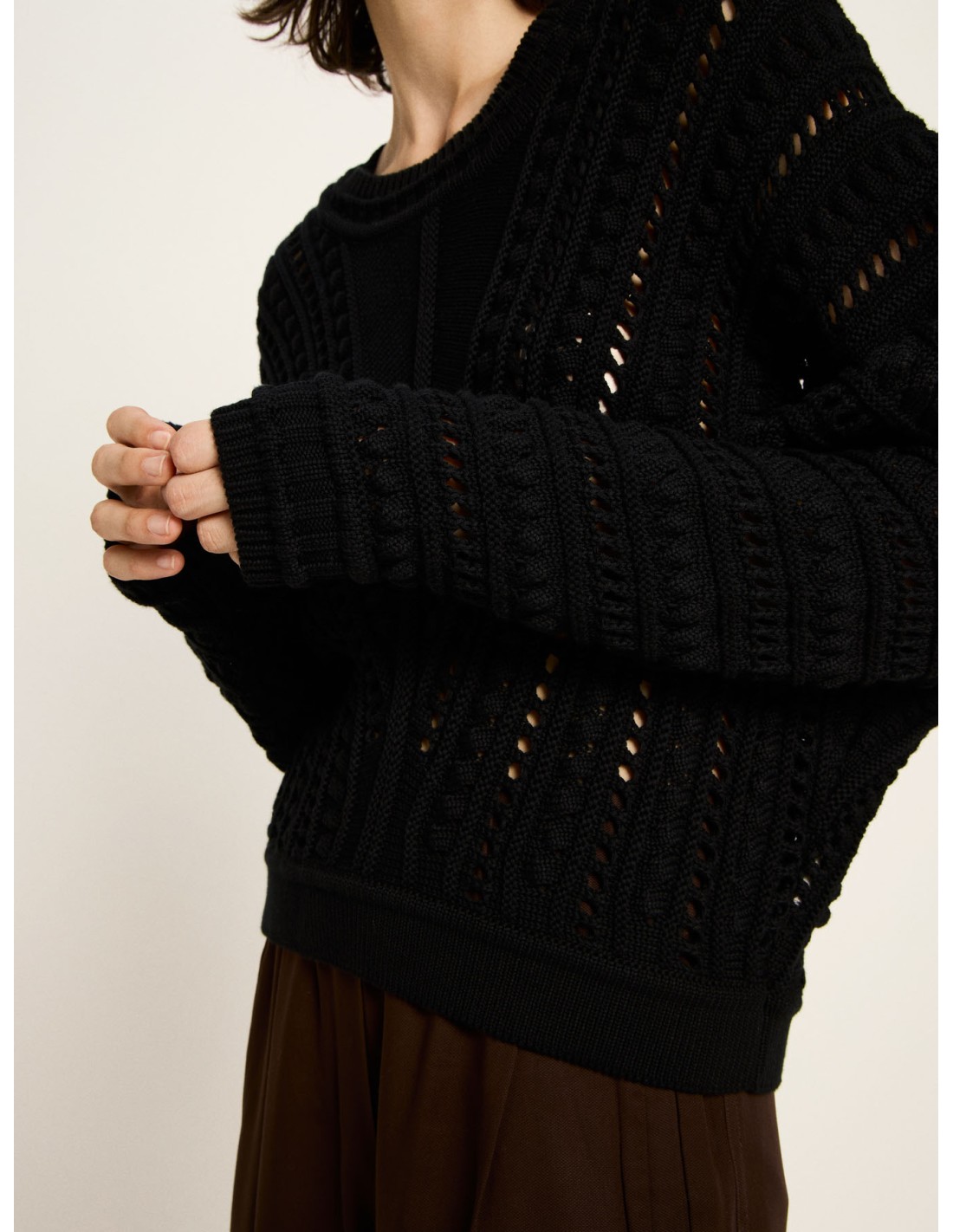 Il maglione traforato in cotone biologico è un capo femminile e raffinato, realizzato in 100% cotone biologico certificato GOTS. La lavorazione a traforo dona leggerezza, struttura e una sottile trasparenza che lo rendono versatile e perfetto per la mezza stagione, indossato sopra un top, una t-shirt o un abito.