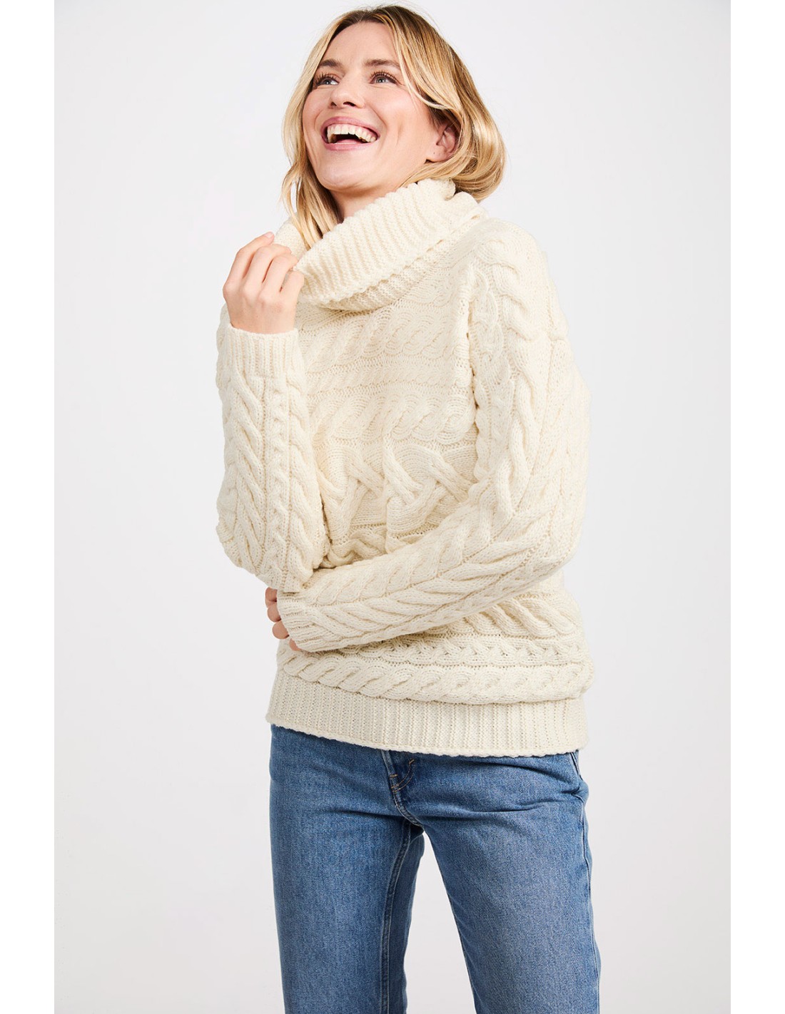 Maglione aglione Aran irlandese in pura lana merino supersoft: caldo, morbido e confortevole. Caratterizzato da un collo alto avvolgente e da ricchi punti tradizionali Aran orizzontali, è realizzato artigianalmente in Irlanda per unire autenticità e comfort moderno.