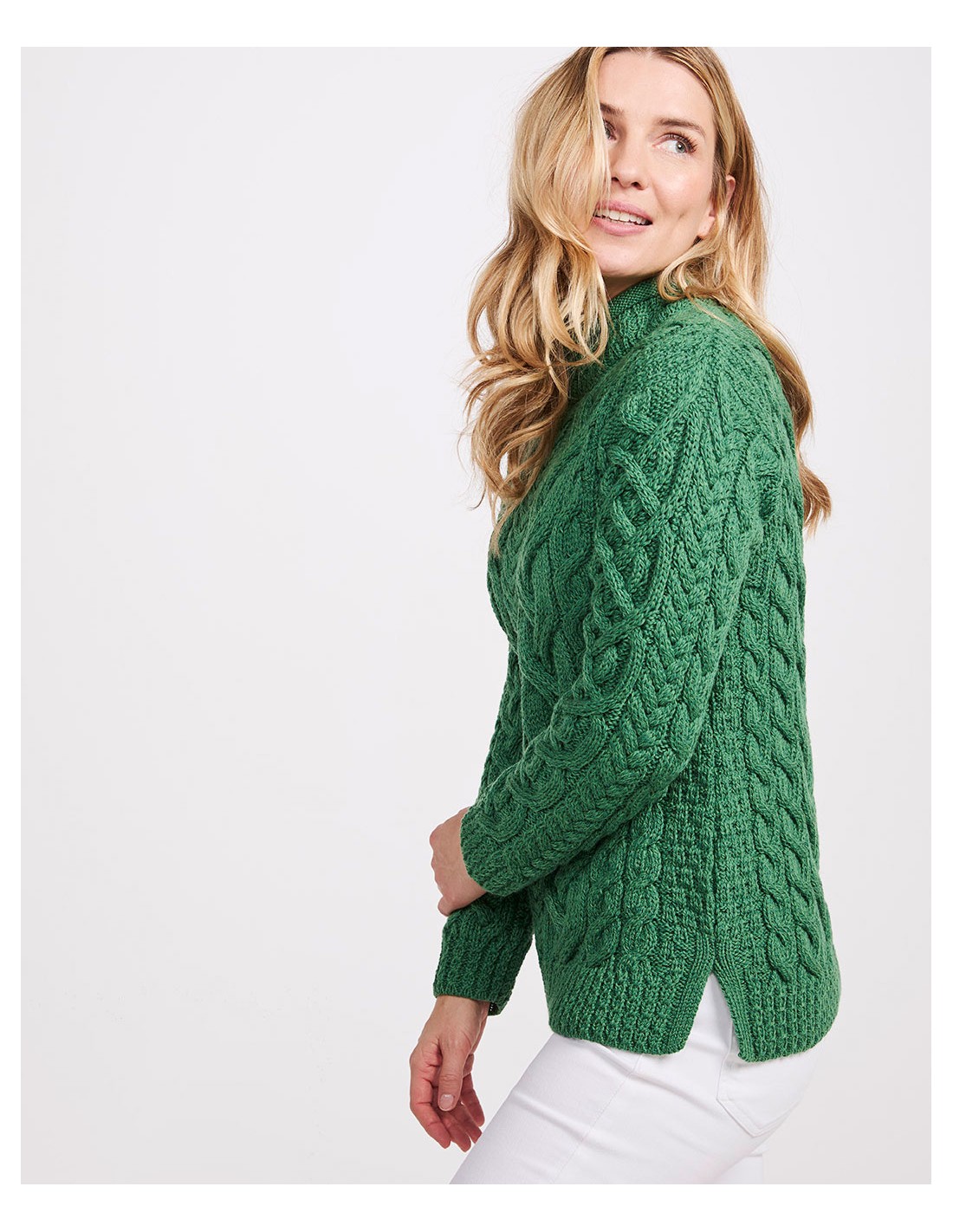 Emerald è il maglione Aran in pura lana merino che rompe gli schemi: unisce tradizione e design contemporaneo con un motivo asimmetrico e un mix di punti tipici della maglieria irlandese. Realizzato a mano in Irlanda, è un capo unico e distintivo.