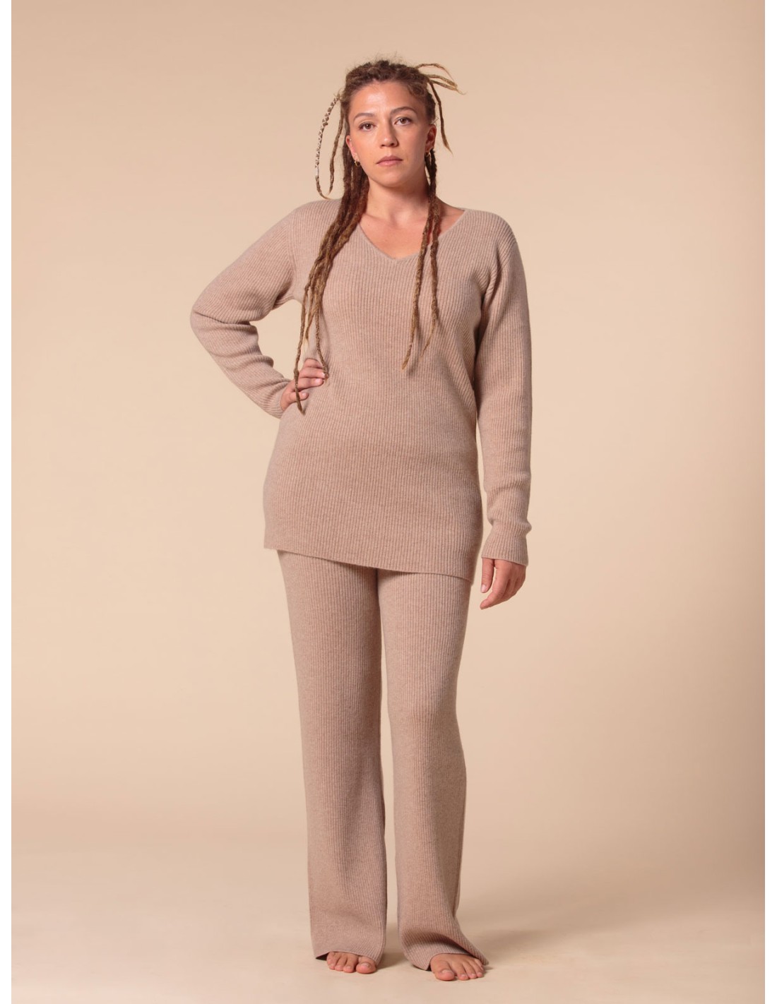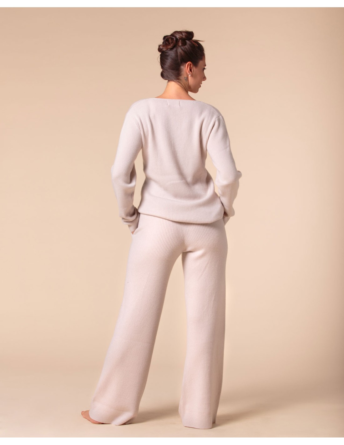 Il cashmere è di peso medio, caldo e leggero, ideale anche a pelle o come sottogiacca. Si abbina perfettamente ai pantaloni Silvia, realizzati nello stesso filato, lavorazione e palette di colori: insieme creano il completo in cashmere più elegante, morbido e confortevole della collezione.