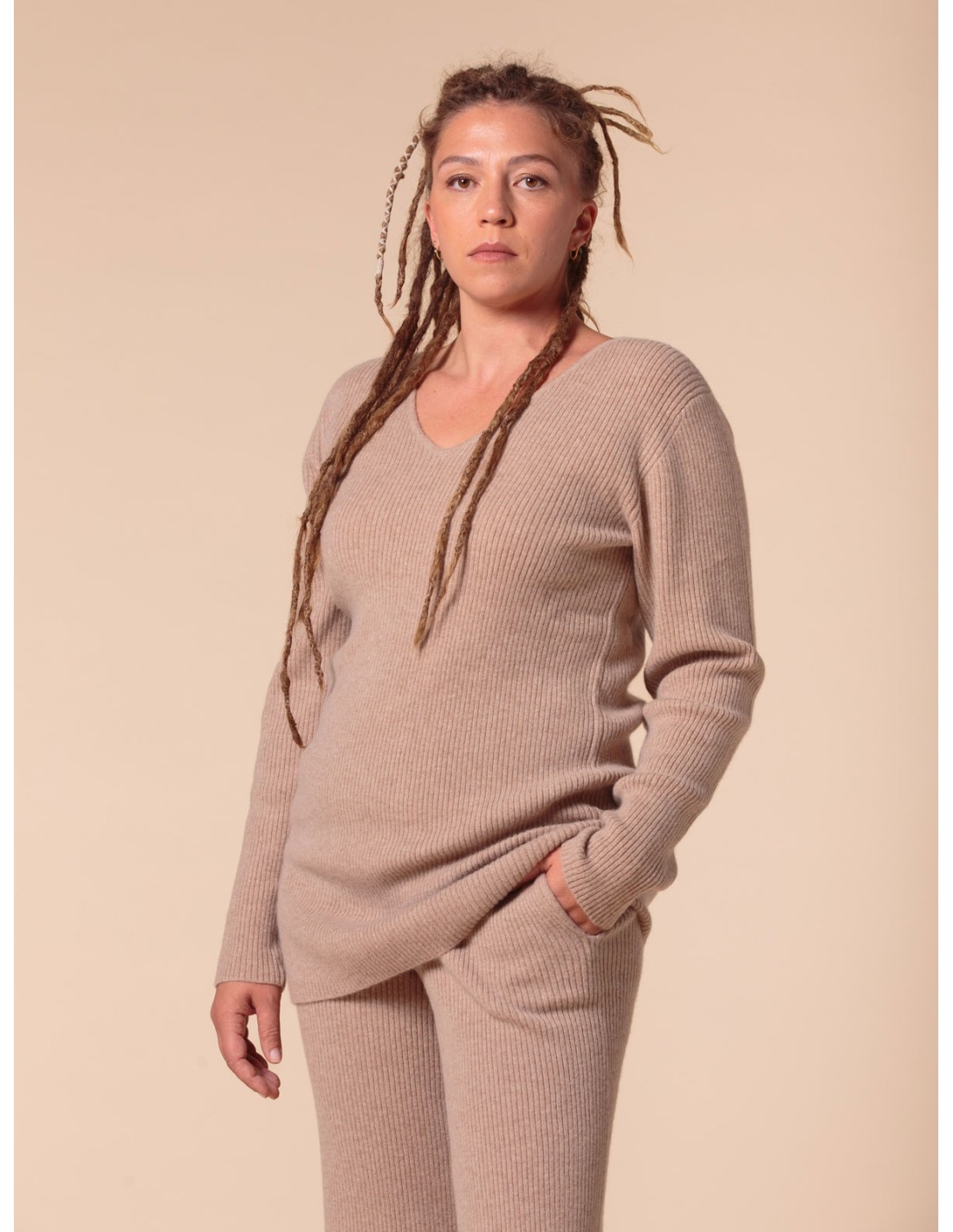 Il Maxi Pull Sara è il capo che unisce eleganza e comodità assoluta. Realizzato in puro cashmere, ha una lavorazione a costina che dona elasticità, struttura e una mano soffice e avvolgente. Lo scollo a V aperto e armonioso valorizza la linea del collo e del décolleté, mentre la lunghezza maxi e il taglio asciutto ma non troppo slim fit creano una silhouette morbida, che accompagna il corpo senza costringerlo.