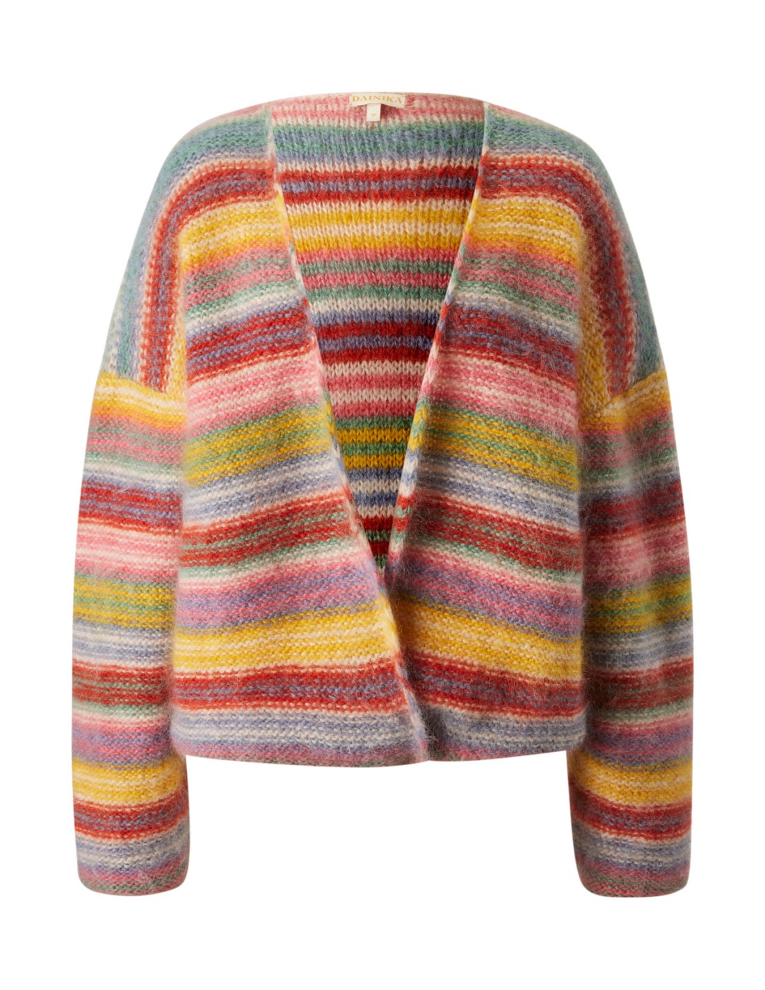 Soffice e luminoso, questo cardigan arcobaleno in lana mohair e lana merino avvolge con calore e leggerezza. Modello ampio e comodo con chiusura ad incrocio e bottone sul fondo. Perfetto sopra camicie e Cashmirette per look colorati, morbidi e pieni di personalità.