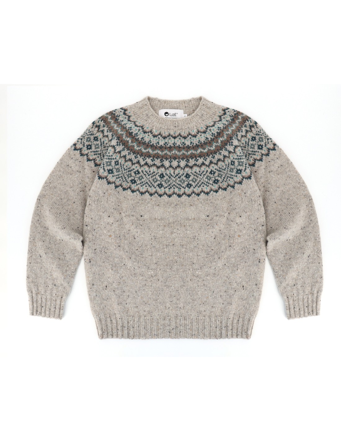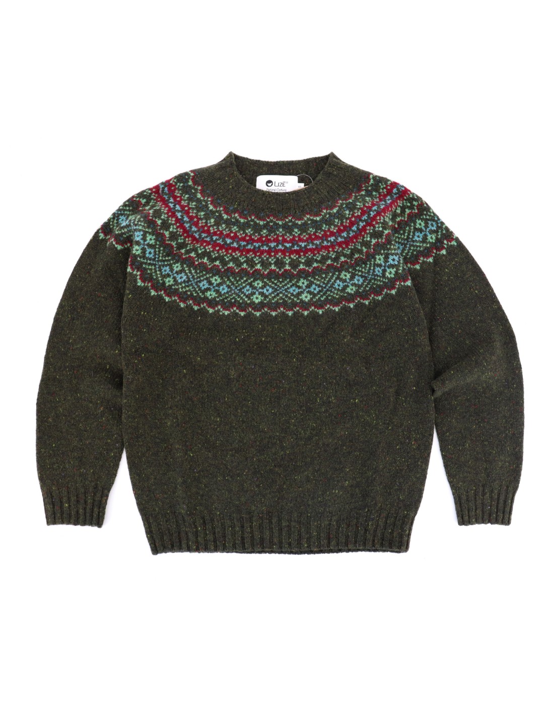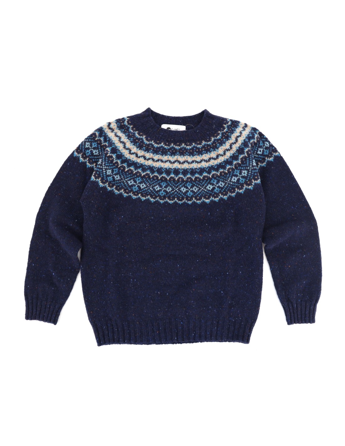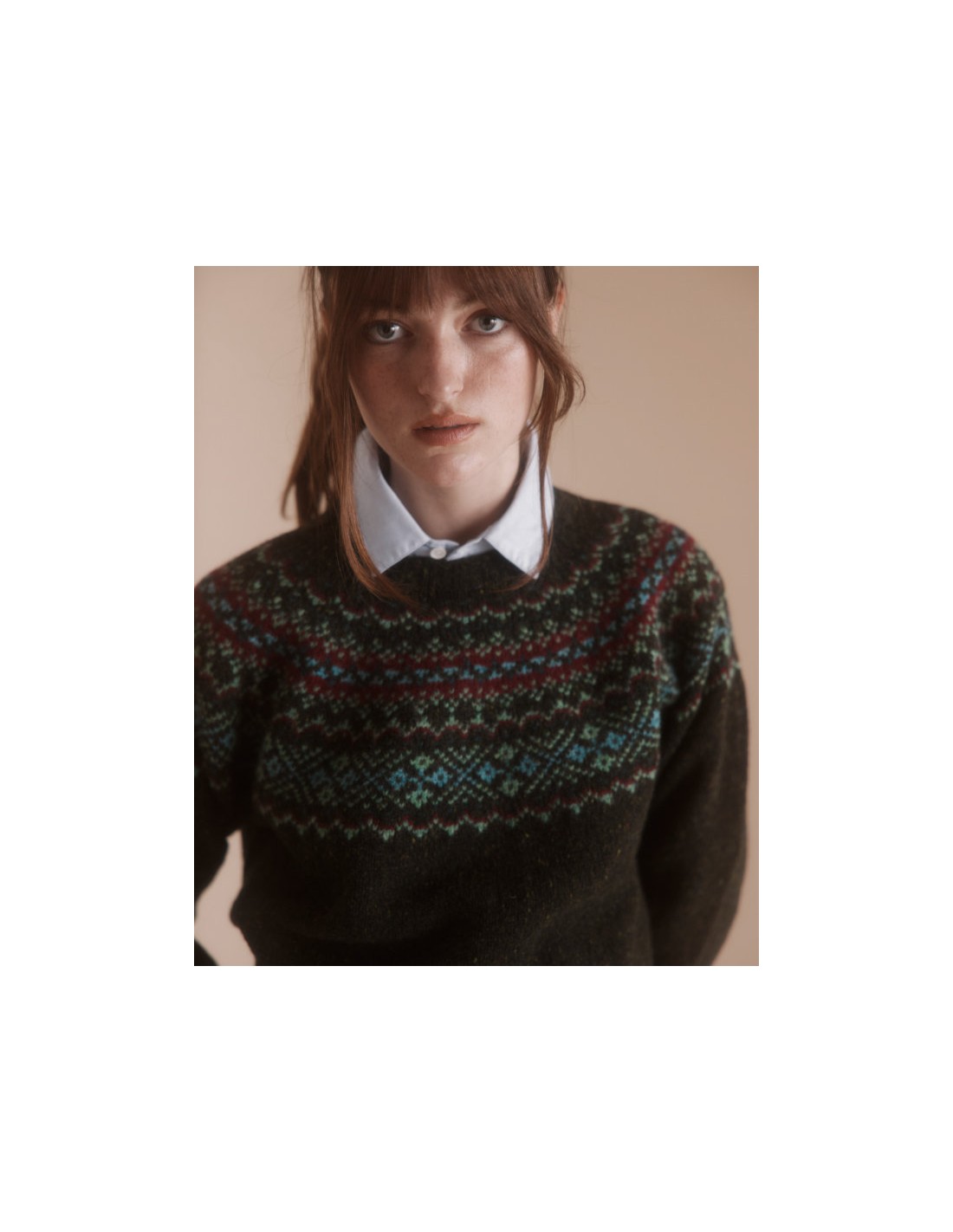 Questo maglione nasce da telai tradizionali nel cuore delle Highlands, dove la maglieria è ancora un’arte tramandata da generazioni. Lavorato interamente in Scozia con tecnica seamless, senza cuciture laterali, racchiude tutta l’autenticità e la maestria della tradizione Fair Isle: geometrie intrecciate, contrasti di colore e una texture viva che racconta la materia naturale da cui proviene.