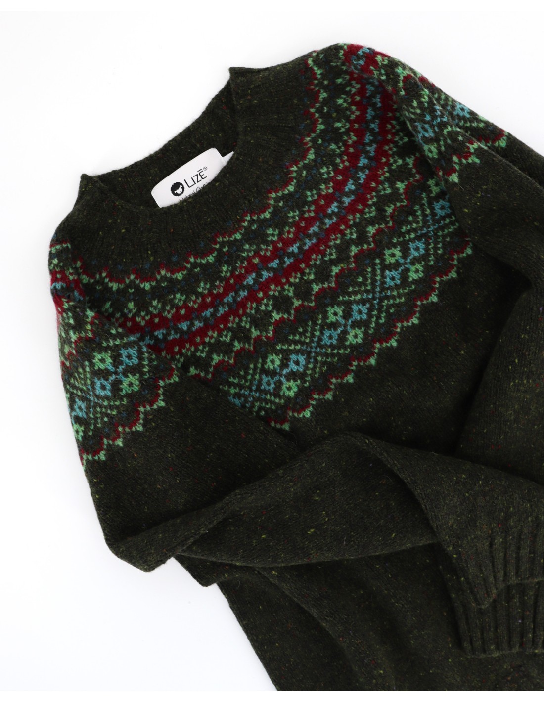 Autentico e spesso maglione scozzese Donna realizzato in 100% Lana Vergine con ricca lavorazione di jaquard su tutto il capo e filato leggermente melange. Prodotto artigianale di altissima qualità fatto in Scozia con maniche raglan e senza cuciture laterali.