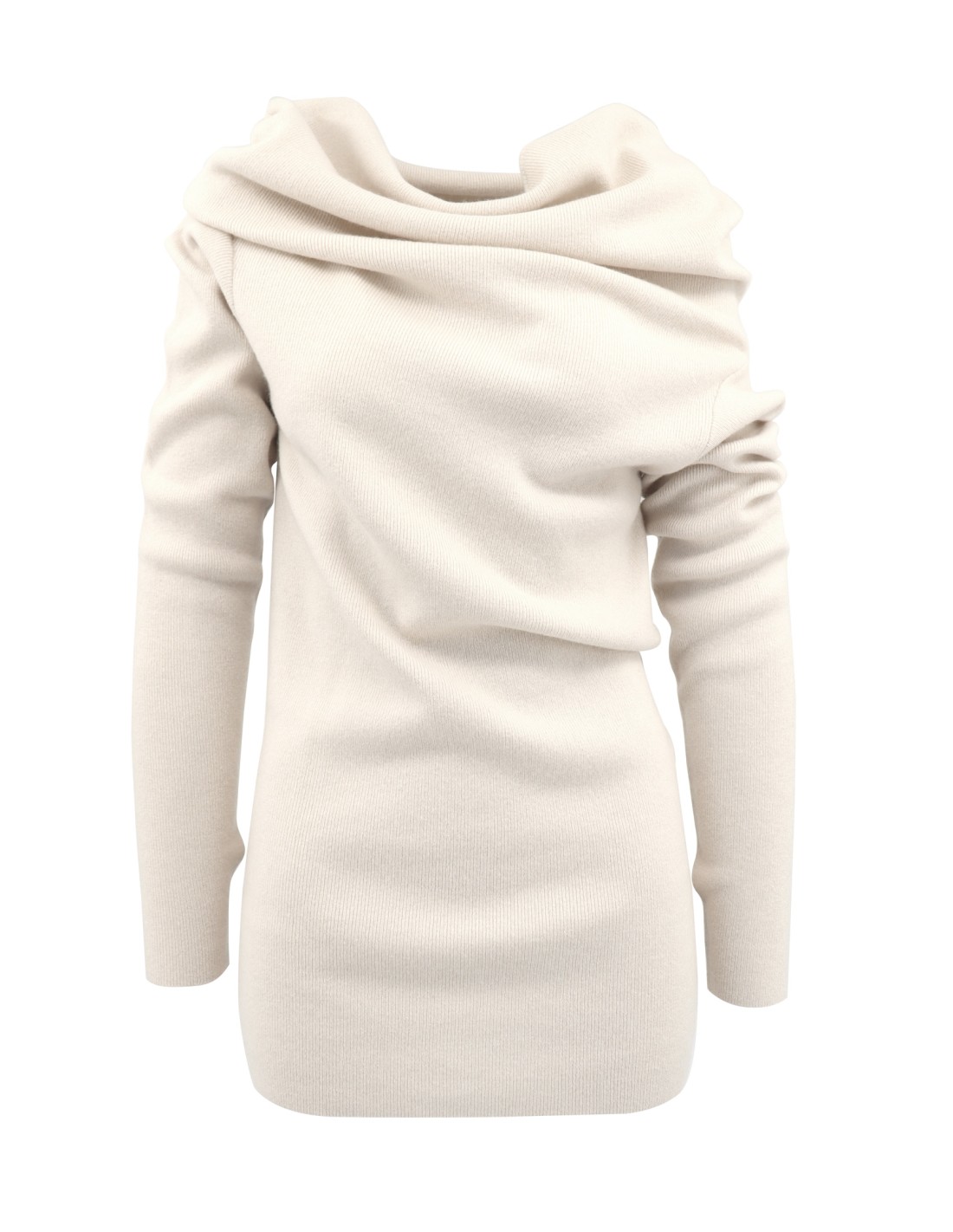 Il collo ampio a ciambella è il suo tratto distintivo: può essere portato in mille modi — sceso sulle spalle, monospalla, o morbido a cascata sul davanti — trasformando ogni volta il capo e l’atmosfera di chi lo indossa.