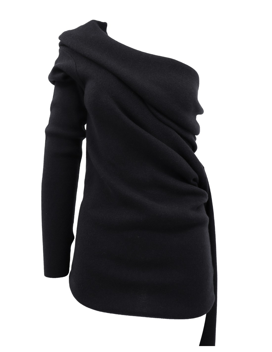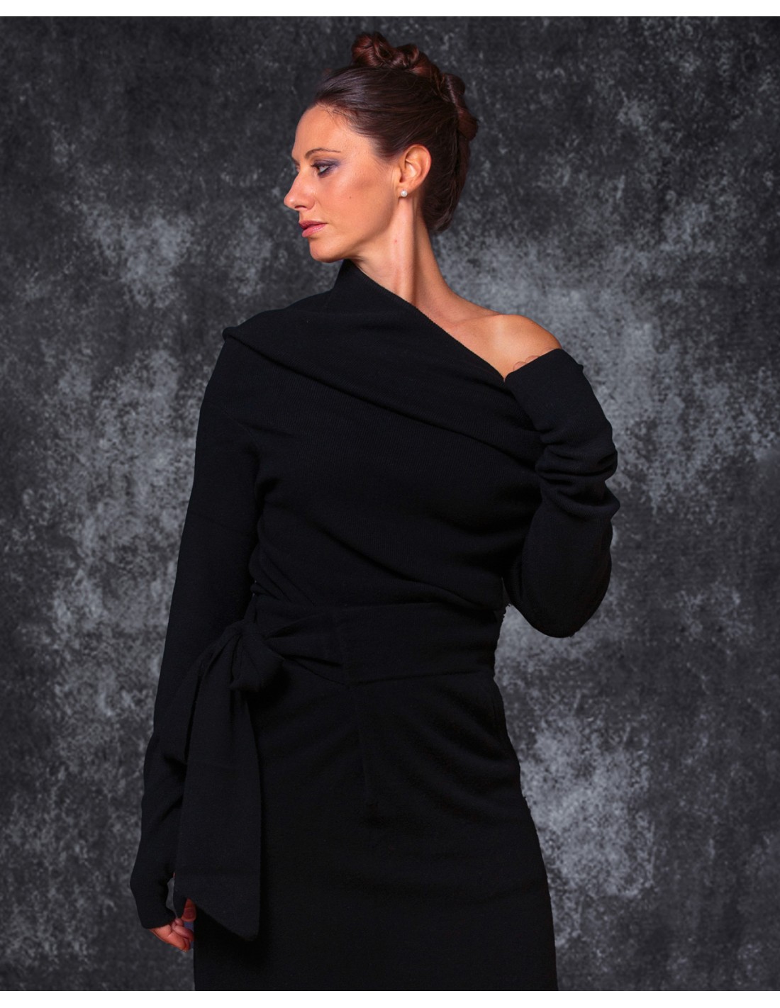 Il collo ampio a ciambella è il suo tratto distintivo: può essere portato in mille modi — sceso sulle spalle, monospalla, o morbido a cascata sul davanti — trasformando ogni volta il capo e l’atmosfera di chi lo indossa.