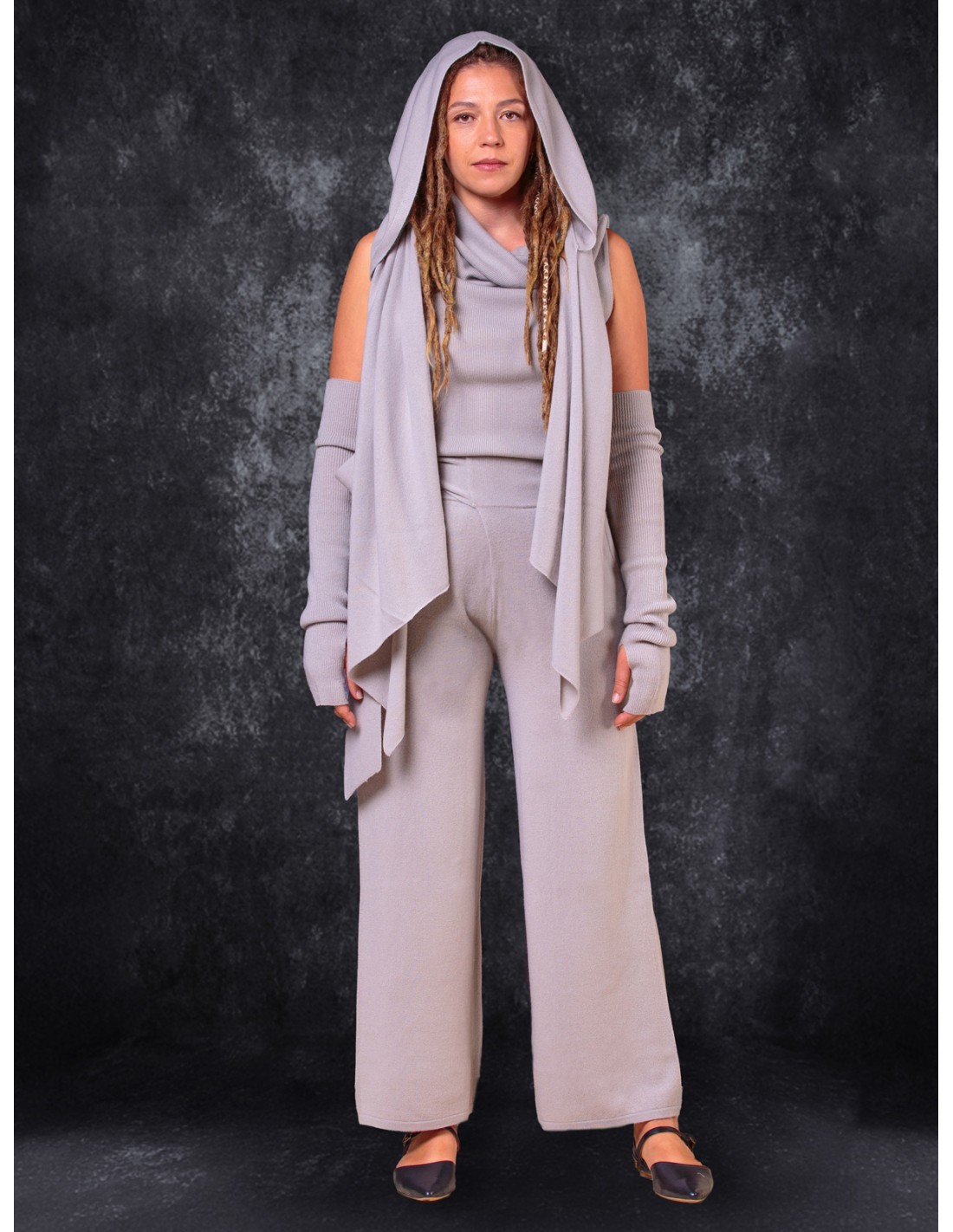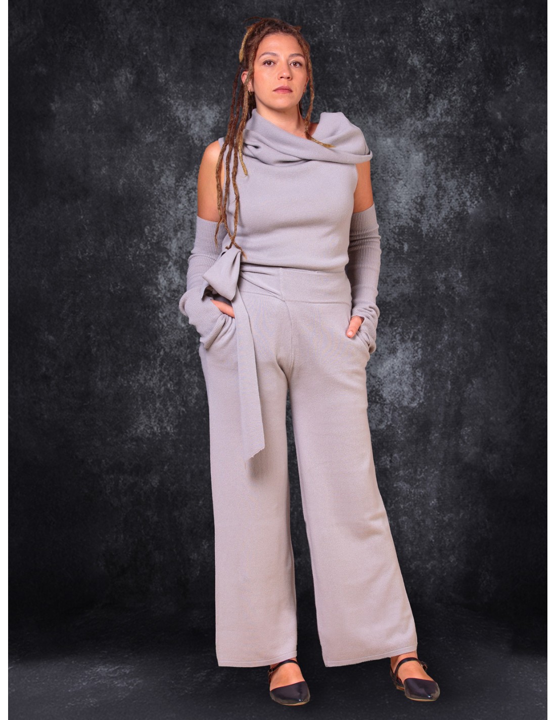 Si abbina perfettamente con la maglia Astral o la smanicata Luna, creando un insieme fluido, avvolgente e contemporaneo.