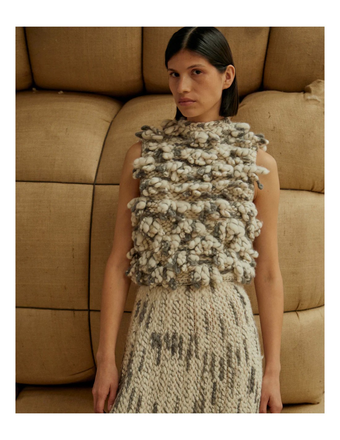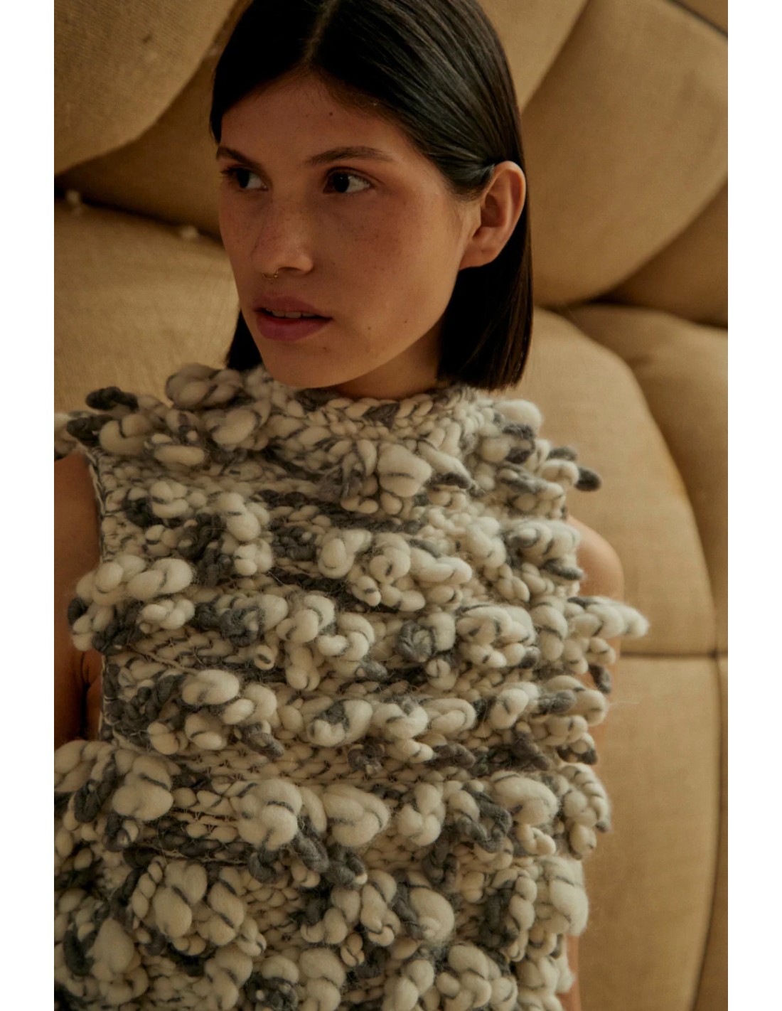 Il Fanny Top è uno di quei pezzi che parlano da soli: un concentrato di creatività, tecnica e design. La sua particolarità è la lavorazione bouclé gigante, una tecnica tradizionale di derivazione artigianale in cui gli anelli del filato vengono lasciati volutamente pronunciati, creando una superficie viva, irregolare e ricchissima di movimento. Un lavoro lento e complesso, possibile solo con filati corposi e mani esperte.