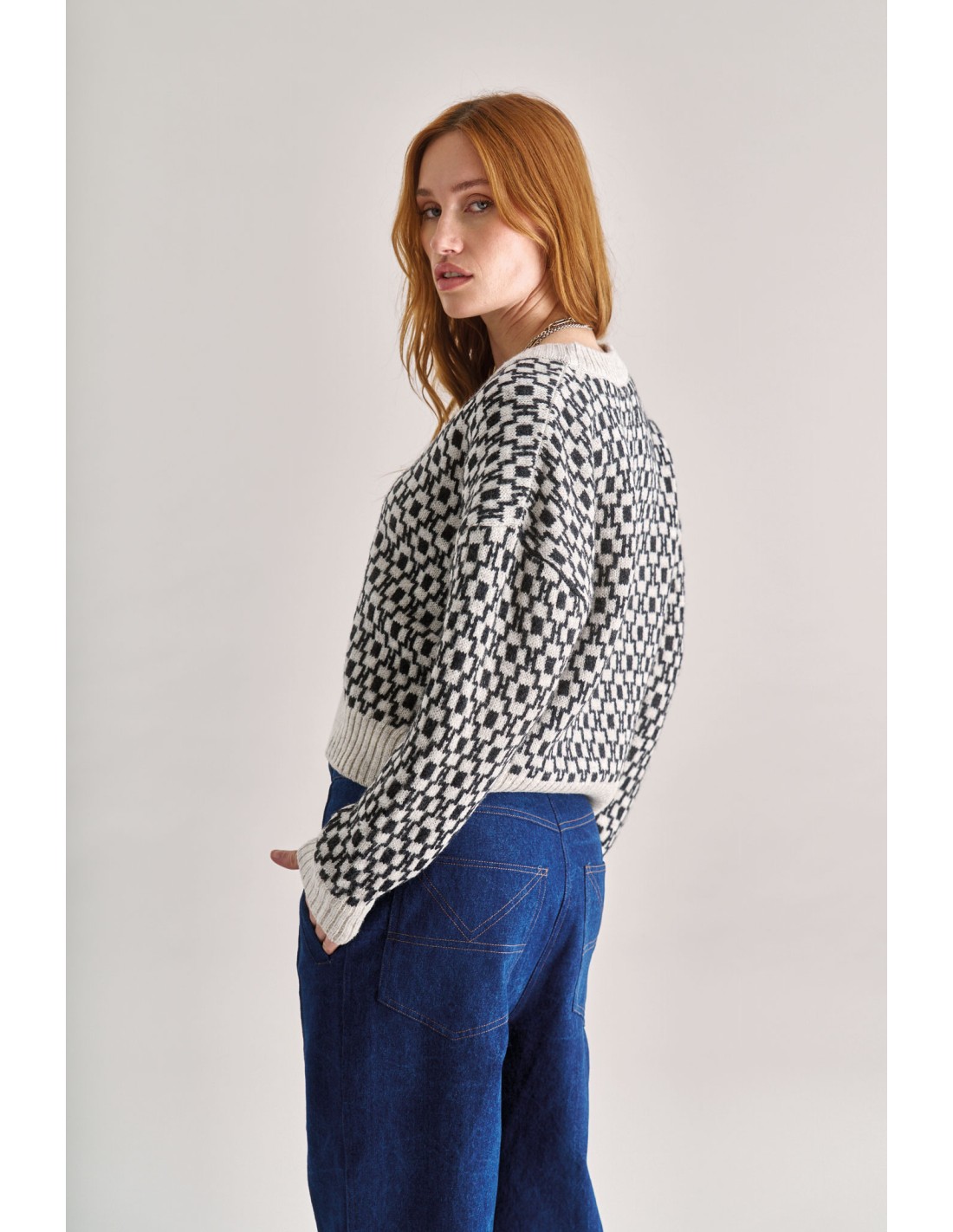 La linea è corta e boxy, moderna e facile da abbinare a pantaloni a vita alta, jeans o gonne morbide. È una maglia che unisce calore, traspirazione e leggerezza: ti tiene al caldo senza farti sudare, grazie alle proprietà naturali della lana.