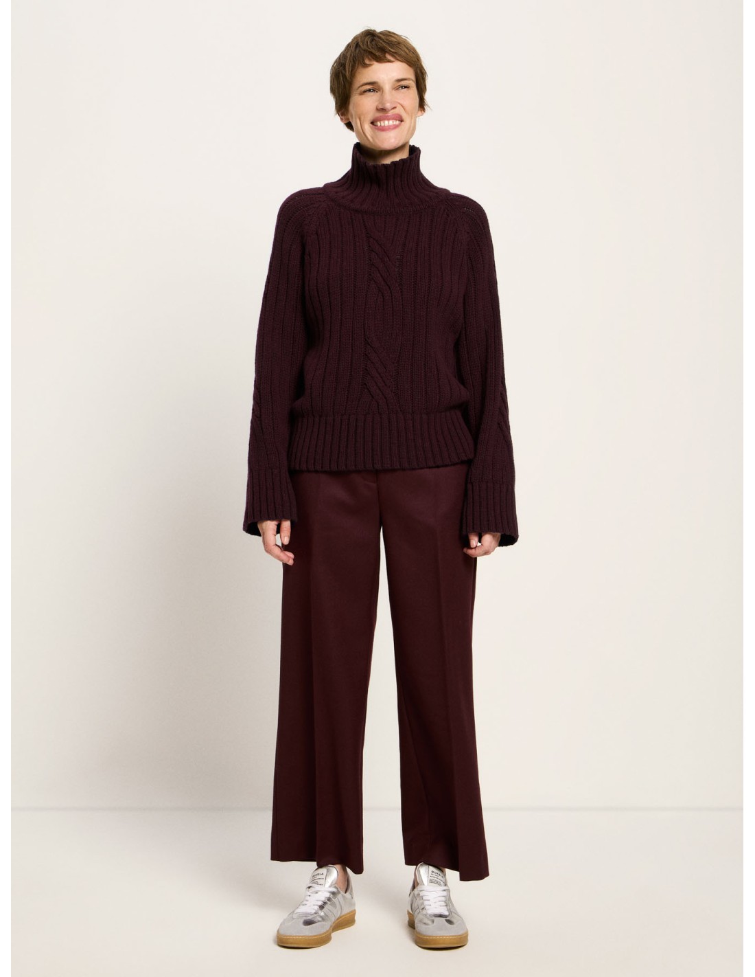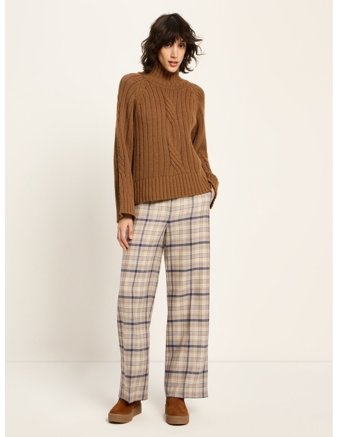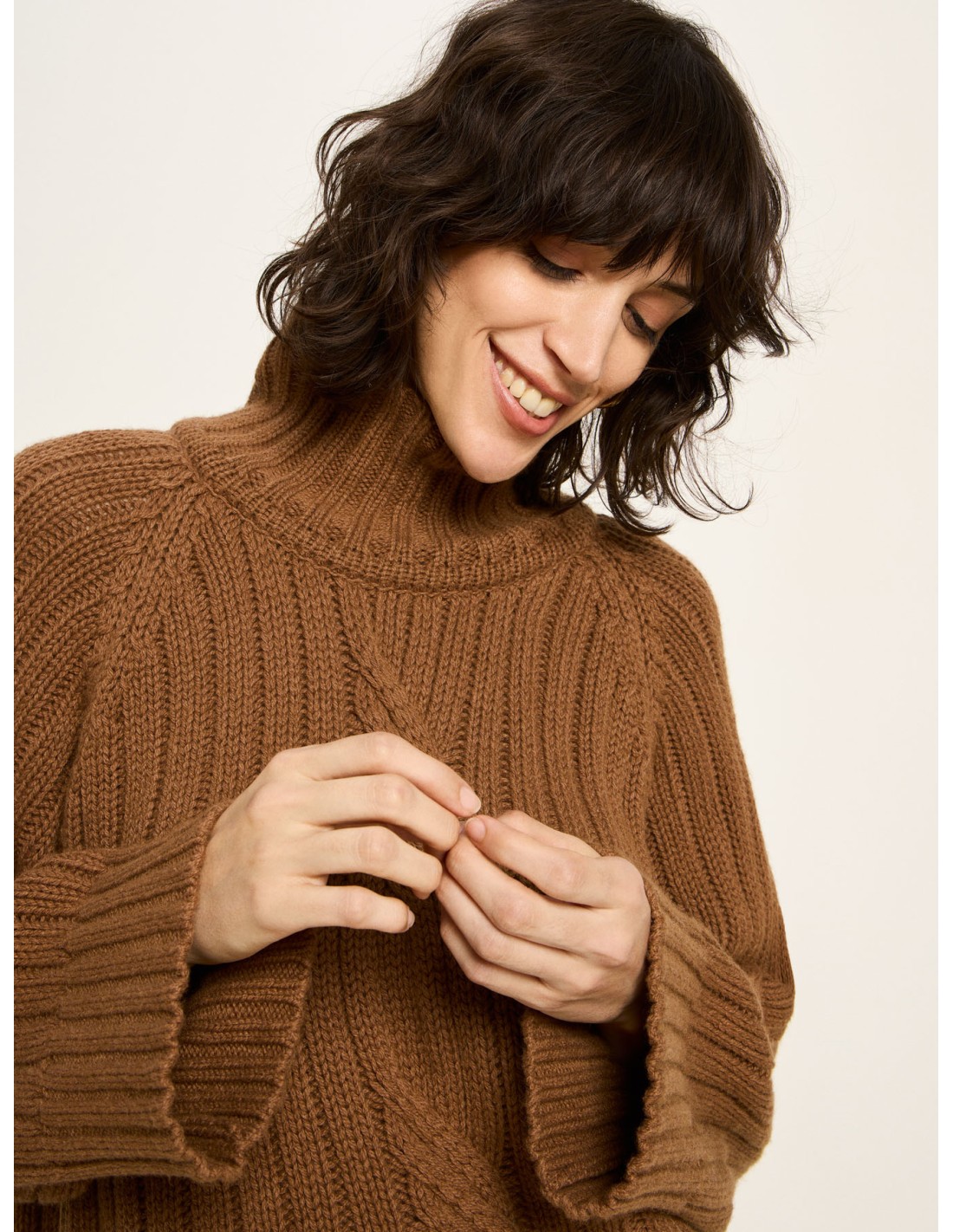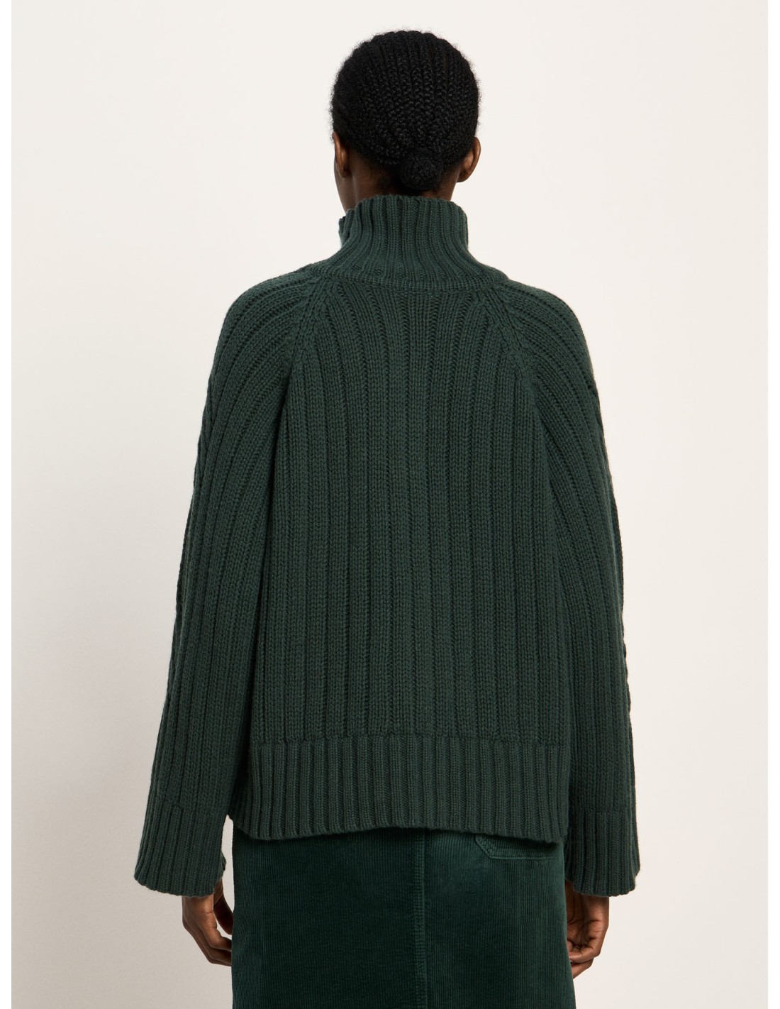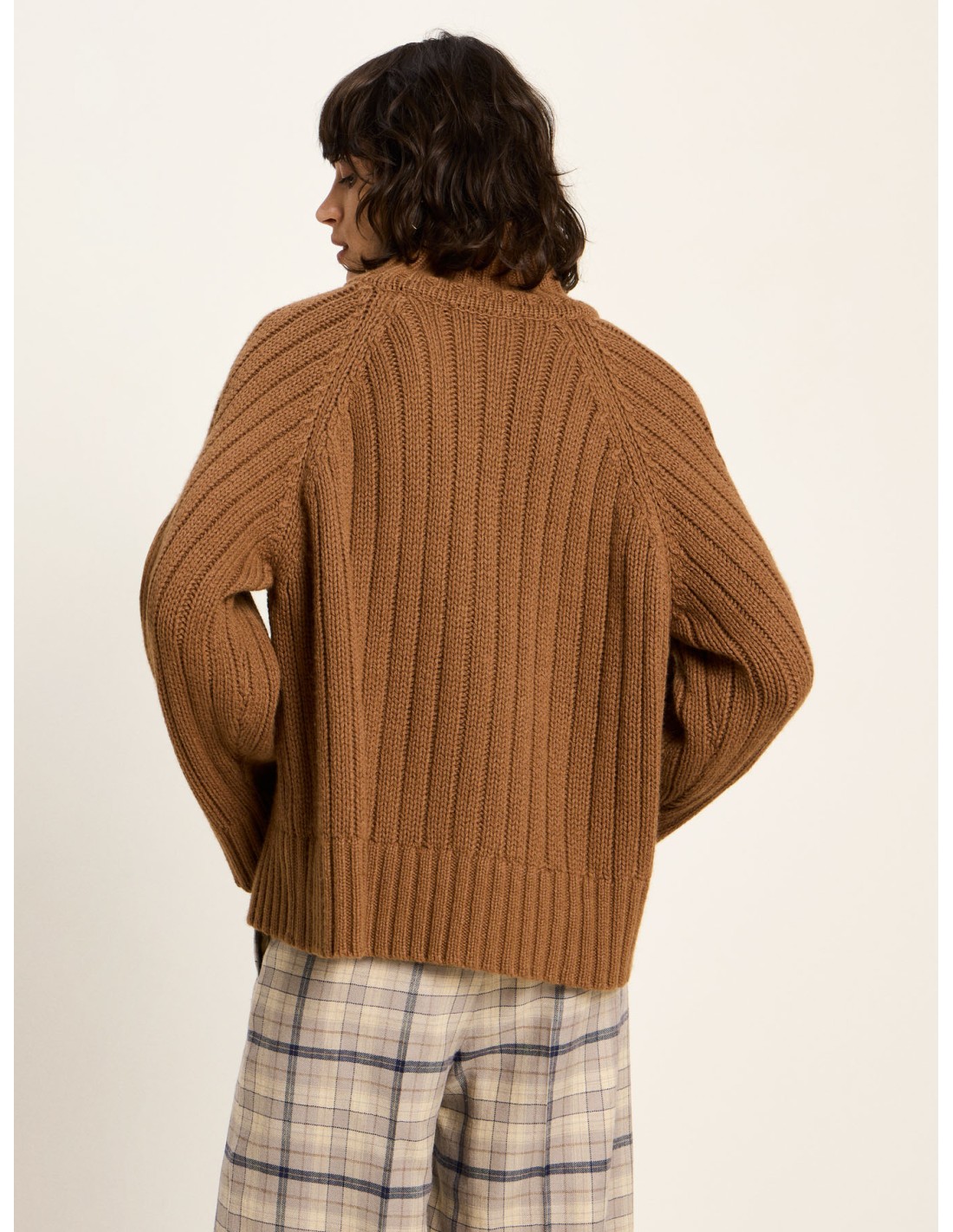 Un maglione che unisce tradizione e modernità: la lavorazione a coste con motivo a treccia richiama la maglieria classica, mentre il taglio oversize, il collo alto e le spalle scese donano un carattere attuale, morbido e rilassato. È quel tipo di capo che avvolge senza appesantire, pensato per offrire comfort, calore e libertà di movimento.