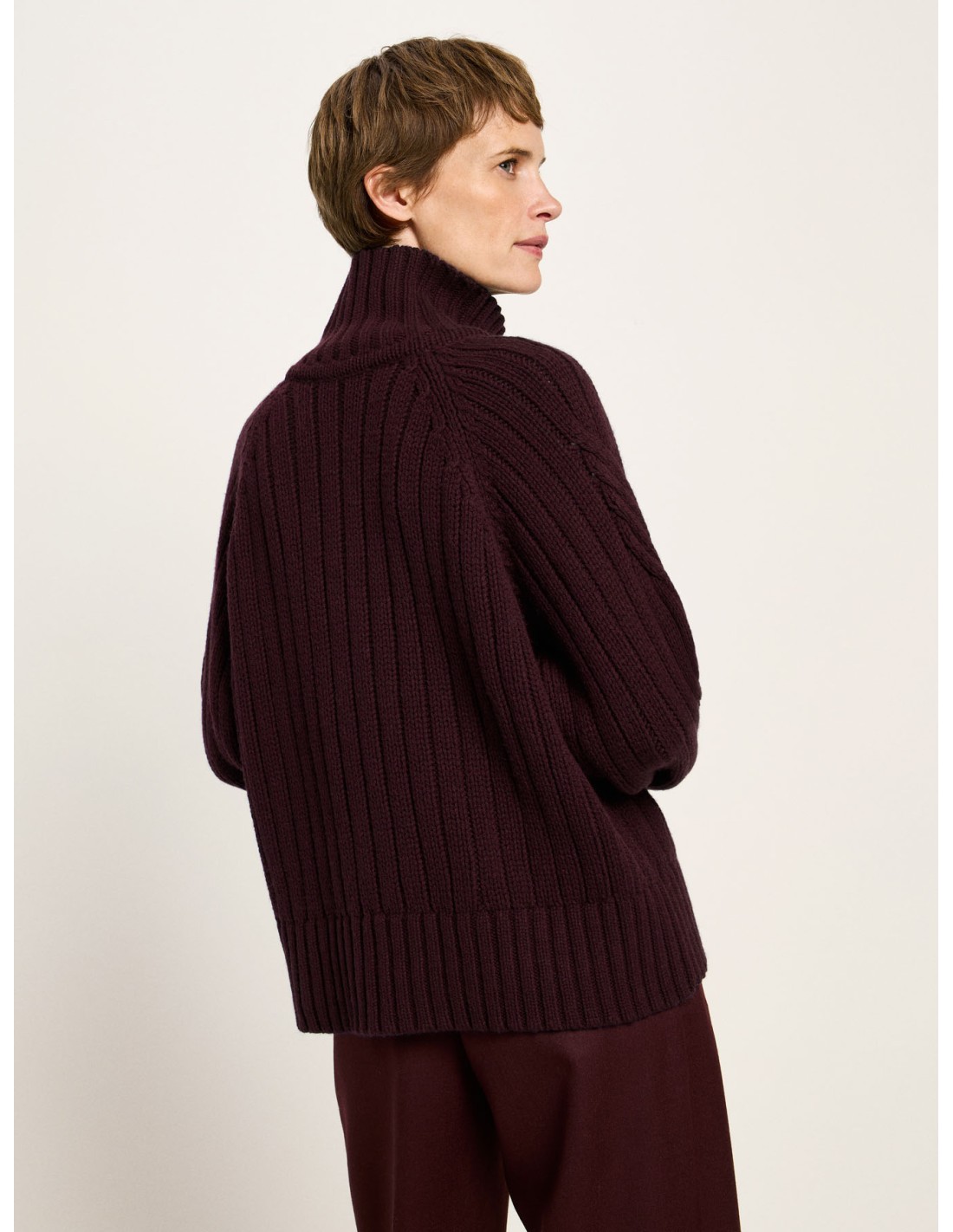 Bellissimo maglione oversize in lana vergine e cotone biologico certificati GOTS. Morbido, caldo e traspirante, con collo alto, spalle scese e lavorazione a coste con motivo a treccia. Un capo accogliente e caldo per look rilassati e contemporanei.