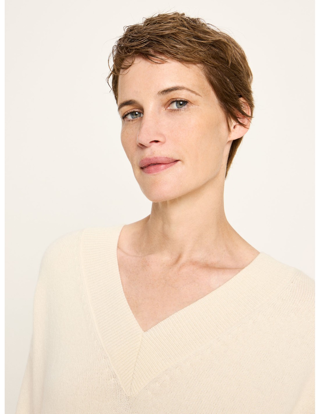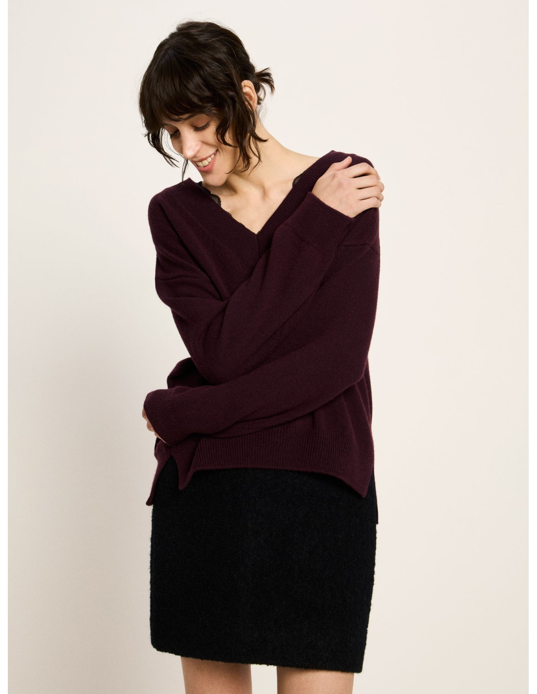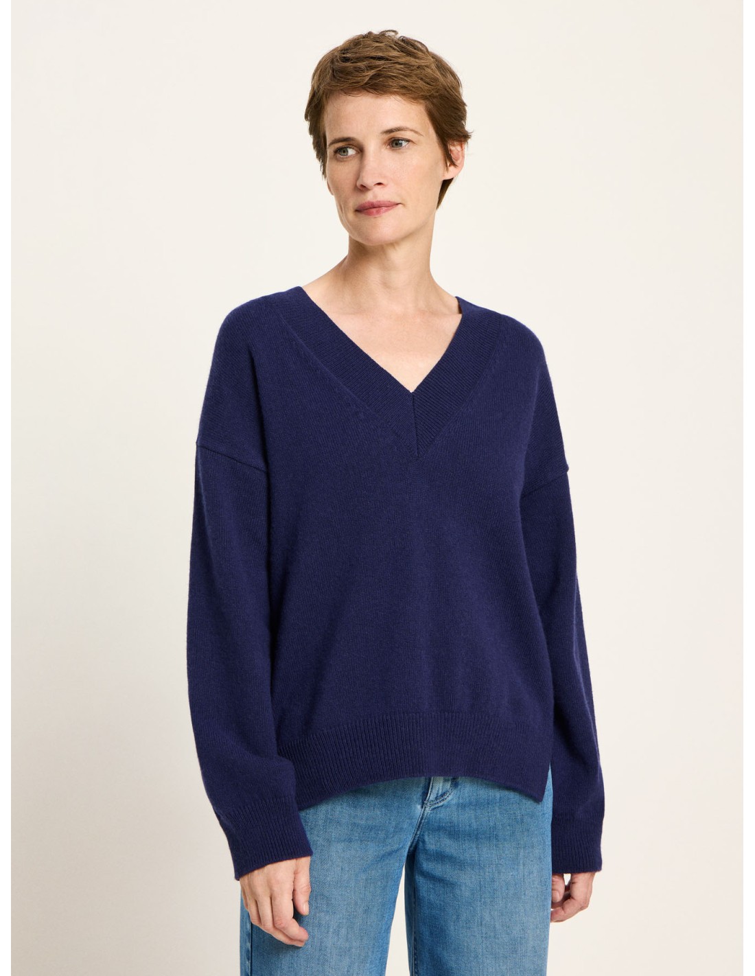 Un maglione essenziale, pensato per accompagnarti ogni giorno in autunno e in inverno. Lo scollo a V profondo dona femminilità e leggerezza, mentre la linea ampia, squadrata e con spalle scese crea un look rilassato ma sempre curato. I polsini e il bordo finemente a coste mantengono la forma e aggiungono un dettaglio armonioso alla struttura del capo.
