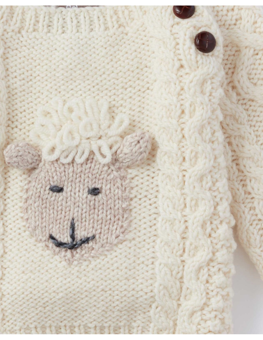 Meraviglioso maglione baby in pura Lana Vergine Irlandese con bottoni in cocco sullo scollo e ricamo con pecorella.