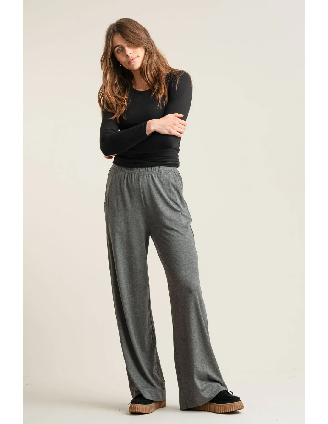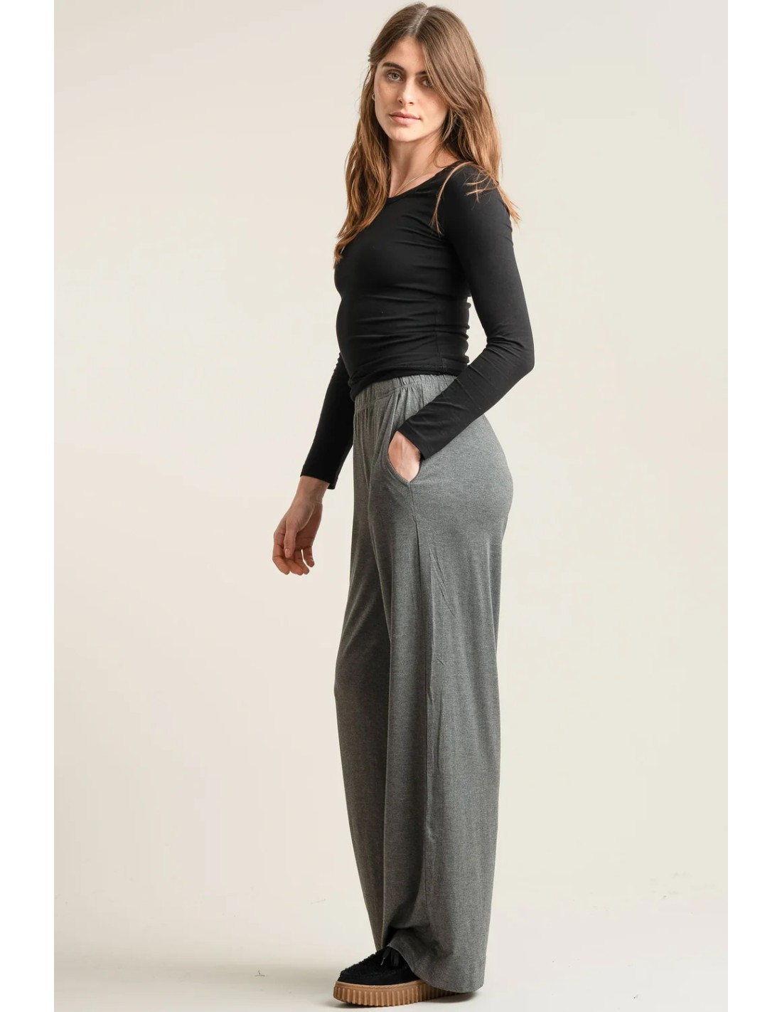 Fluido e morbidissimo pantalone a palazzo ampio e comodo realizzato in Modal dal legno di faggio con elastico in vita e tasche, super comodo e sottile, il tessuto è fresco, morbido ed elasticizzato. Maternity fluid, molto versatile, si presta a stili sportivi ed eleganti.