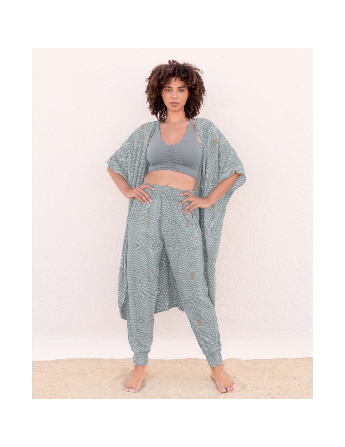 È il pantalone ideale per yoga, meditazione, viaggi, giornate al mare o pomeriggi lenti. Un capo che si adatta ai tuoi ritmi, non il contrario. La stampa allover e la lavorazione artigianale lo rendono unico, con quel carattere vivo che solo un prodotto realizzato con cura può avere.