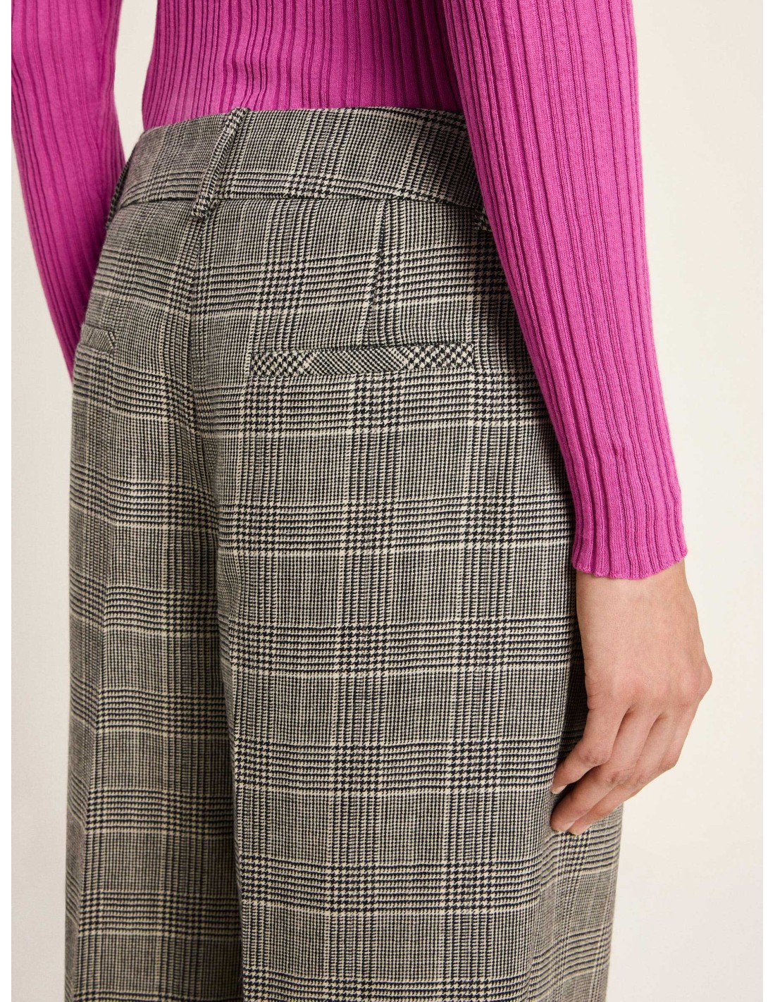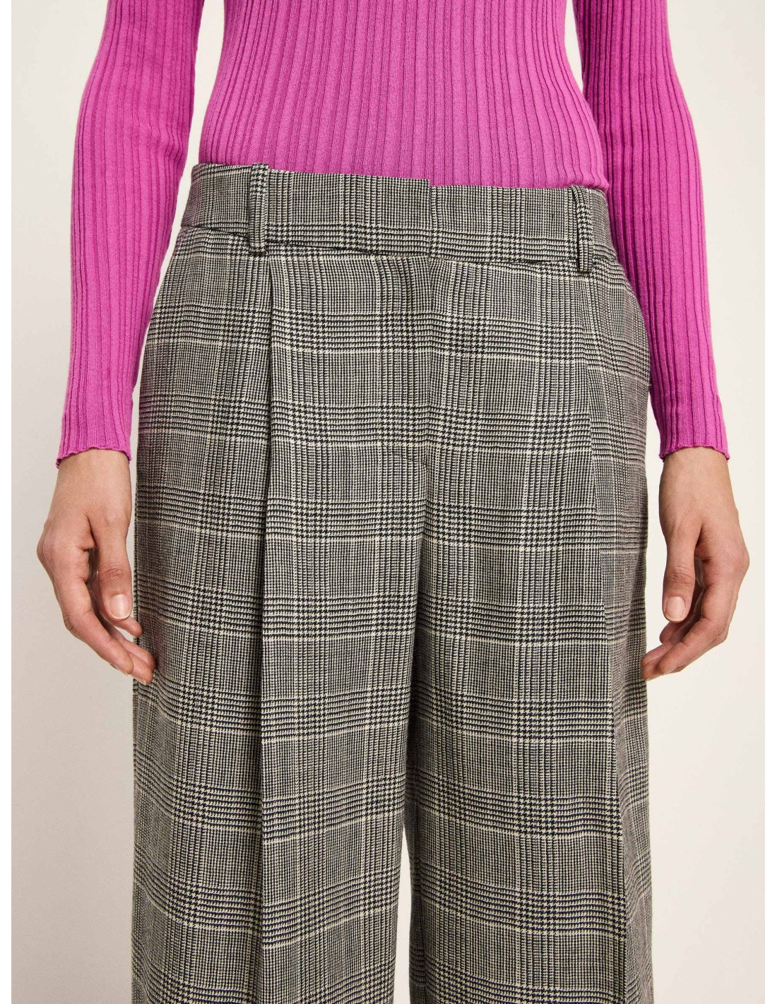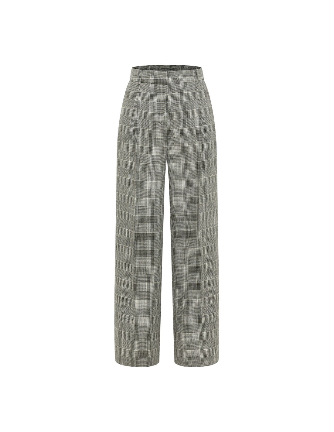 La fantasia a quadri in bianco e nero regala un fascino senza tempo, mentre la linea morbida e fluida con gamba ampia e pince centrali crea una silhouette raffinata ma al contempo rilassata. Un design versatile che si adatta perfettamente sia a look formali da ufficio, abbinati a camicie e blazer, sia a outfit più casual con maglioni e sneakers.
