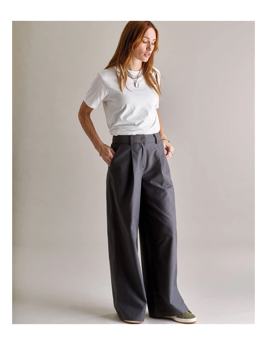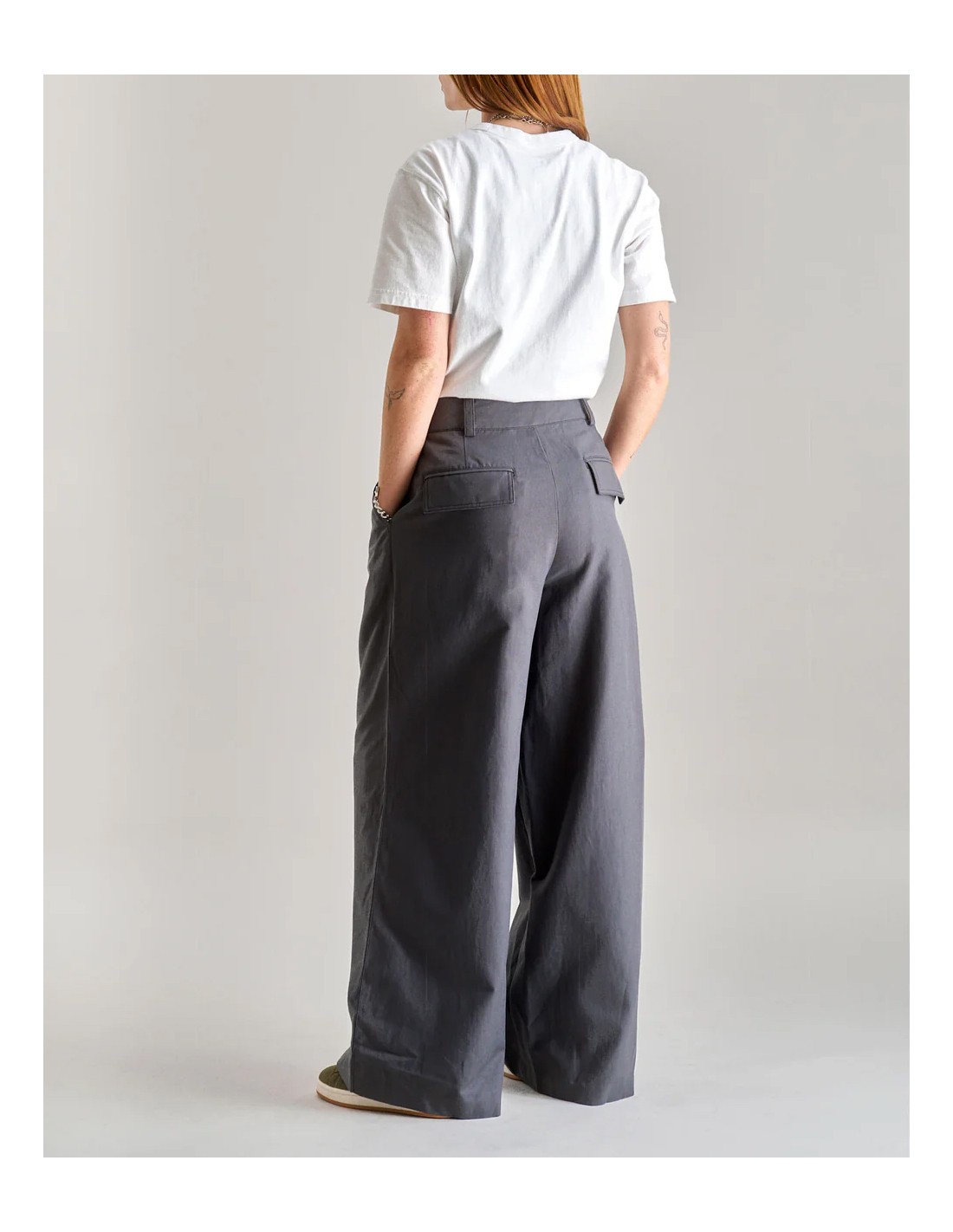 La vita è medio-alta e avvolge bene senza stringere, mentre la gamba ampia e rilassata crea un movimento naturale e una comodità immediata. Le cuciture a contrasto e le tasche posteriori con pattina donano carattere, mentre la chiusura con gancio metallico e zip mantiene un aspetto pulito e rifinito.