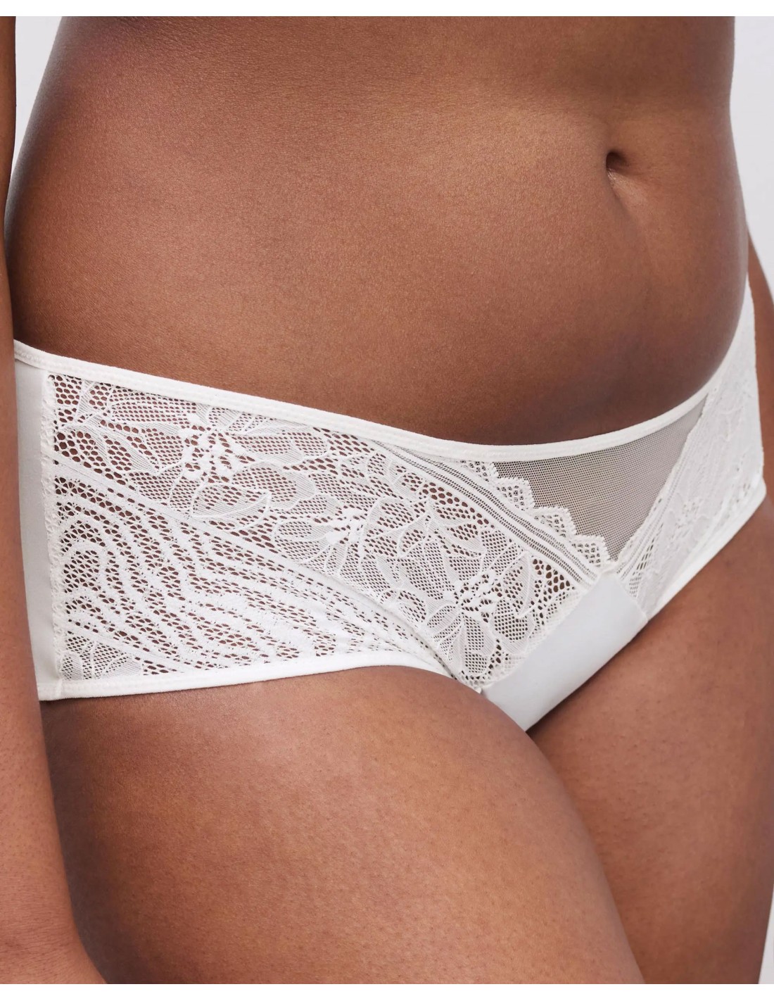 Il pizzo floreale si abbina alla maglia opaca in un gioco equilibrato di trasparenze e copertura. La parte anteriore è leggermente semitrasparente, mentre sul gluteo il tessuto è più coprente e opaco, per garantire sicurezza e comfort in ogni movimento. La copertura dei glutei è classica, studiata per seguire le forme senza stringere né segnare.